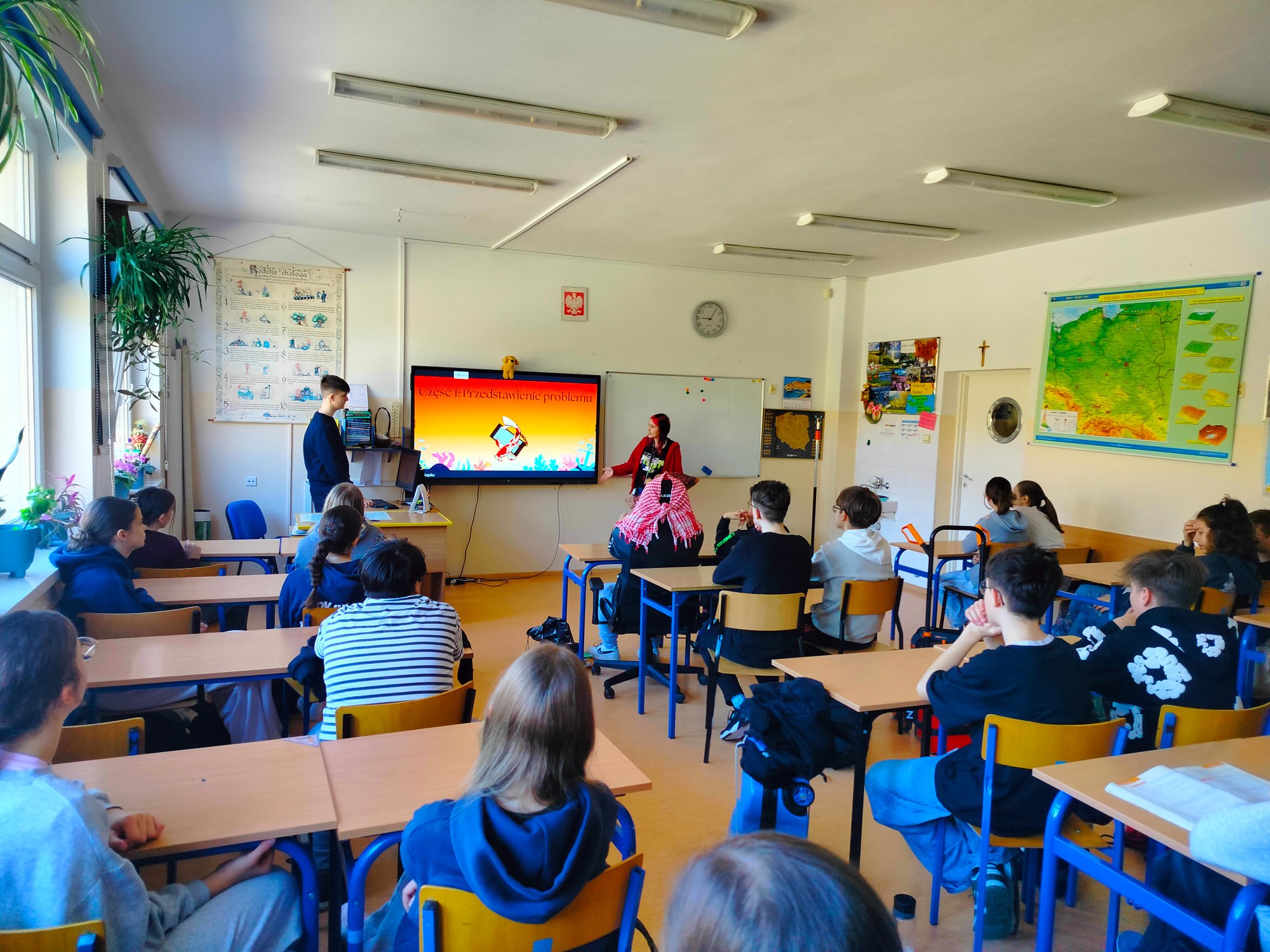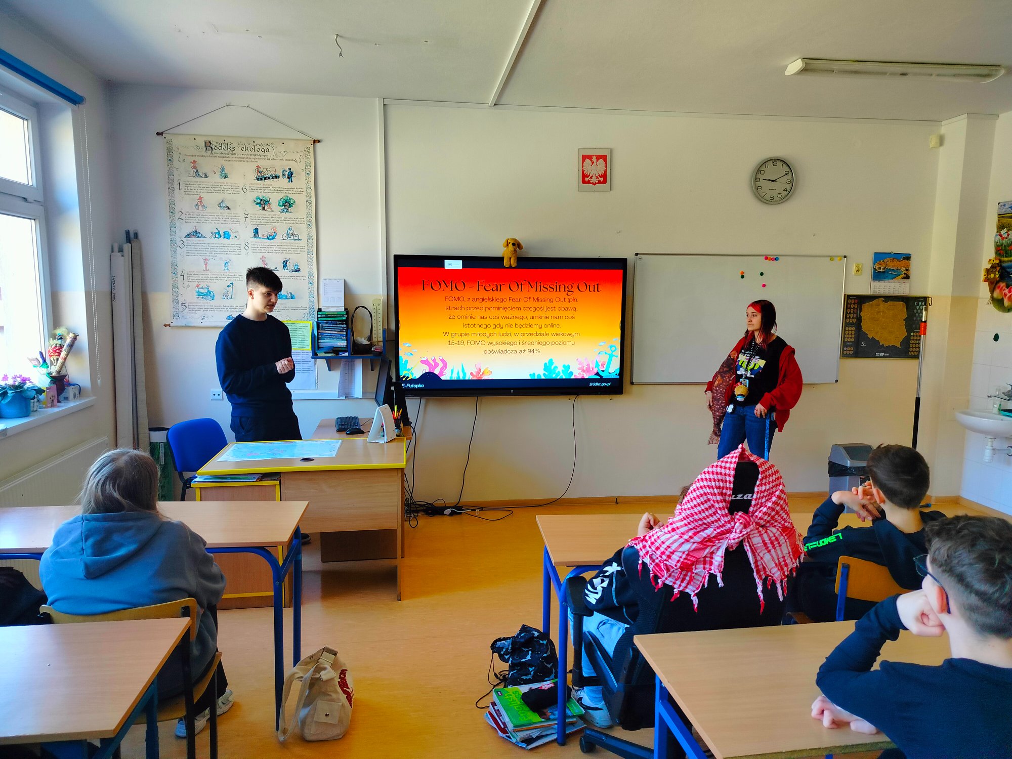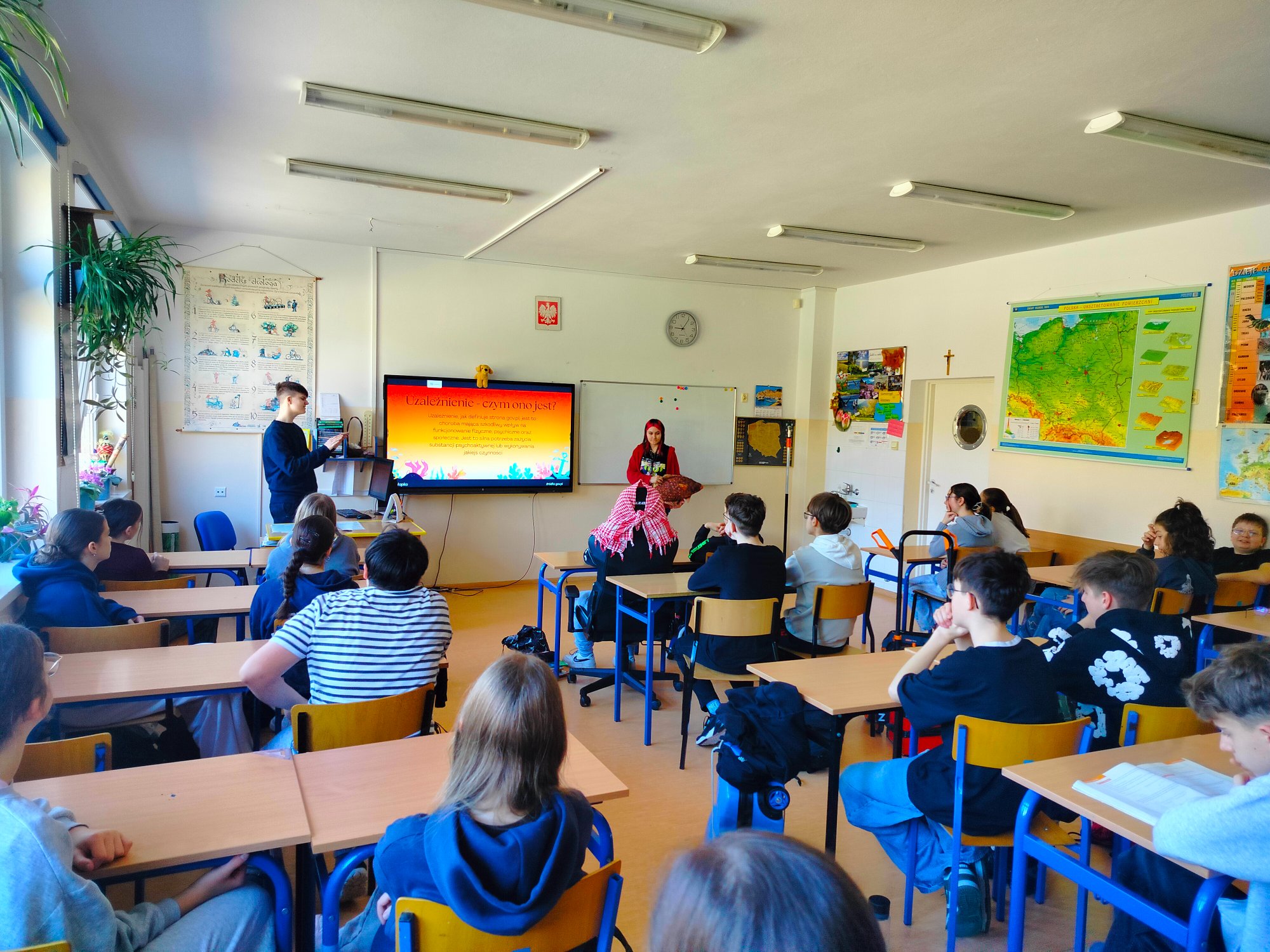 Dnia 28 marca w naszej szkole zrealizowany został projekt edukacyjny przez uczniów Liceum Ogólnokształcącego im. Stanisława Małachowskiego w Płocku. Celem projektu Zespołu E-Pułapki jest nagłośnienie ciągle narastającego problemu, jakim jest uzależnienie od Internetu. Licealiści chcą pomóc tej i kolejnej generacji w uwolnieniu się od „cyfrowego akwarium”. Zajęcia przeprowadzone zostały w klasie 5c, 6c oraz 7b. Uczniowie zapoznani zostali z problemami związanymi z narastającym uzależnieniem od Internetu, m.in.: siecioholizmem, FOMO, cyberbullyngiem, PUI, ADD, czy brainrotem. Dodatkowo przybliżone zostały skutki uzależnienia oraz możliwości wsparcia oraz leczenia.
