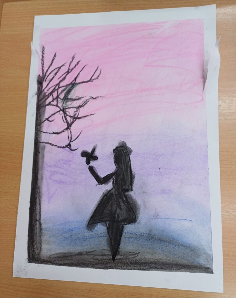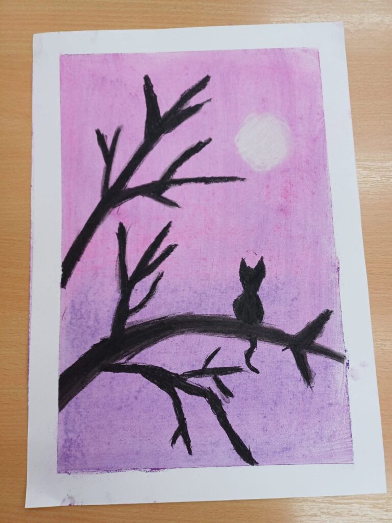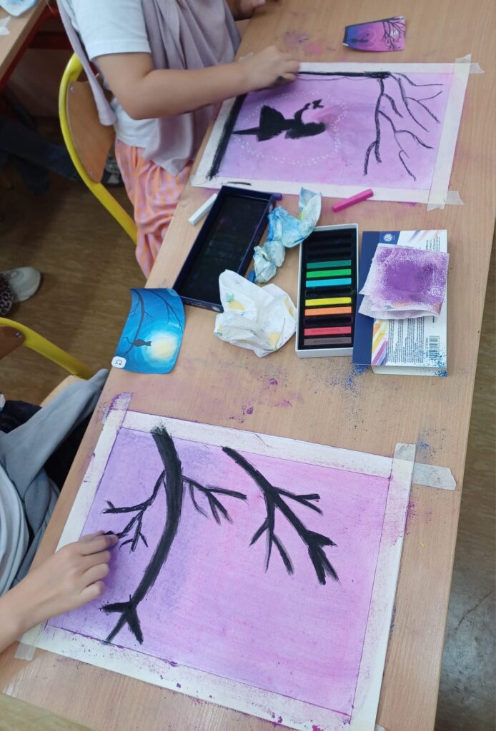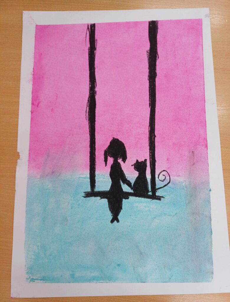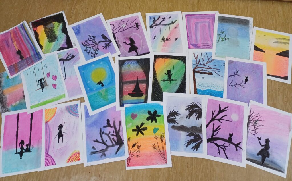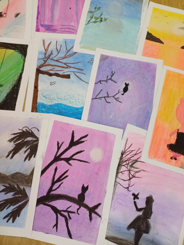 Podczas ostatnich zajęć kółka plastycznego uczniowie rozwijali swoją wyobraźnię i zdolności manualne, tworząc prace pastelami. Uczniowie wykonali małe dzieła, w których na barwnym tle wyraźnie odcinały się czarne kształty postaci, zwierząt i przedmiotów. Kontrast ten nadał rysunkom wyrazistości i wyjątkowego nastroju. Suche pastele pozwoliły na delikatne przejścia kolorystyczne, a odważne zestawienia barw dodały pracom ekspresji.