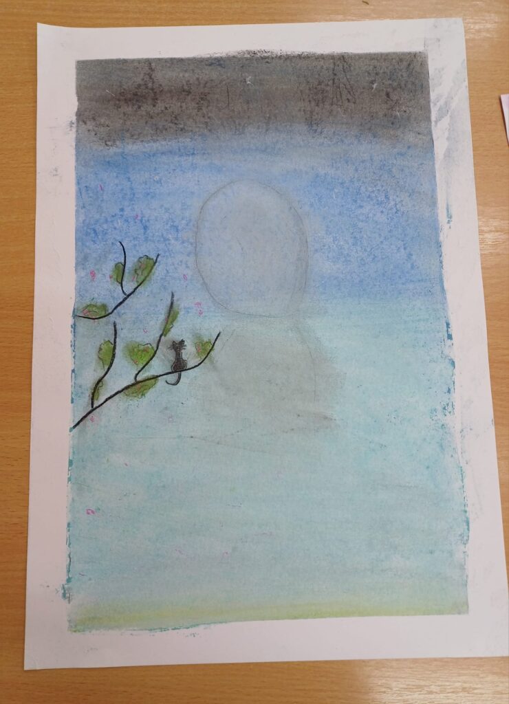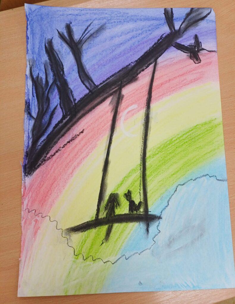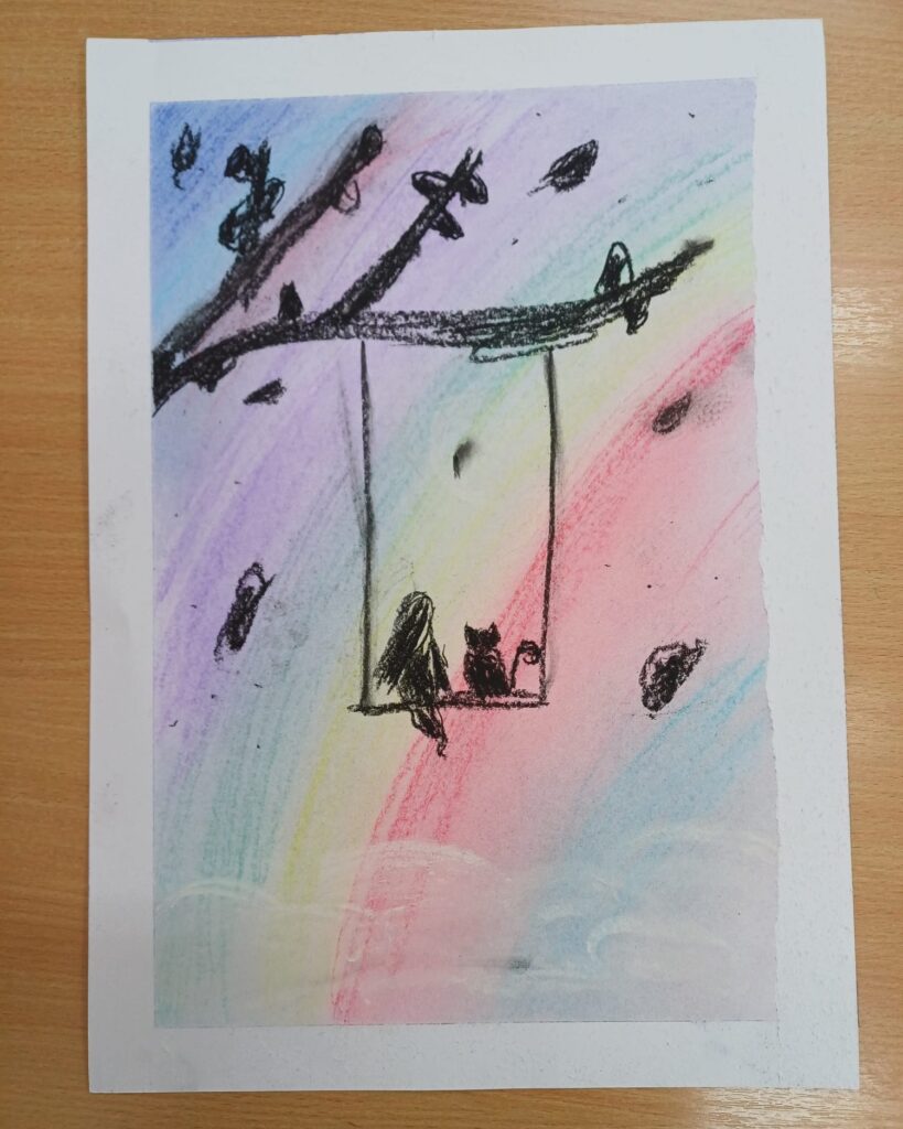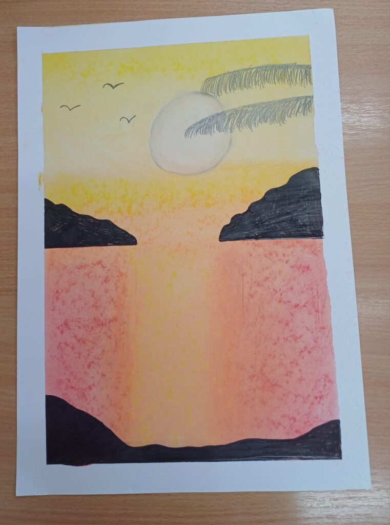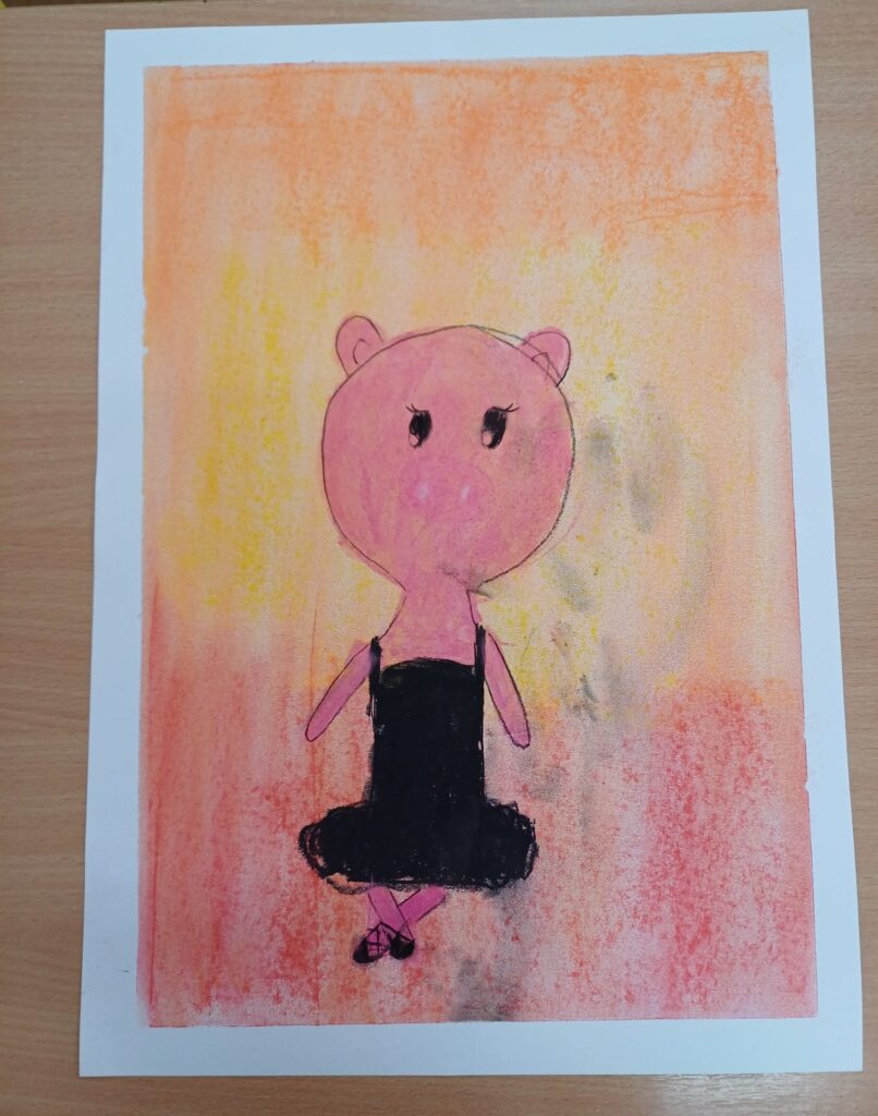 Podczas ostatnich zajęć kółka plastycznego uczniowie rozwijali swoją wyobraźnię i zdolności manualne, tworząc prace pastelami. Uczniowie wykonali małe dzieła, w których na barwnym tle wyraźnie odcinały się czarne kształty postaci, zwierząt i przedmiotów. Kontrast ten nadał rysunkom wyrazistości i wyjątkowego nastroju. Suche pastele pozwoliły na delikatne przejścia kolorystyczne, a odważne zestawienia barw dodały pracom ekspresji.