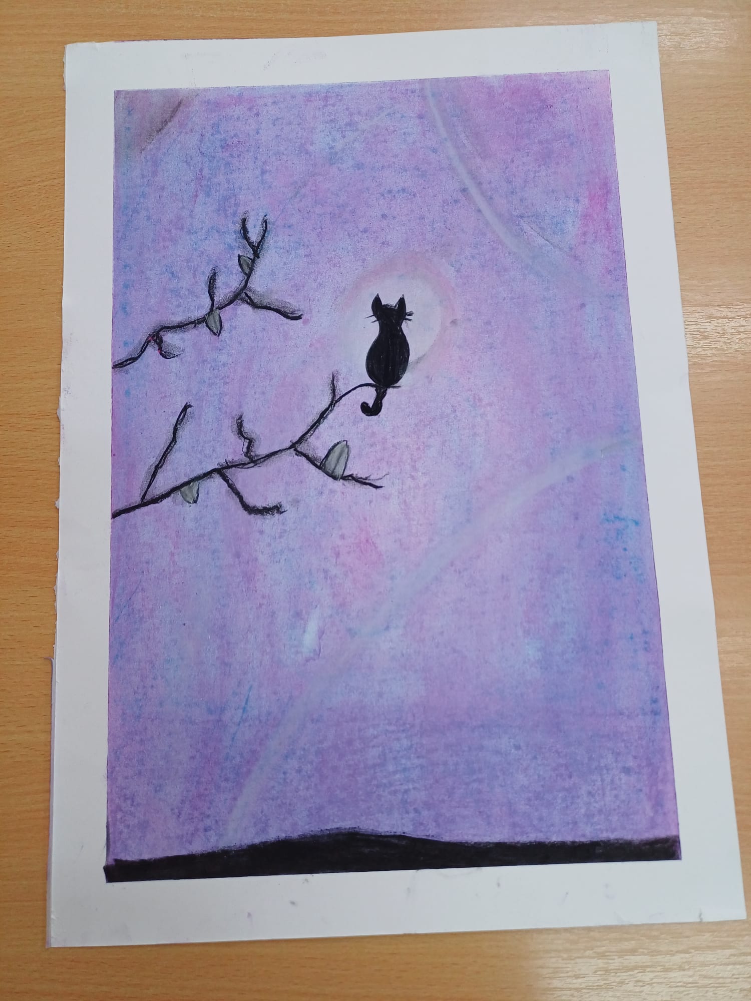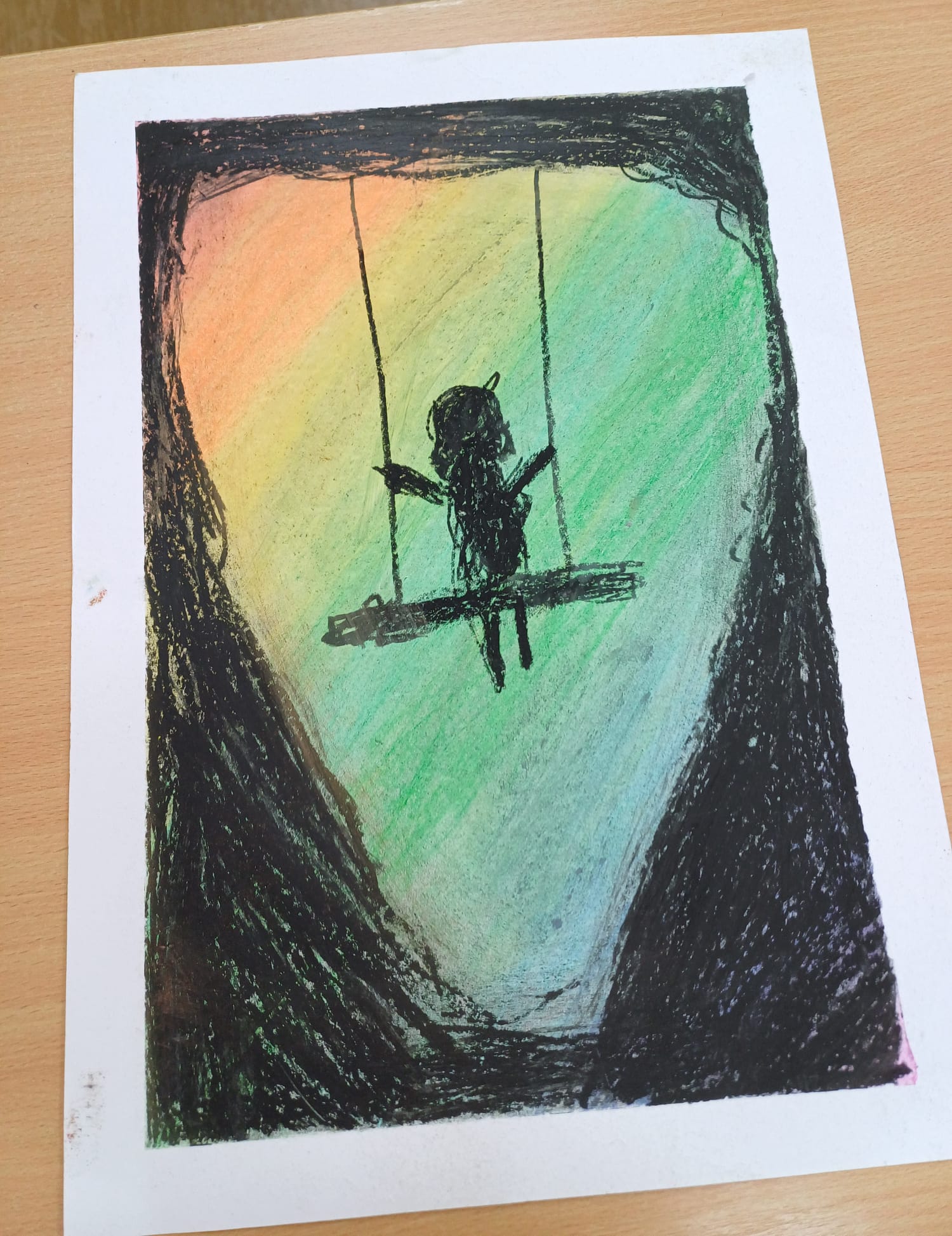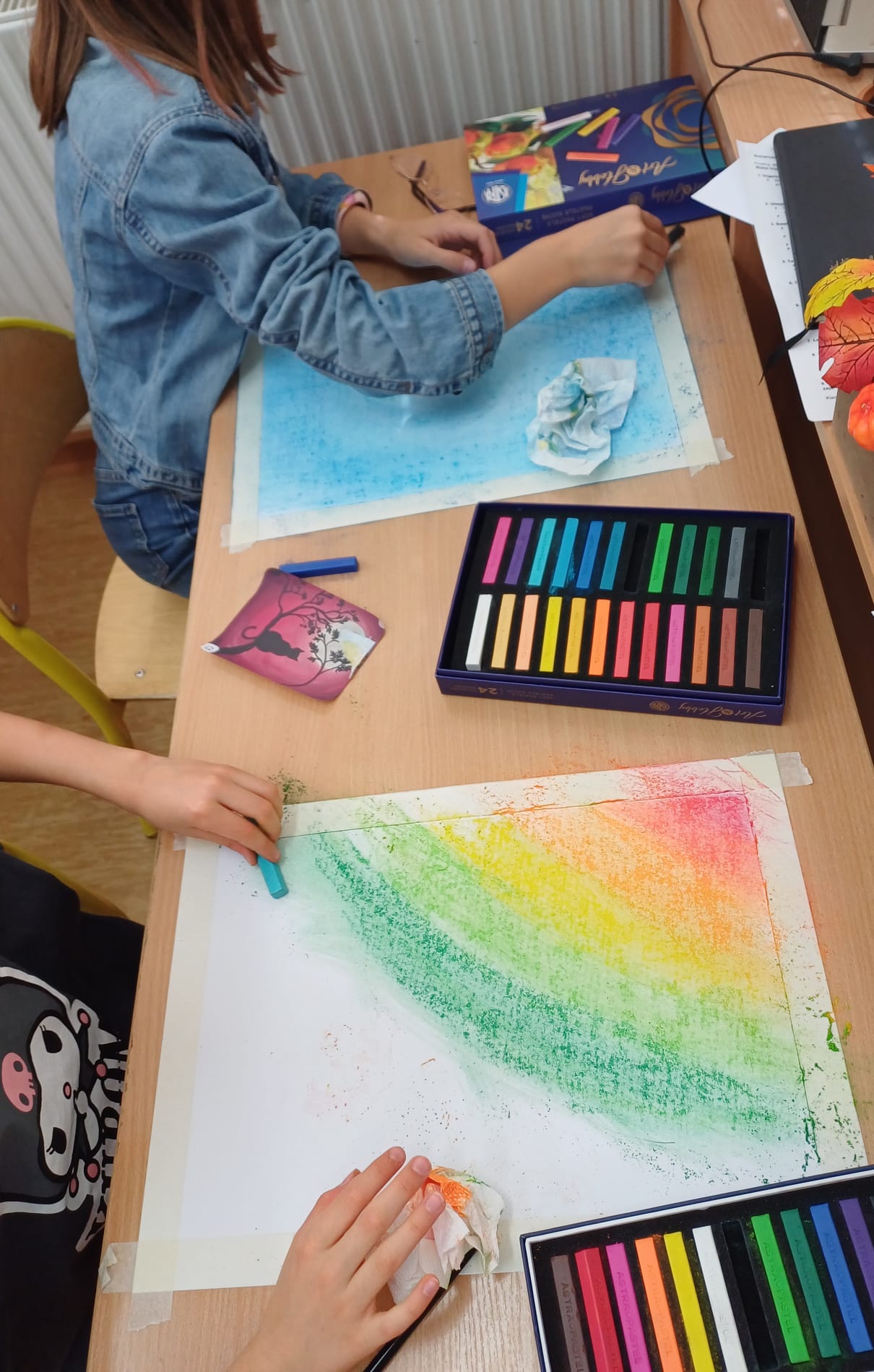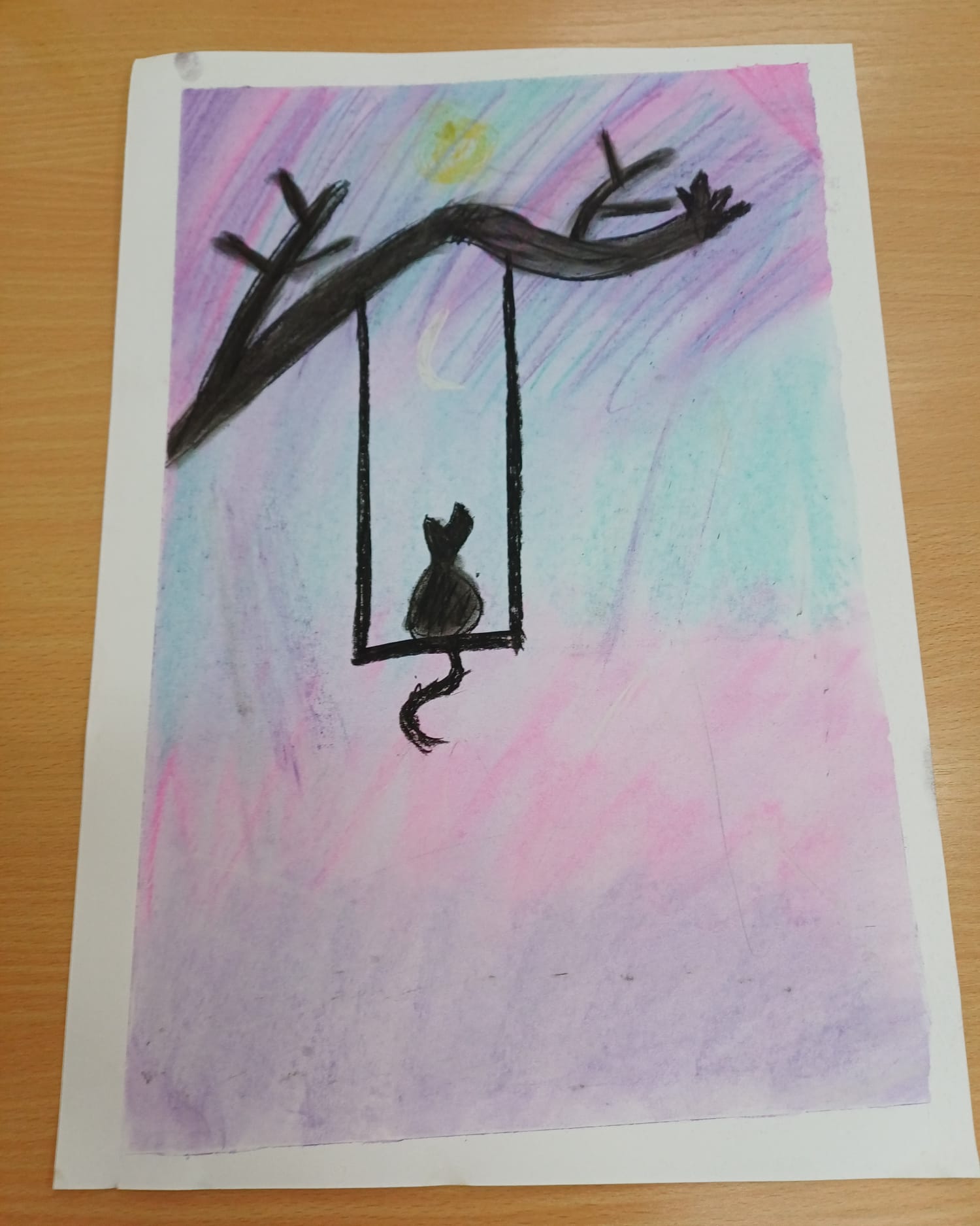Podczas ostatnich zajęć kółka plastycznego uczniowie rozwijali swoją wyobraźnię i zdolności manualne, tworząc prace pastelami. Uczniowie wykonali małe dzieła, w których na barwnym tle wyraźnie odcinały się czarne kształty postaci, zwierząt i przedmiotów. Kontrast ten nadał rysunkom wyrazistości i wyjątkowego nastroju. Suche pastele pozwoliły na delikatne przejścia kolorystyczne, a odważne zestawienia barw dodały pracom ekspresji.