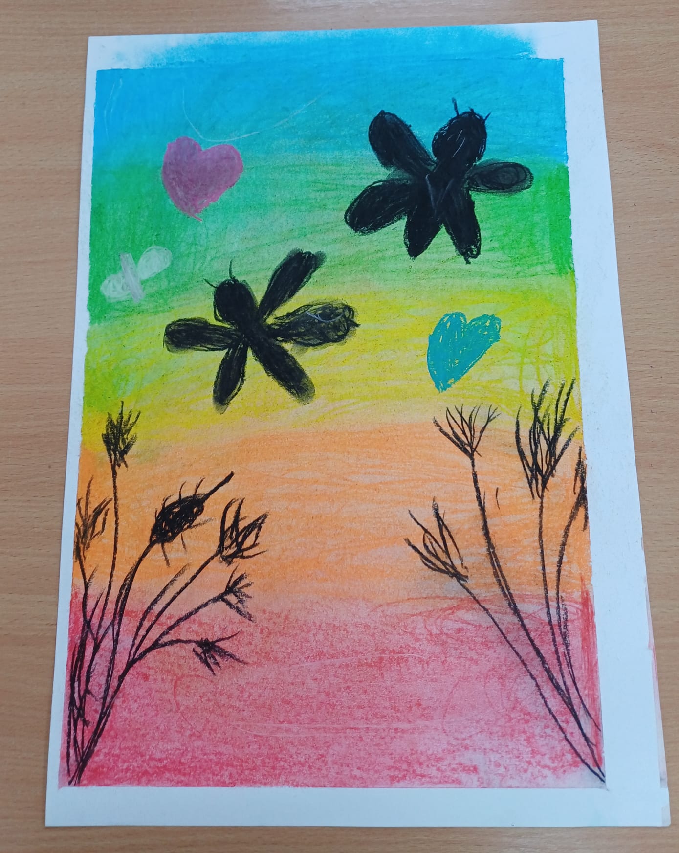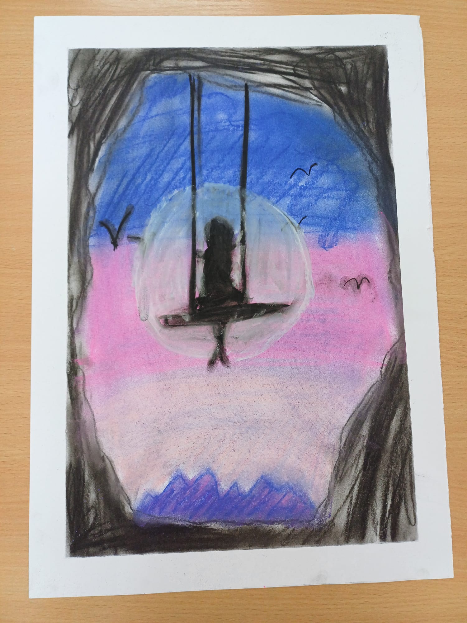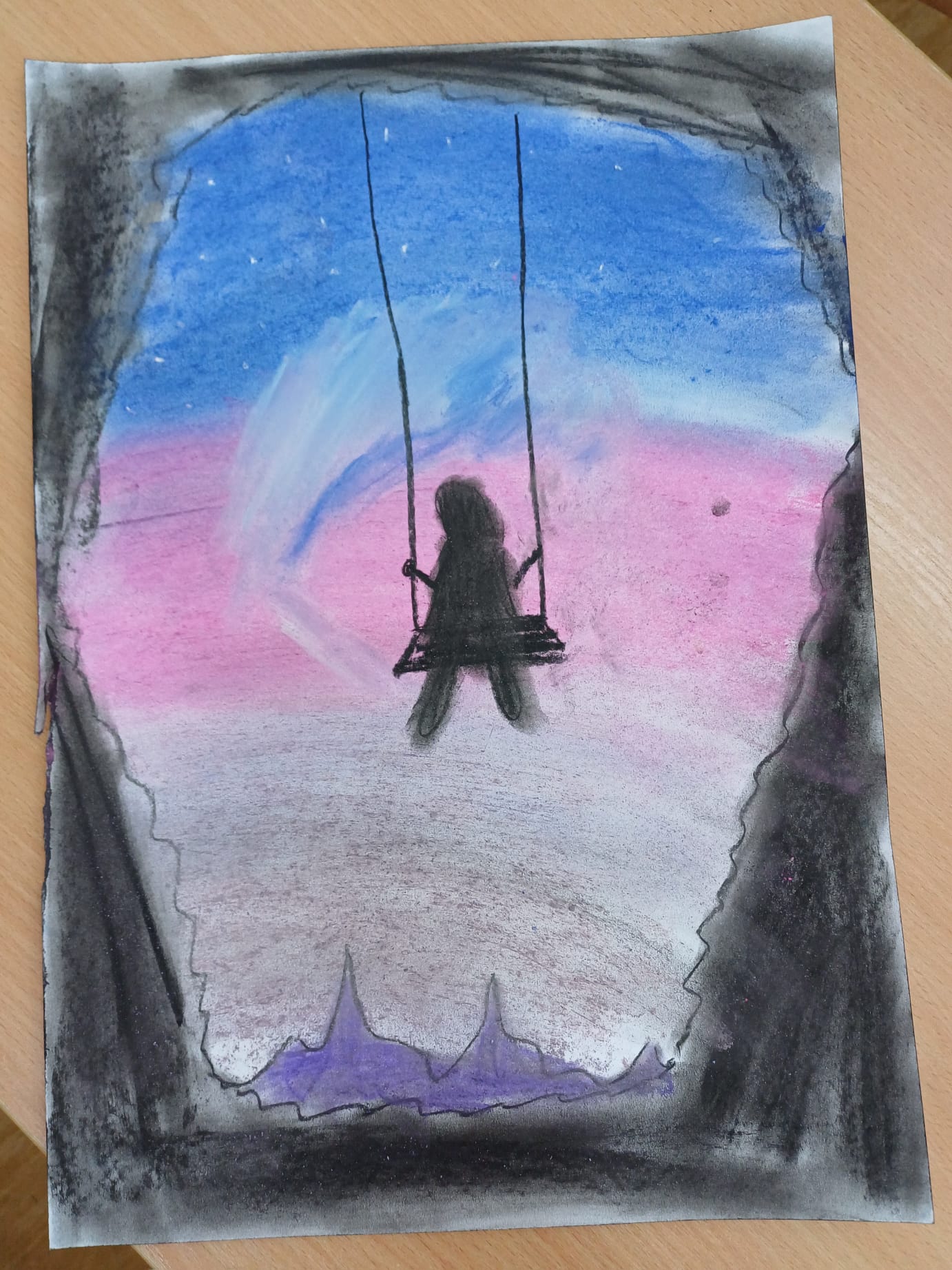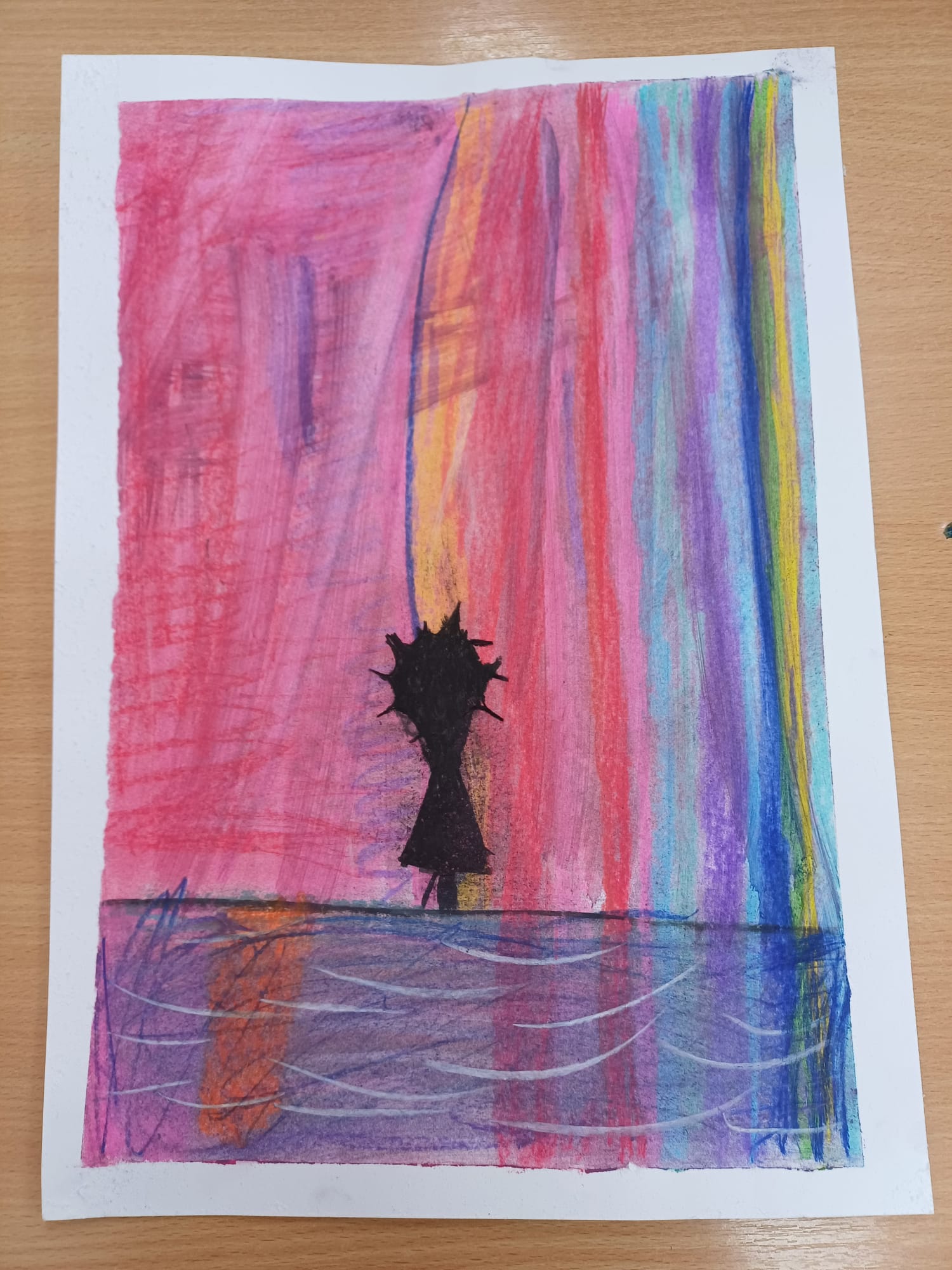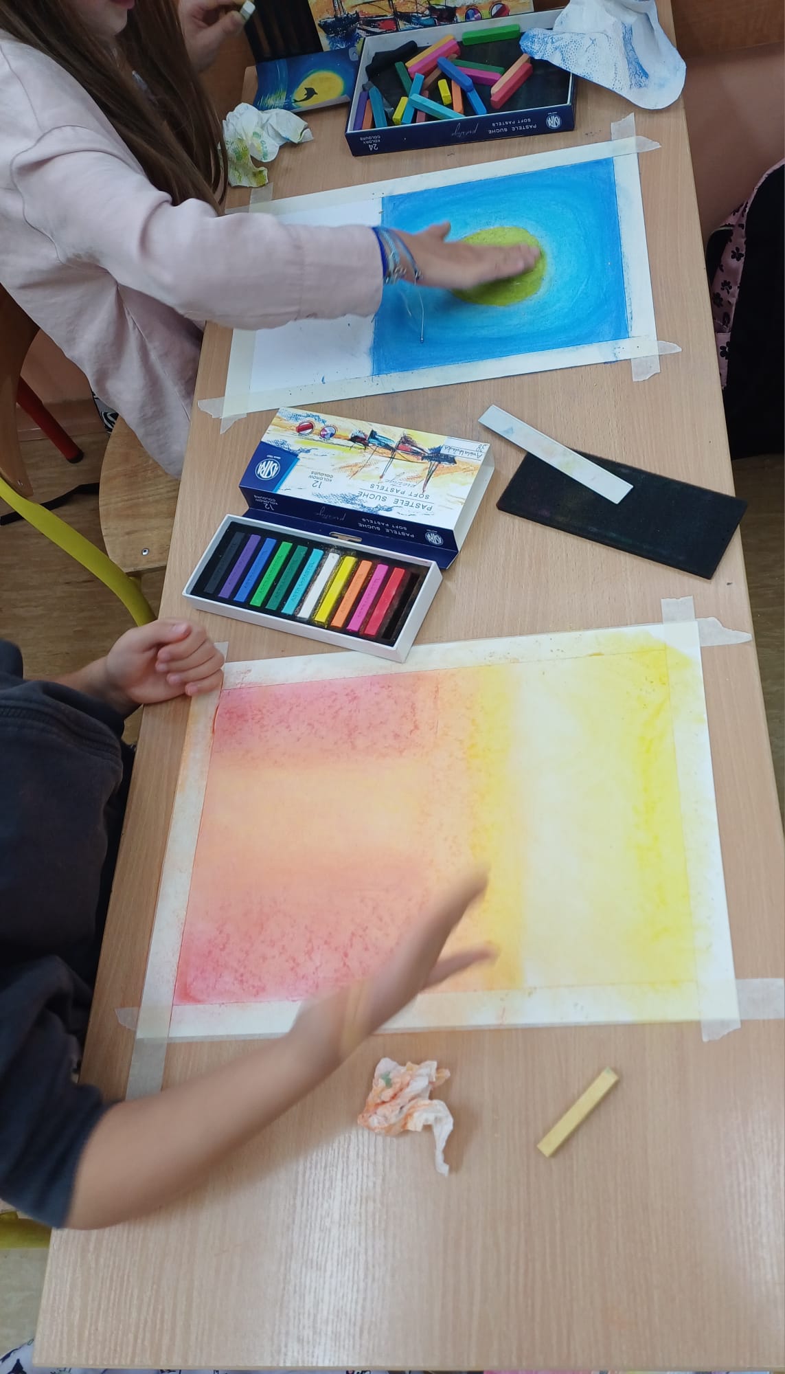 Podczas ostatnich zajęć kółka plastycznego uczniowie rozwijali swoją wyobraźnię i zdolności manualne, tworząc prace pastelami. Uczniowie wykonali małe dzieła, w których na barwnym tle wyraźnie odcinały się czarne kształty postaci, zwierząt i przedmiotów. Kontrast ten nadał rysunkom wyrazistości i wyjątkowego nastroju. Suche pastele pozwoliły na delikatne przejścia kolorystyczne, a odważne zestawienia barw dodały pracom ekspresji.