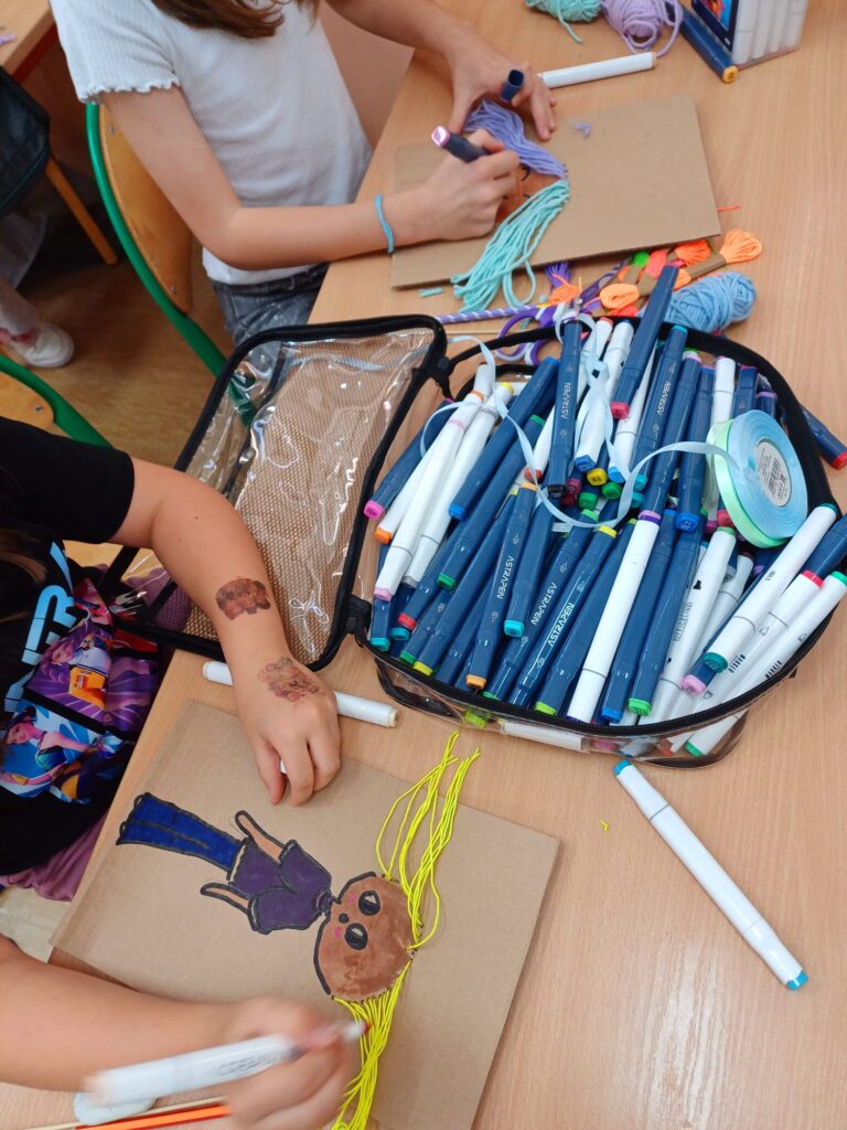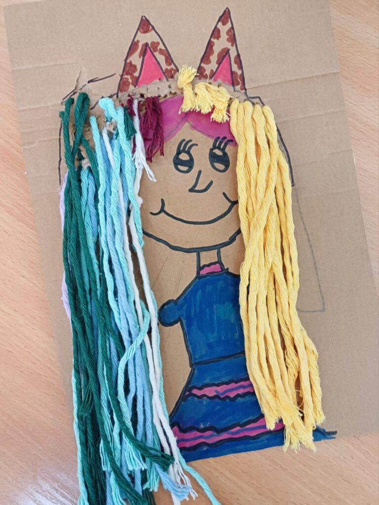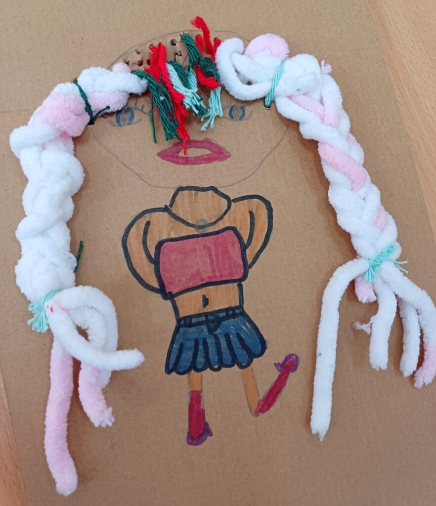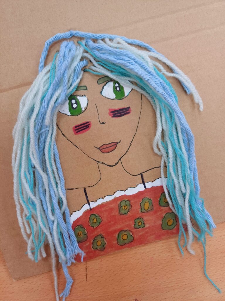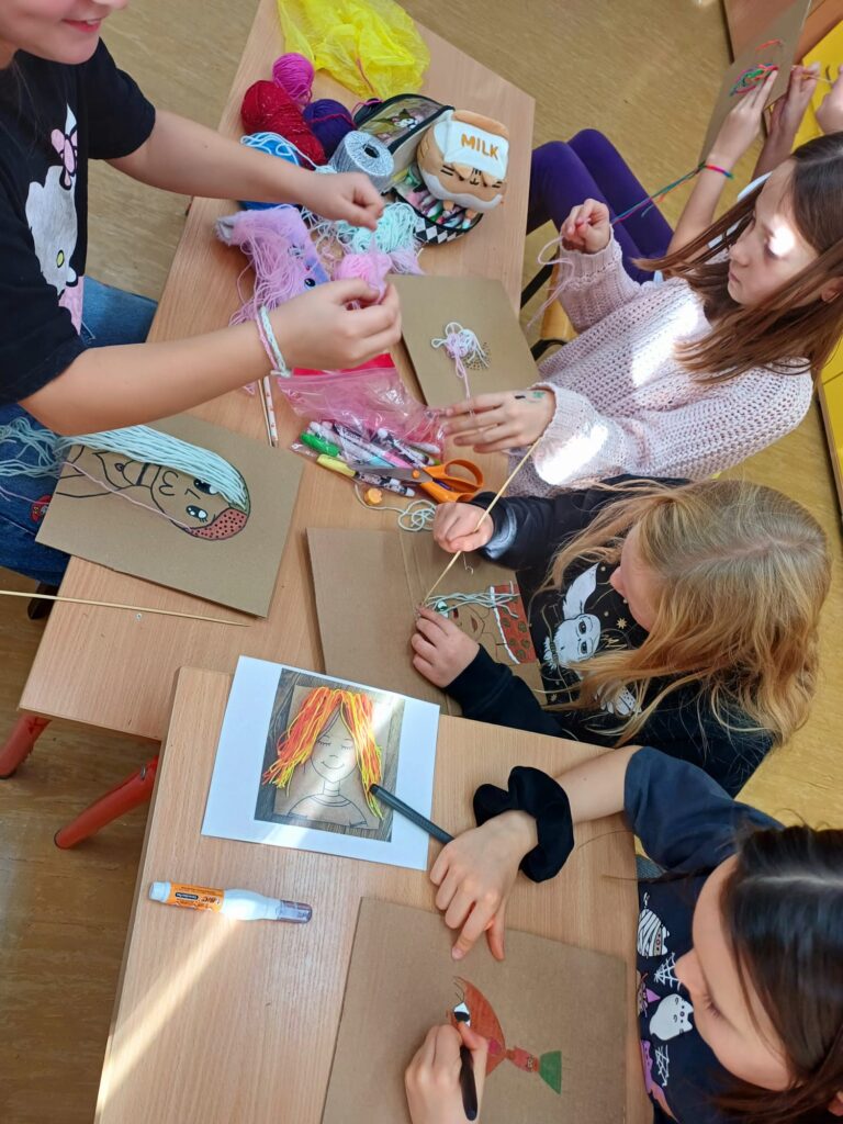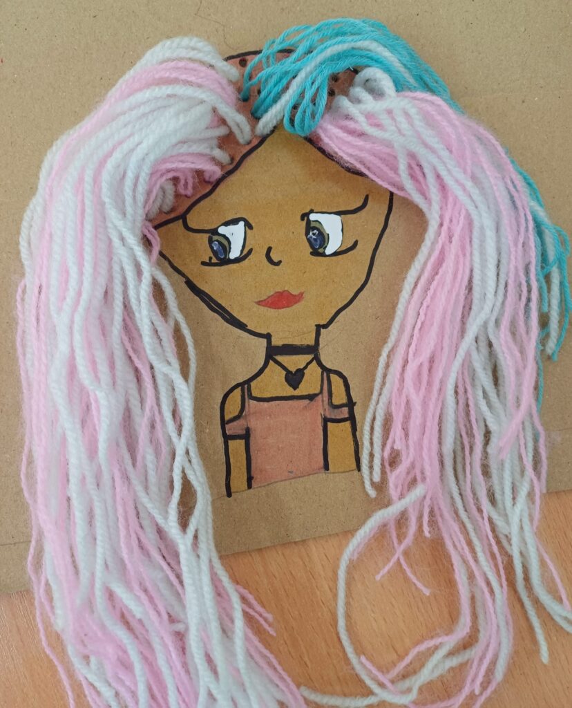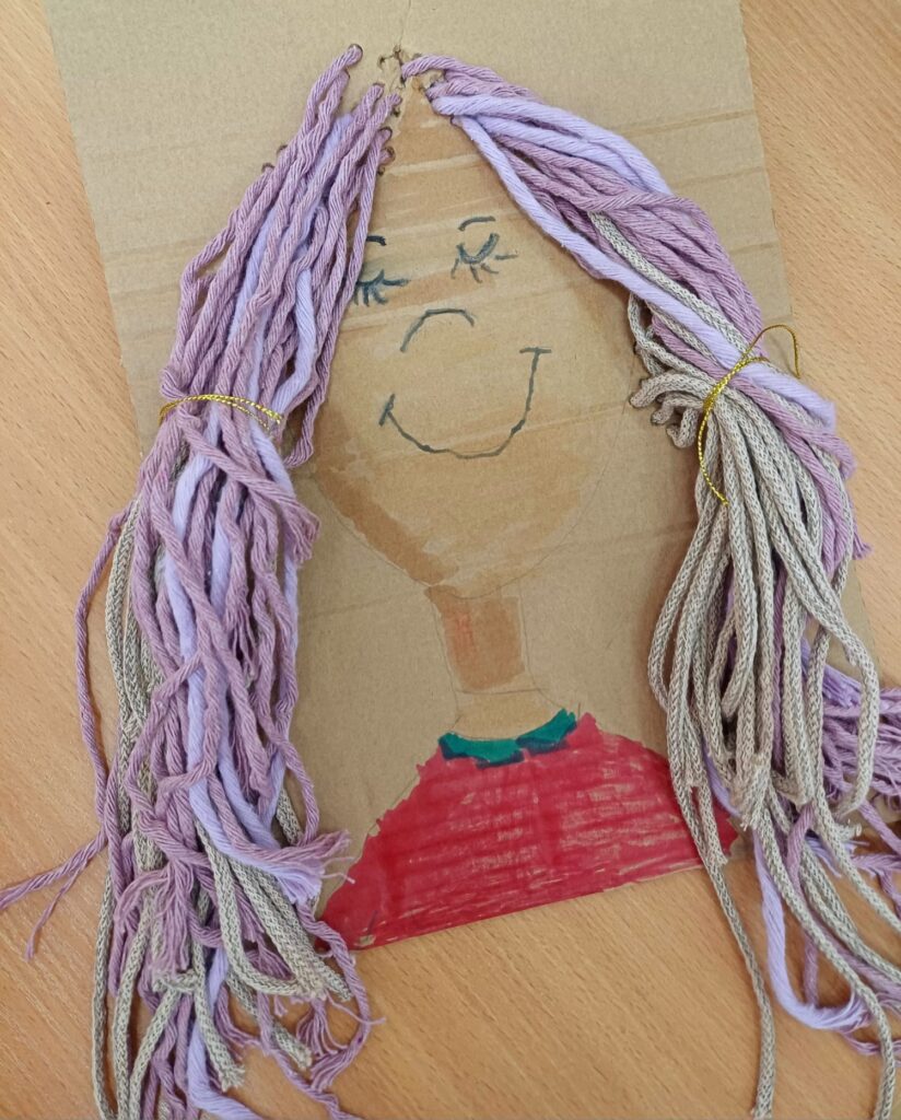 Największym wyzwaniem, a zarazem źródłem radości, było wykonanie włosów z kolorowej włóczki. Uczniowie dobierali barwy i faktury nitek, tworząc fryzury pełne wyrazu i fantazji – od długich różowych pasm po warkocze i kolorowe grzywki.