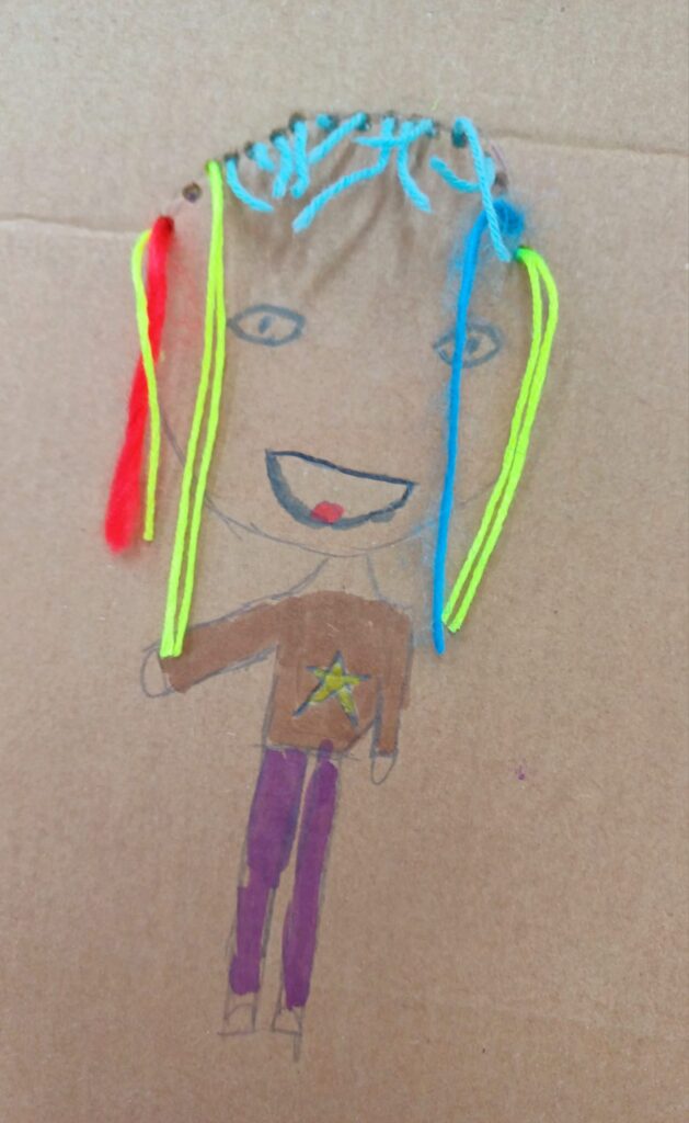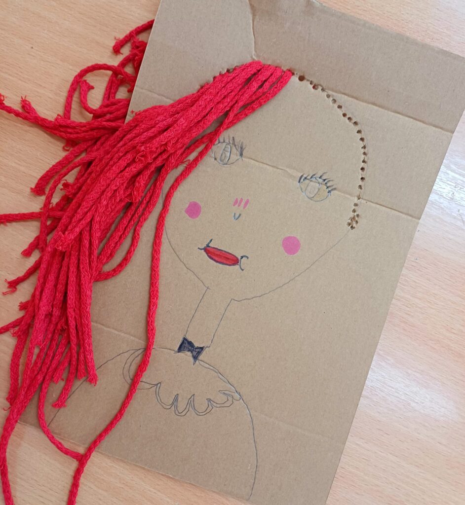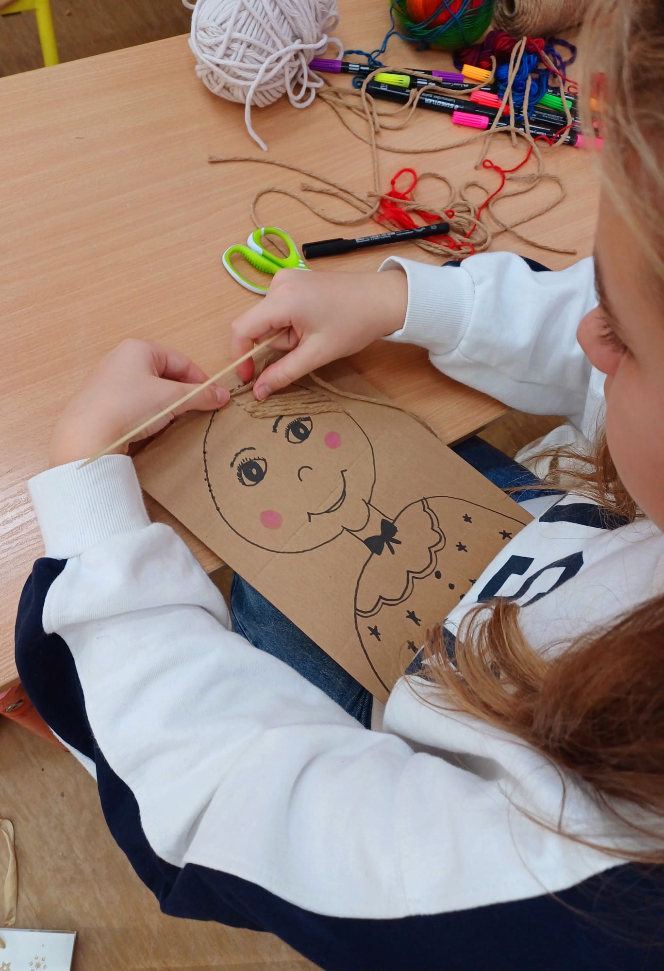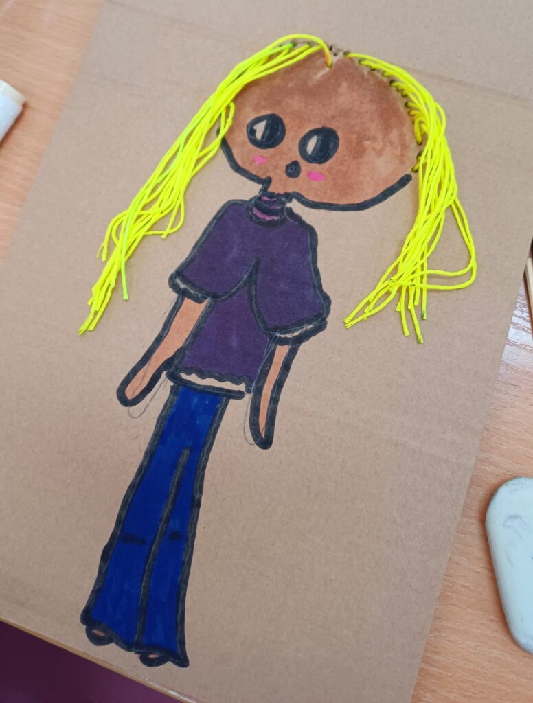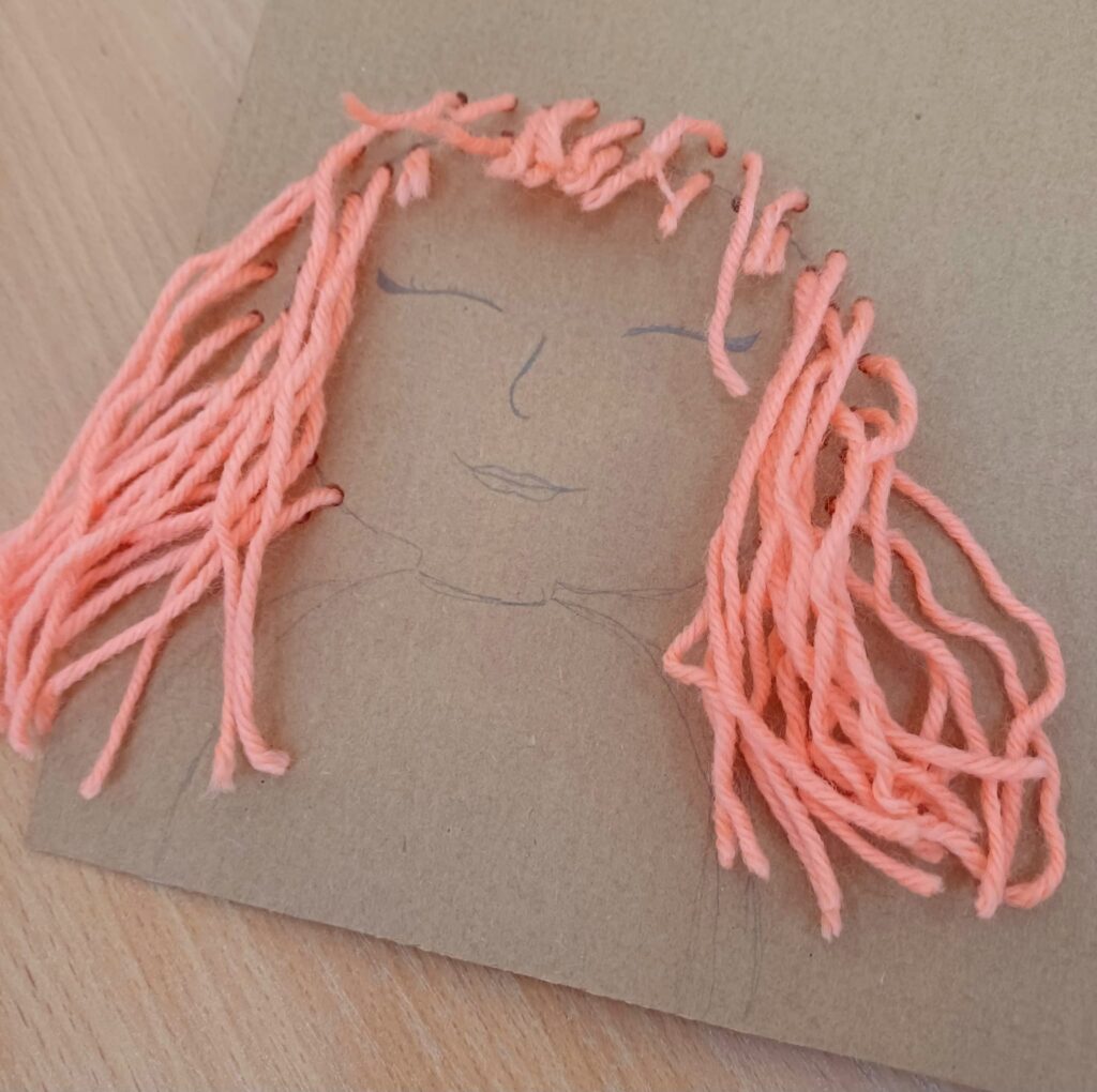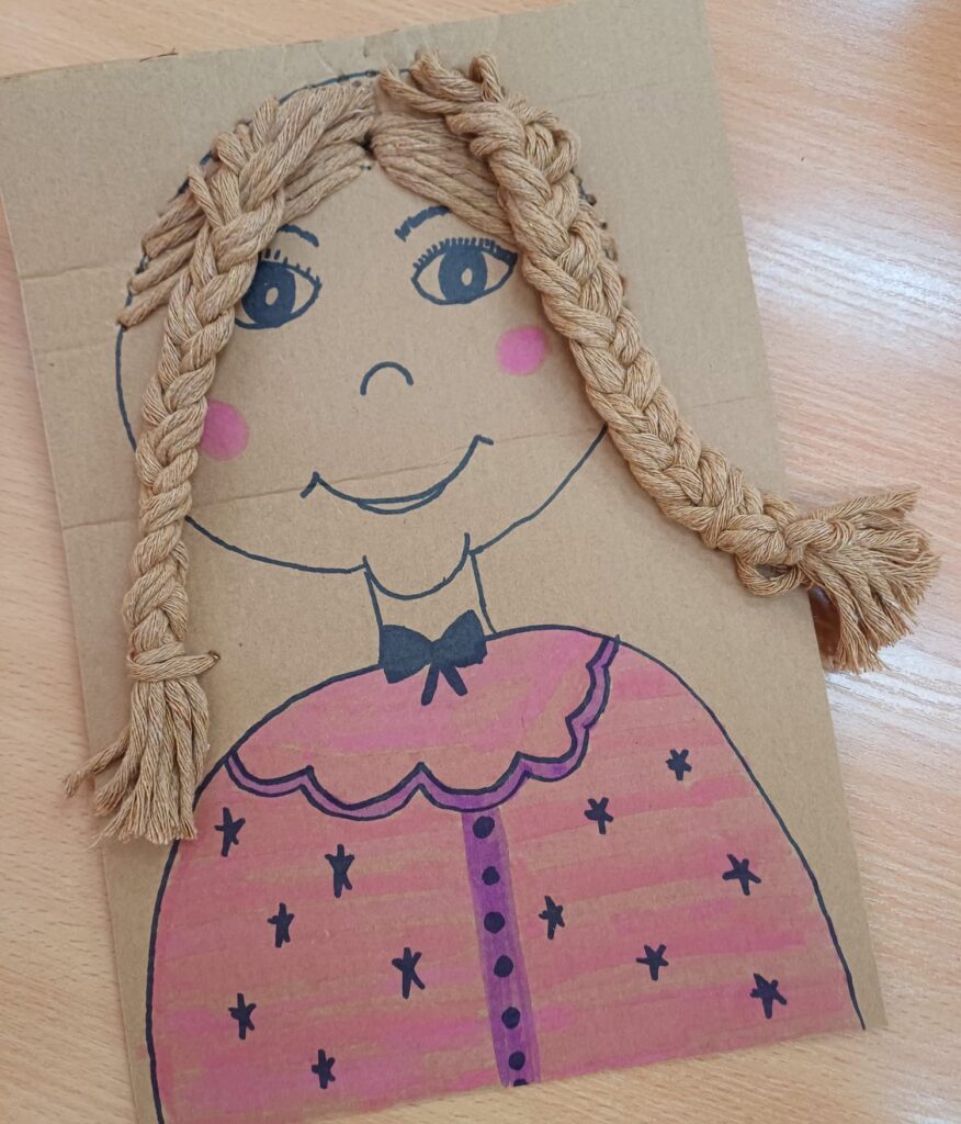 Największym wyzwaniem, a zarazem źródłem radości, było wykonanie włosów z kolorowej włóczki. Uczniowie dobierali barwy i faktury nitek, tworząc fryzury pełne wyrazu i fantazji – od długich różowych pasm po warkocze i kolorowe grzywki.