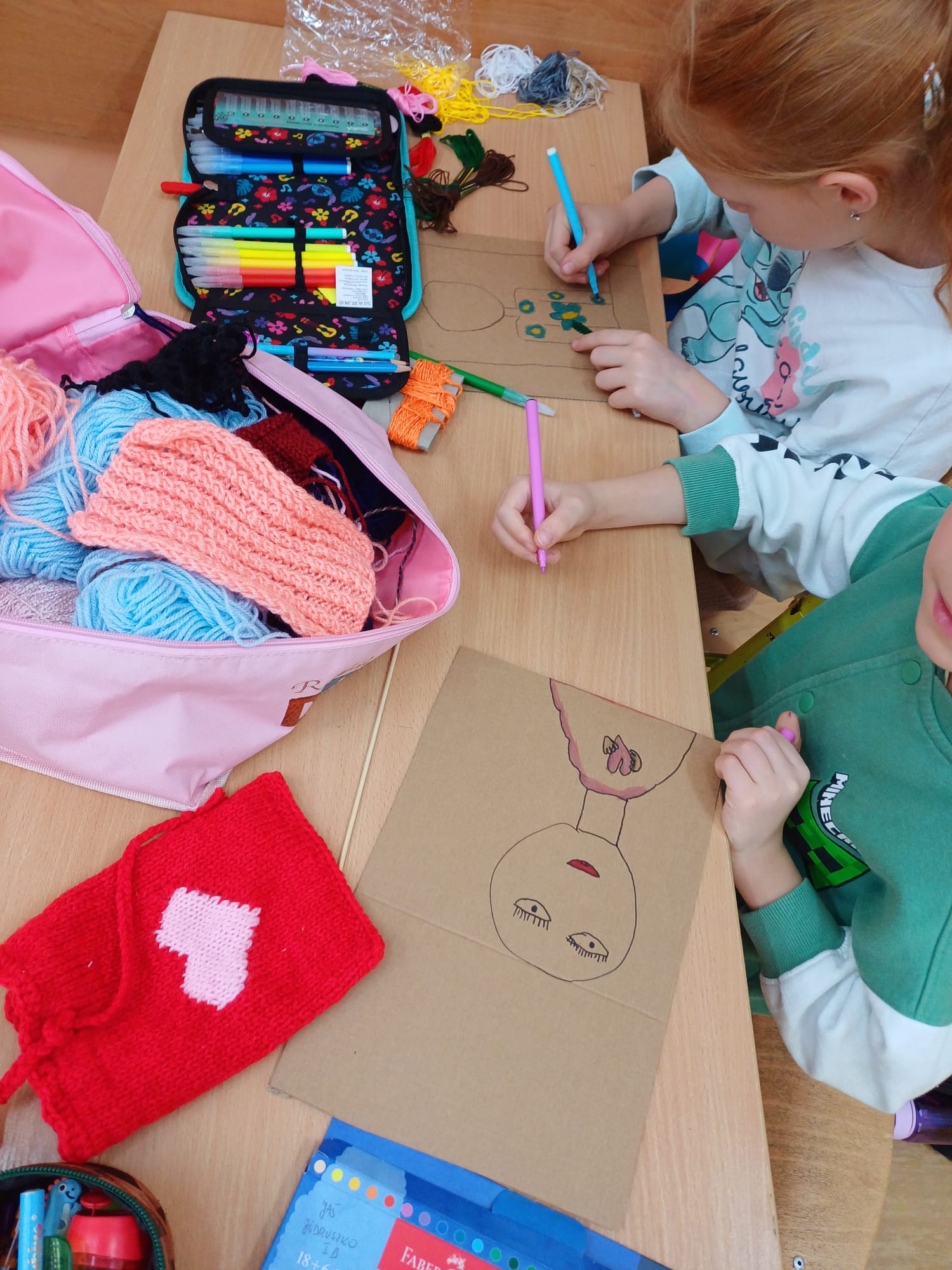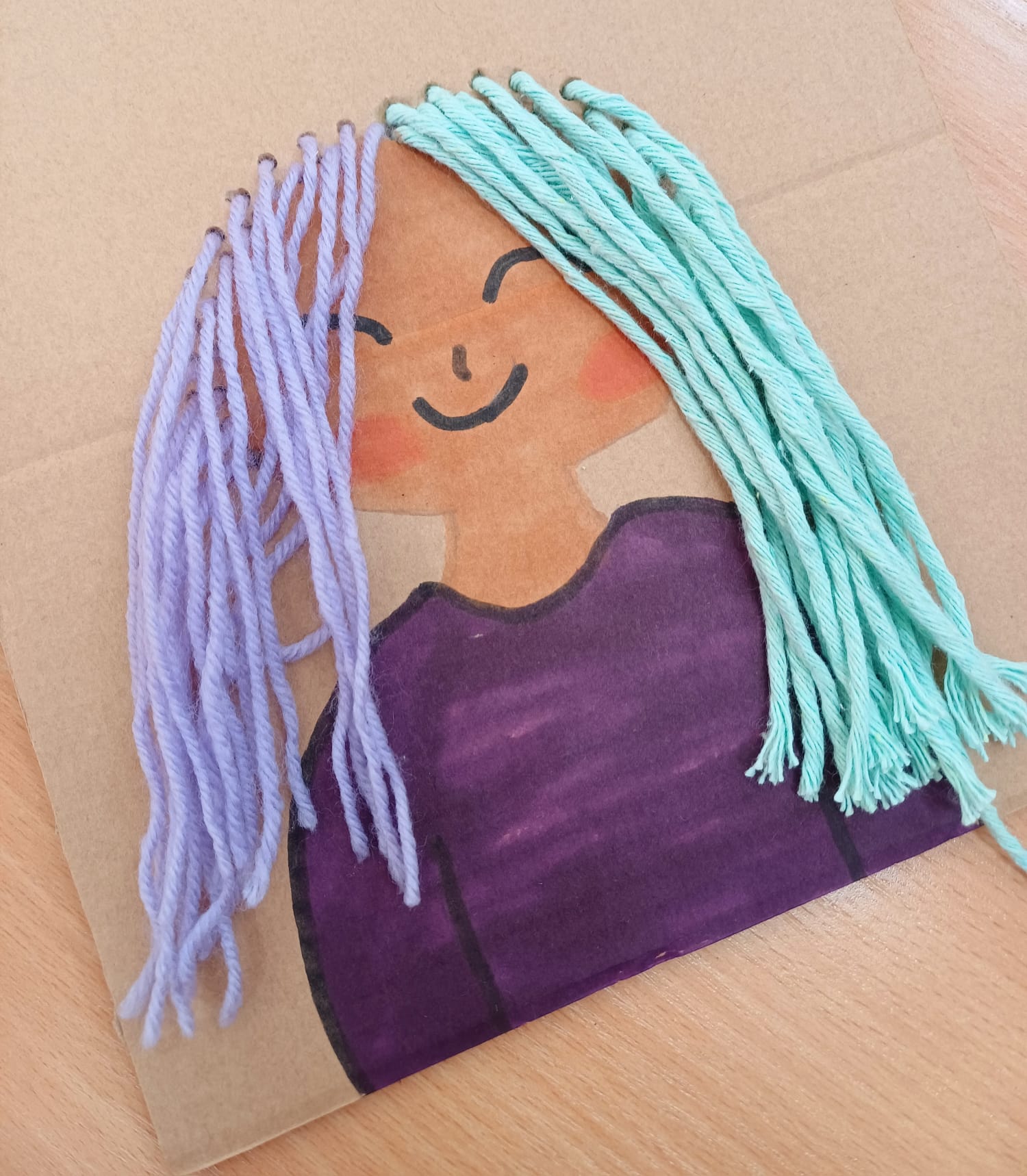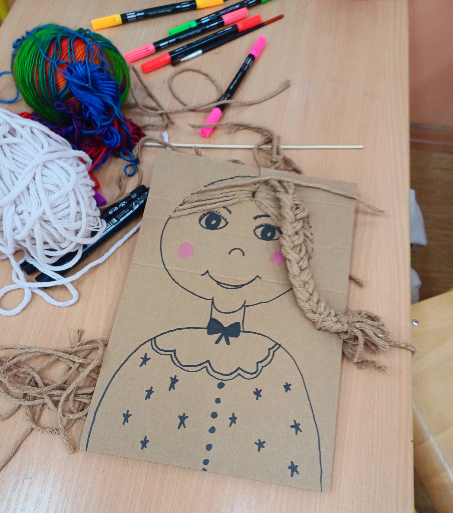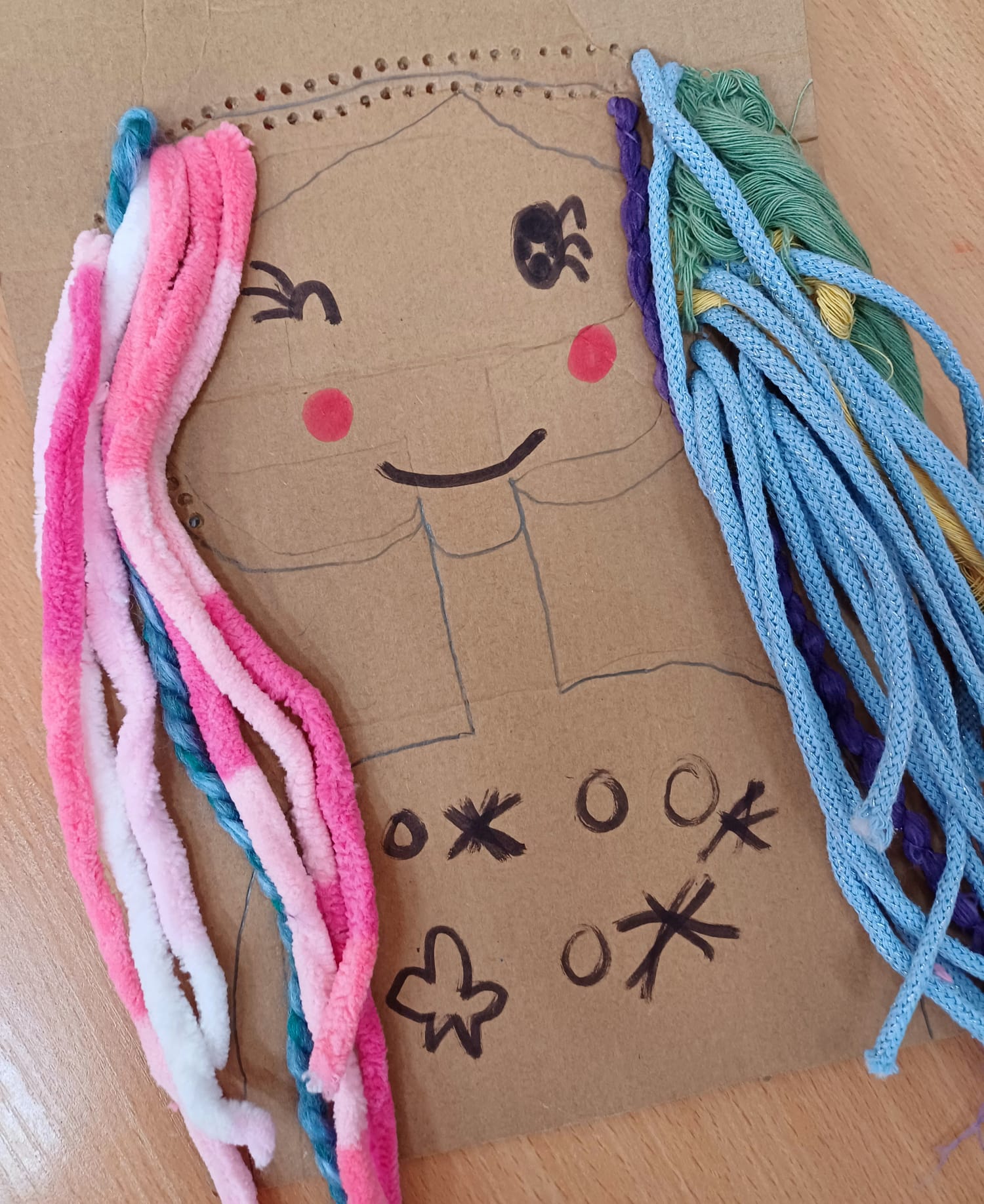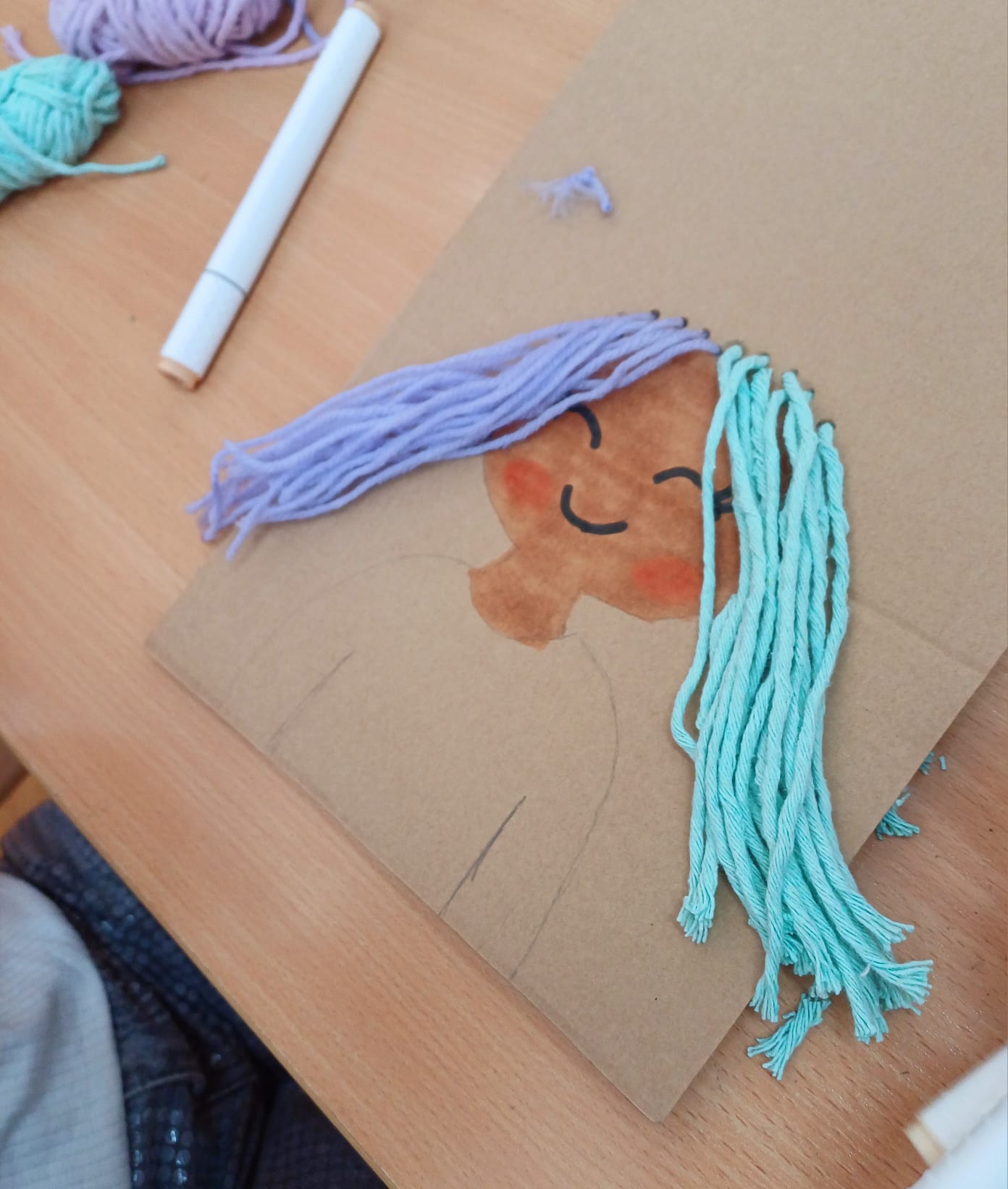 Największym wyzwaniem, a zarazem źródłem radości, było wykonanie włosów z kolorowej włóczki. Uczniowie dobierali barwy i faktury nitek, tworząc fryzury pełne wyrazu i fantazji – od długich różowych pasm po warkocze i kolorowe grzywki.