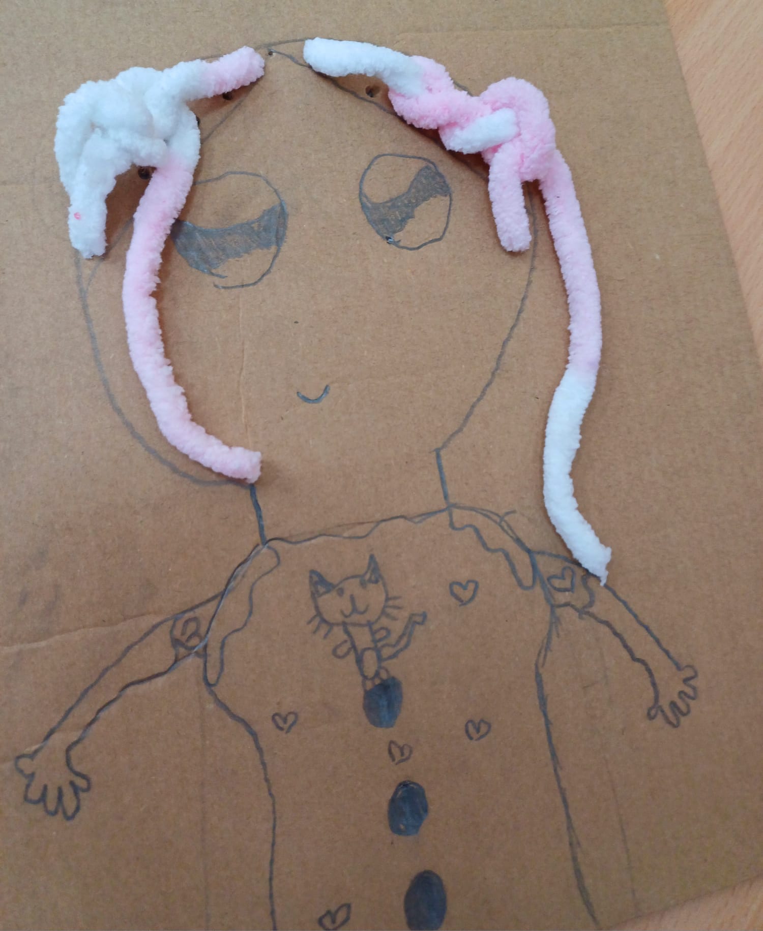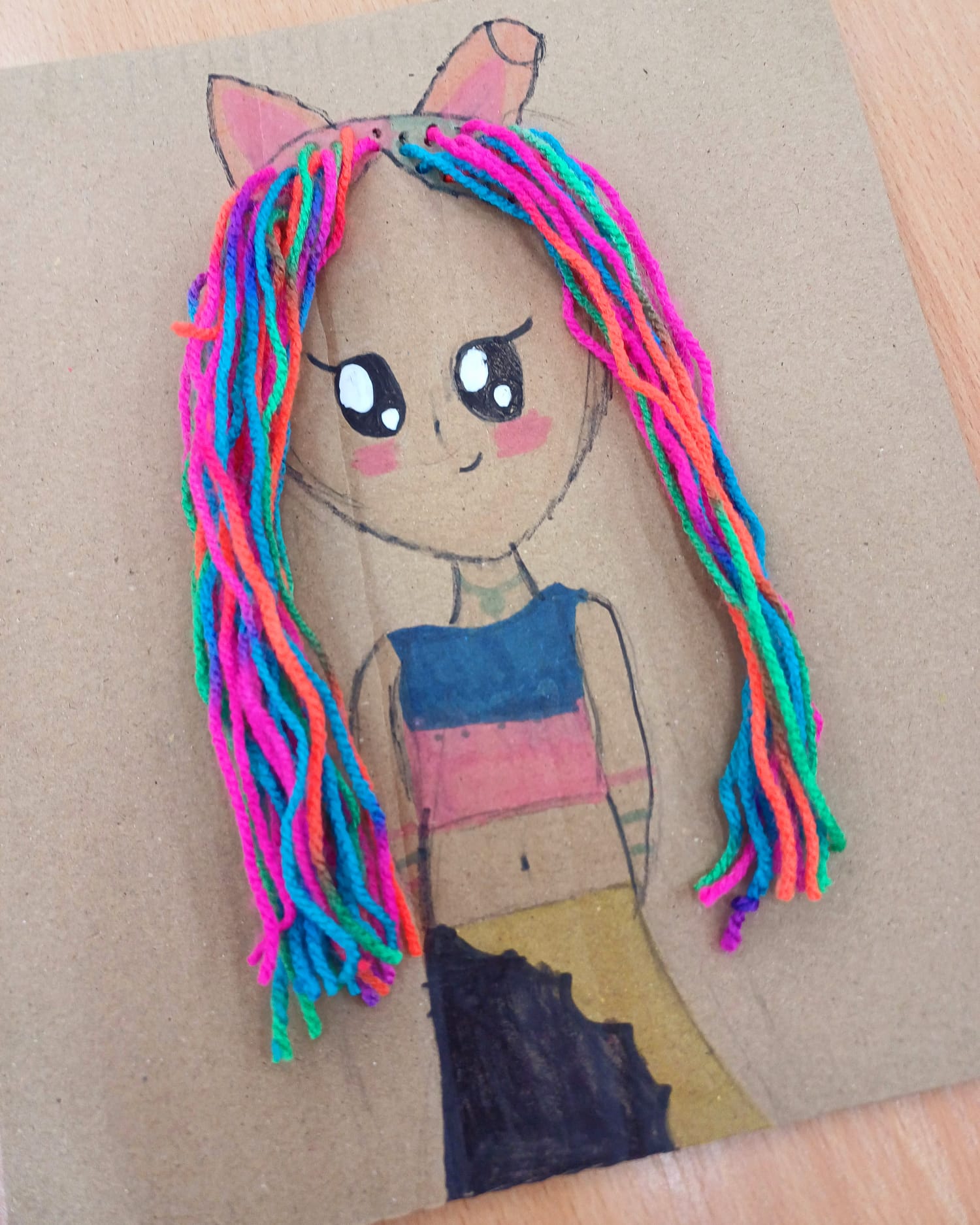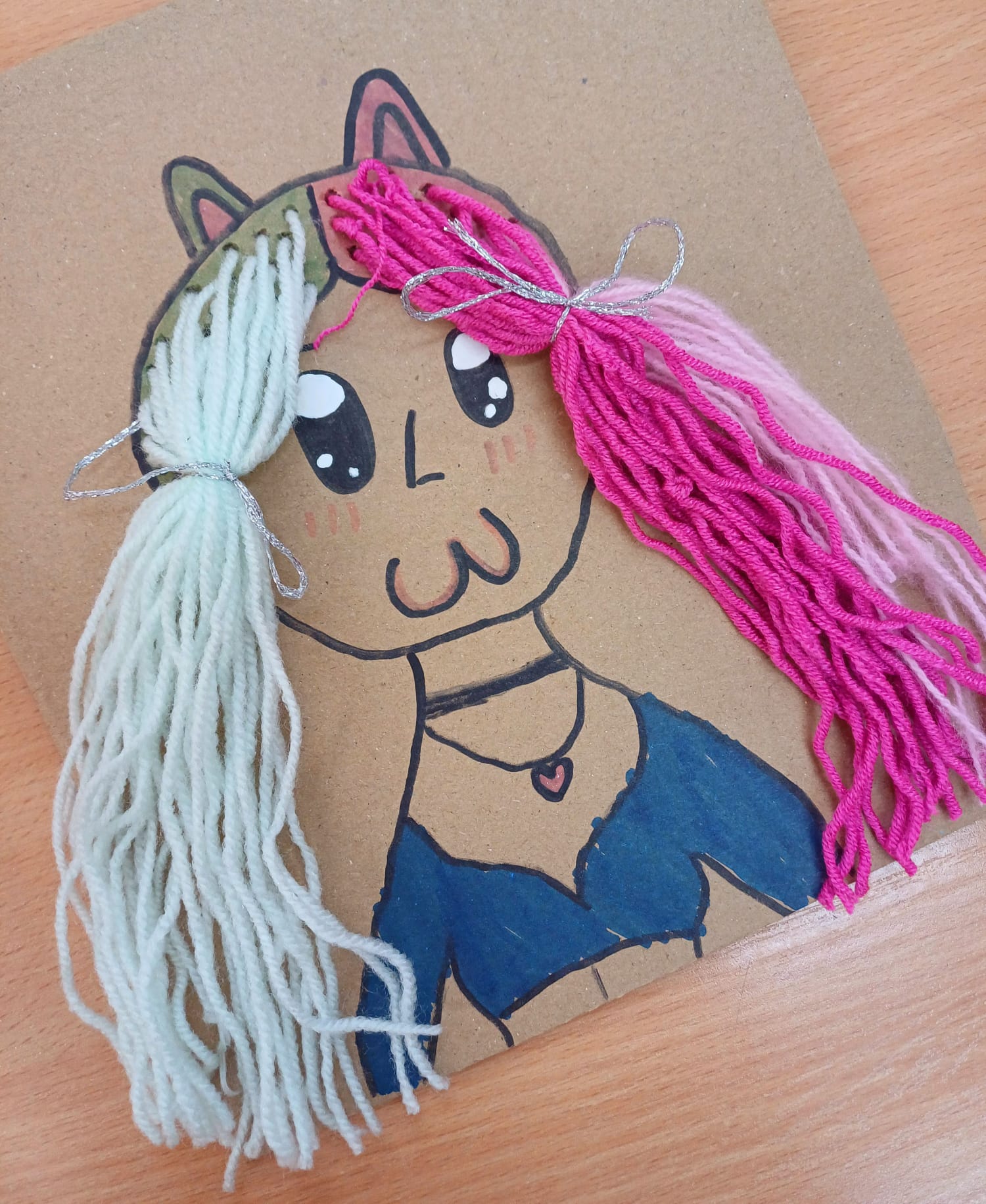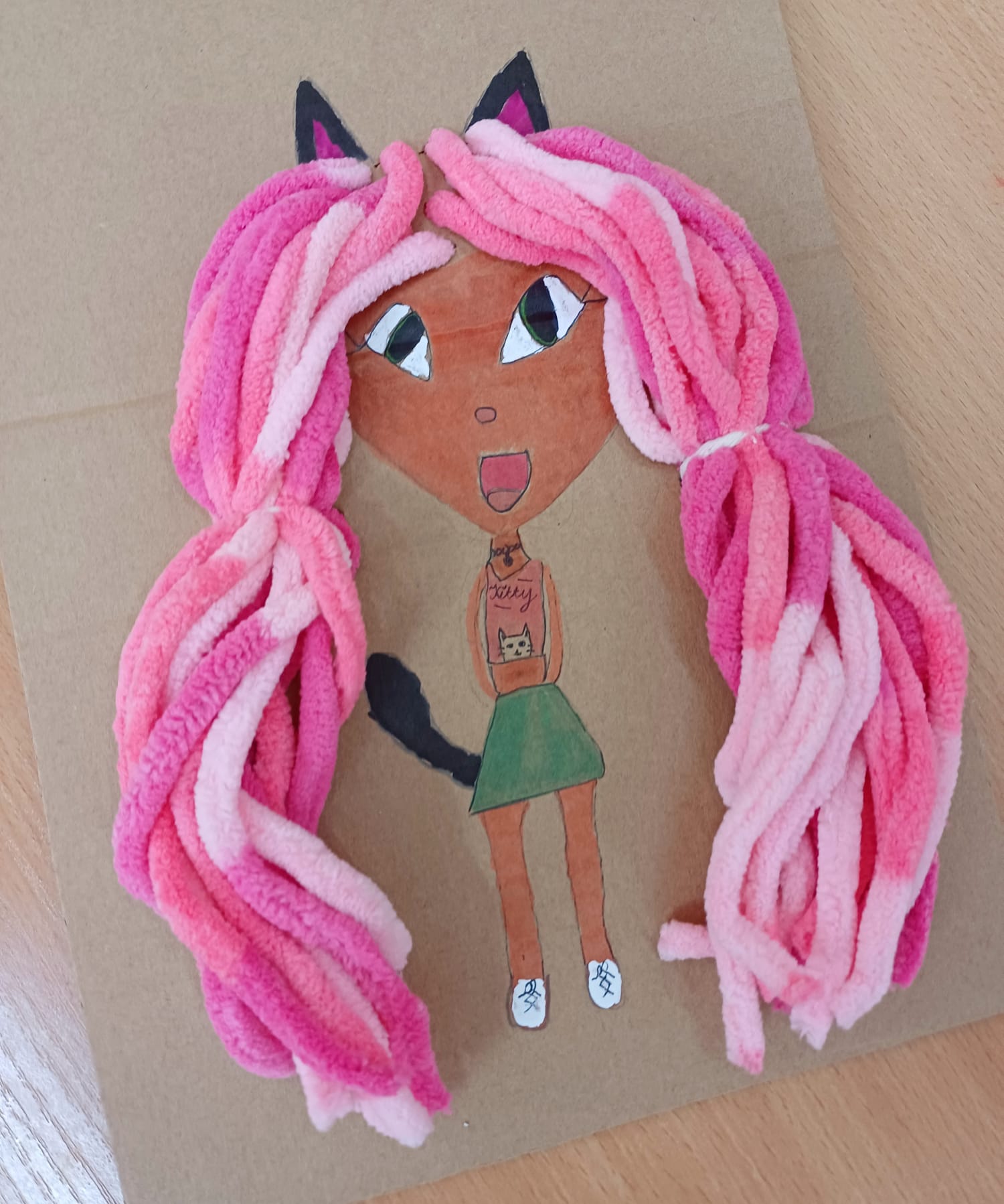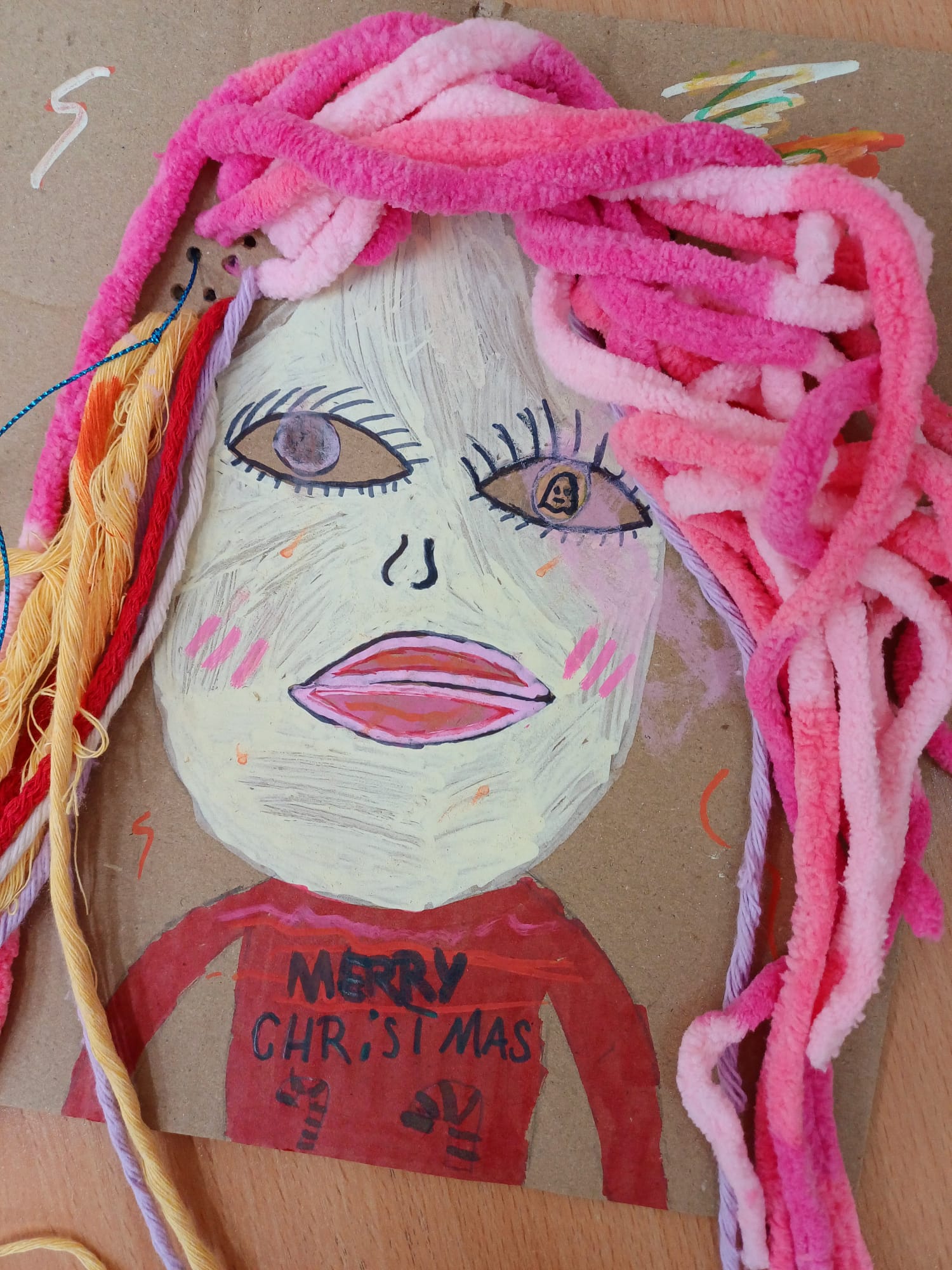 Największym wyzwaniem, a zarazem źródłem radości, było wykonanie włosów z kolorowej włóczki. Uczniowie dobierali barwy i faktury nitek, tworząc fryzury pełne wyrazu i fantazji – od długich różowych pasm po warkocze i kolorowe grzywki.