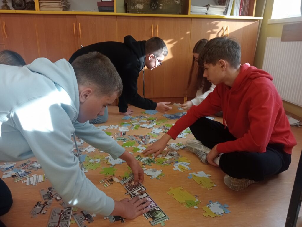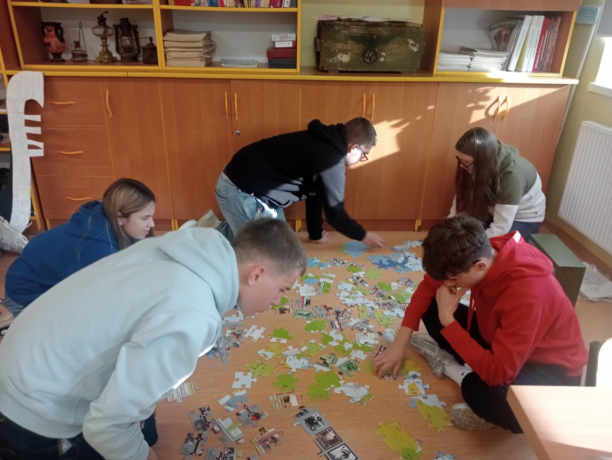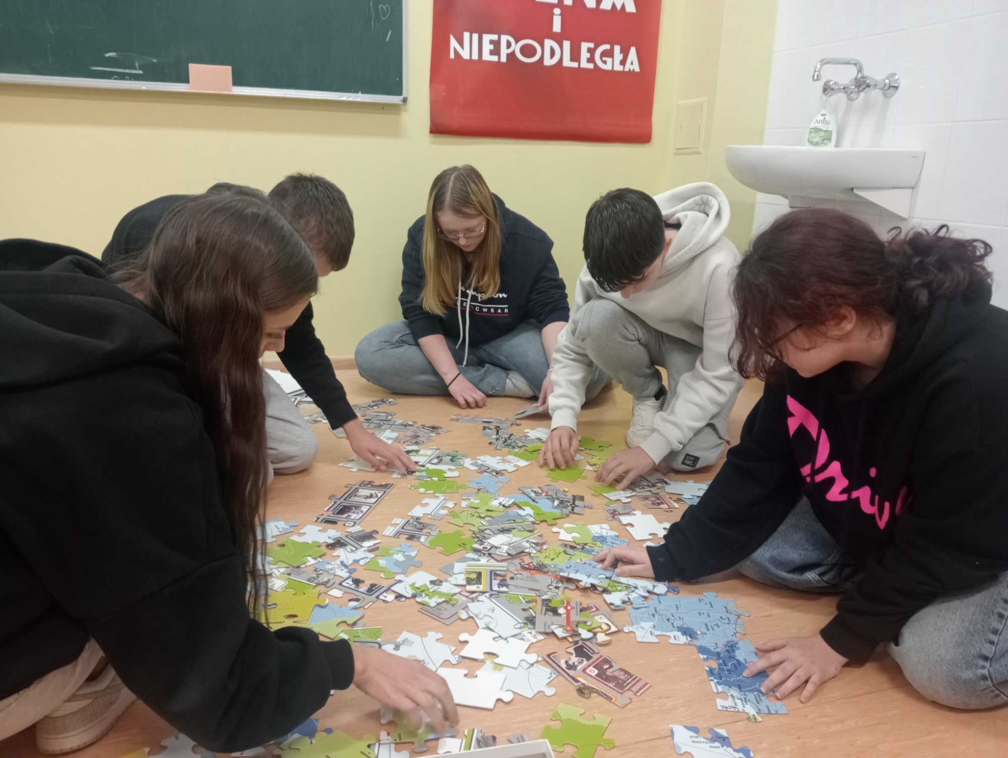 uczniowie klas ósmych na podstawie układanych puzzli poznawali szlak bojowy oddziałów polskich