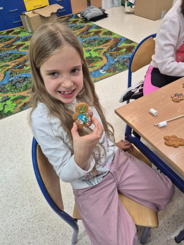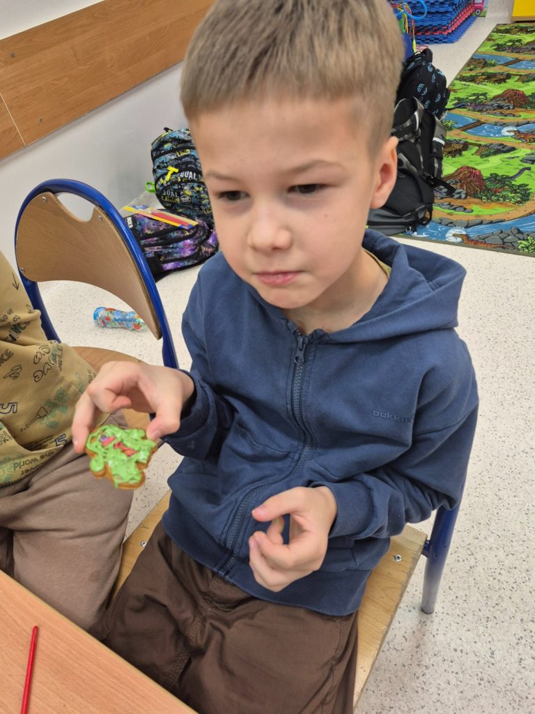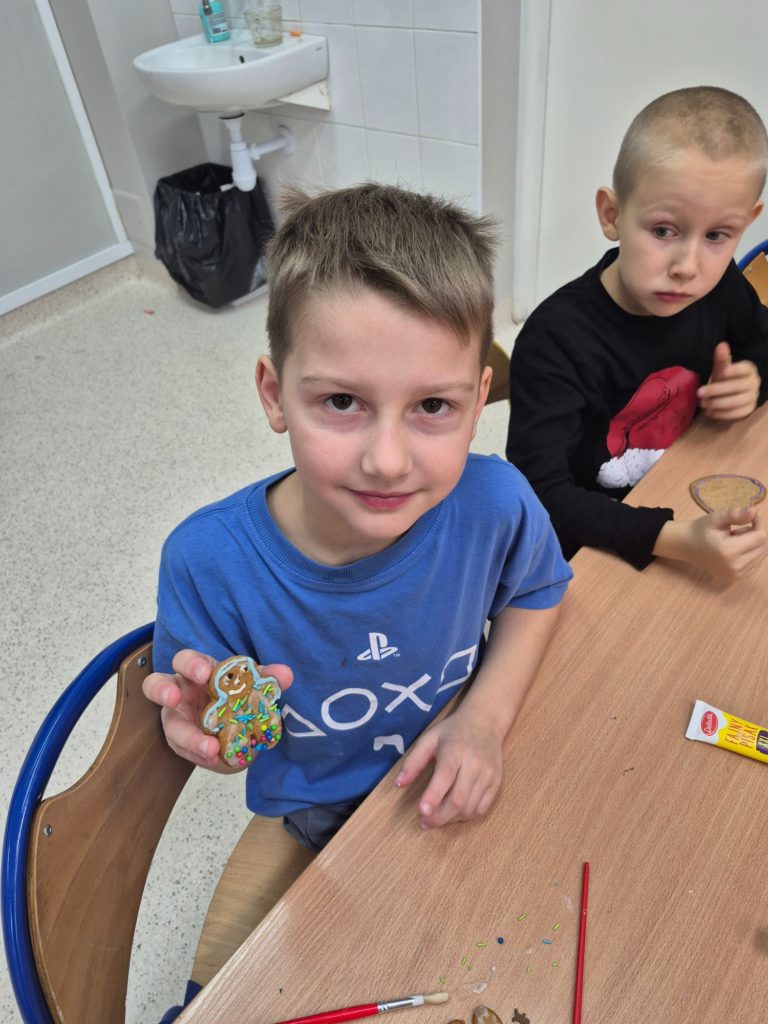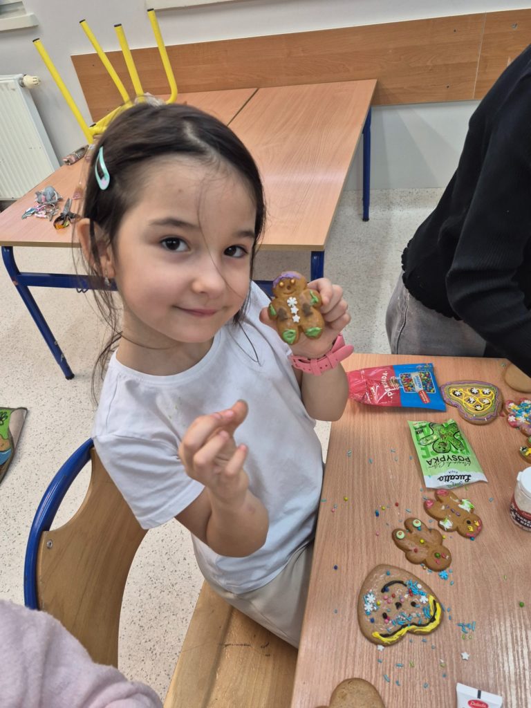 Dzieci własnoręcznie ozdabiały pierniczki, tworząc ciasteczkowe ludziki z lukru, kolorowych pisaków i barwnych posypek. Kreatywność nie miała granic — powstały prawdziwe piernikowe dzieła sztuki 🤎✨ Nie zabrakło też pierniczków przygotowanych specjalnie dla mamy i taty 💕