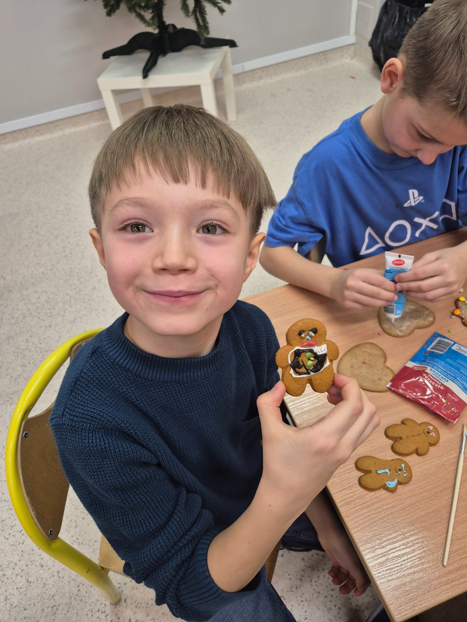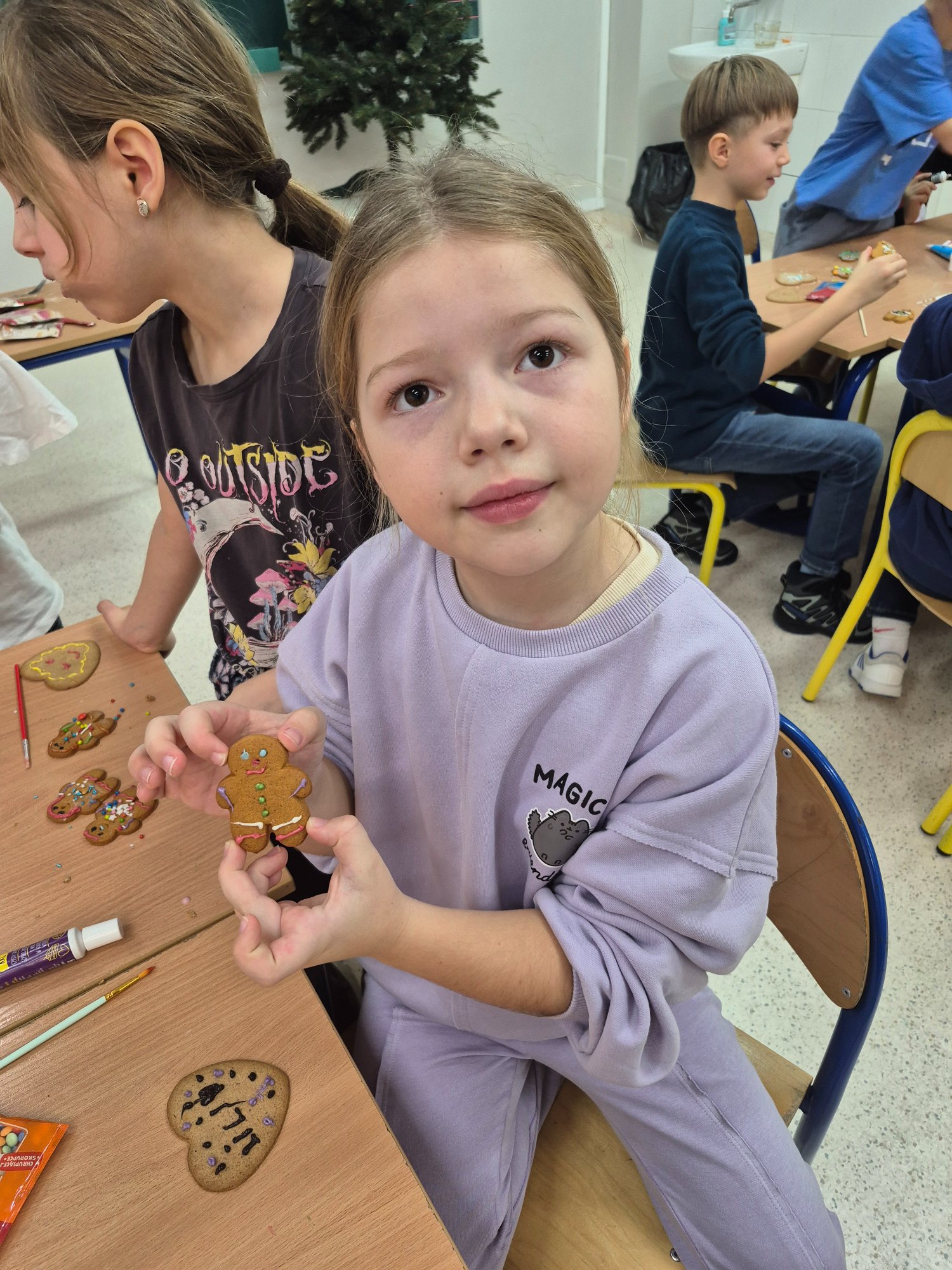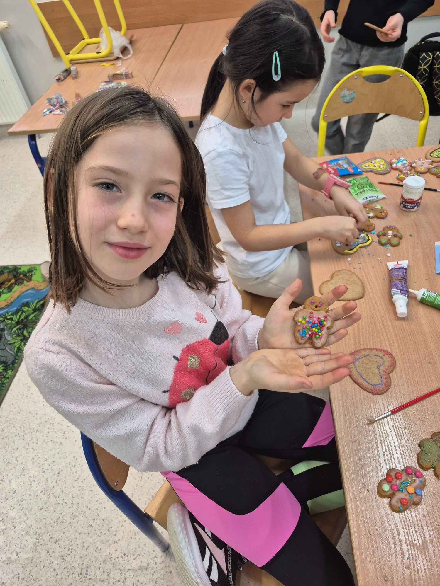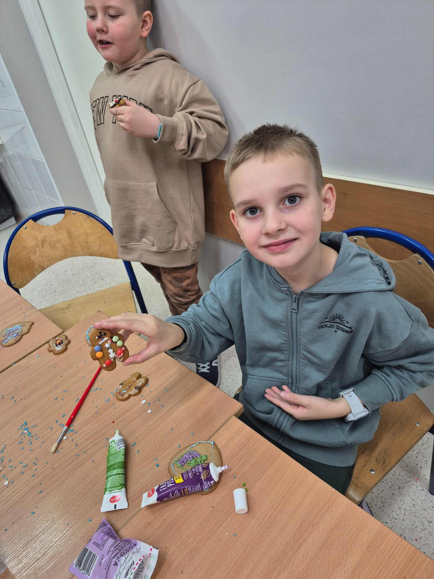 Dzieci własnoręcznie ozdabiały pierniczki, tworząc ciasteczkowe ludziki z lukru, kolorowych pisaków i barwnych posypek. Kreatywność nie miała granic — powstały prawdziwe piernikowe dzieła sztuki 🤎✨ Nie zabrakło też pierniczków przygotowanych specjalnie dla mamy i taty 💕