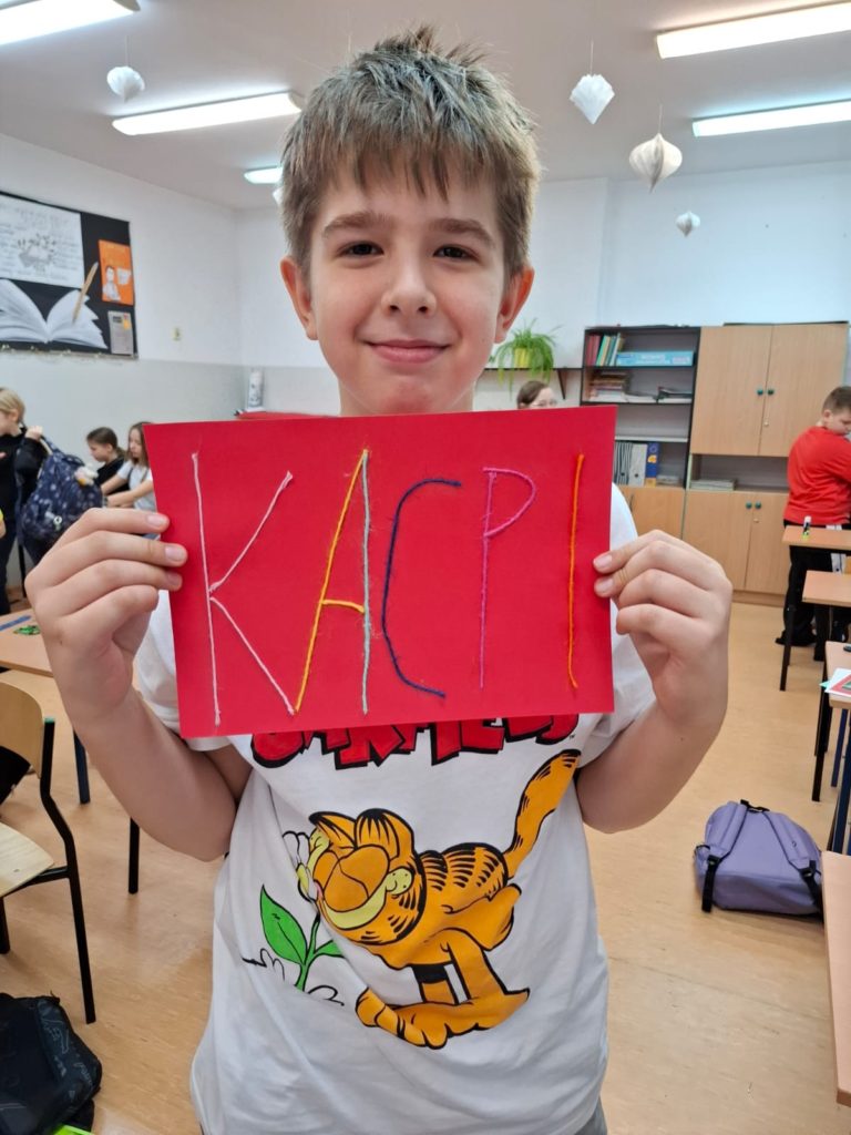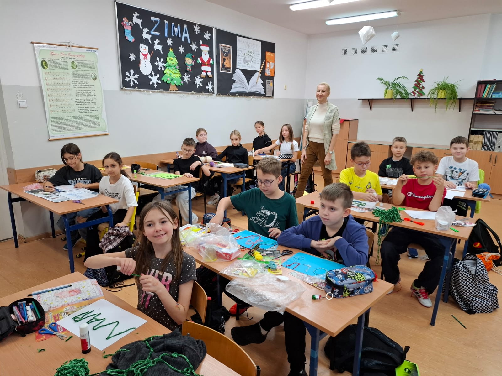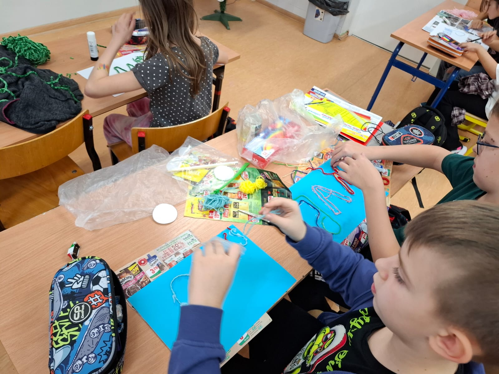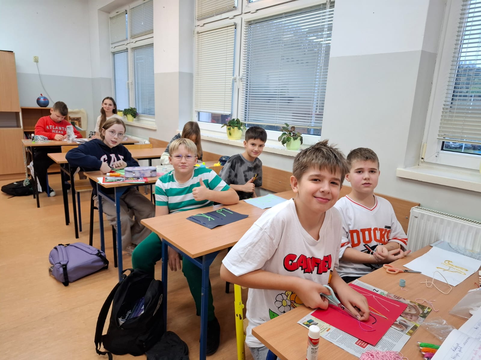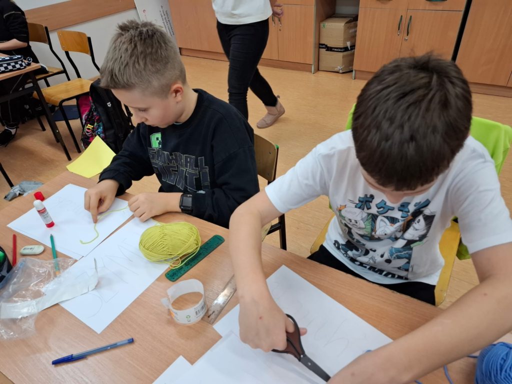 Były już lekcje kleksografii, zatem czas na przędzenie liter. Na zajęciach języka polskiego czwartoklasiści mieli możliwość po raz kolejny przenieść się do baśniowego świata Akademii pana Kleksa. Wystarczyła znajomość lektury, odpowiednie rekwizyty i ….wyobraźnia. Dzięki temu odbyła się lekcja przędzenia liter.