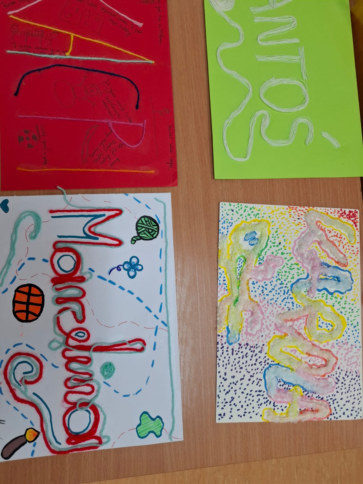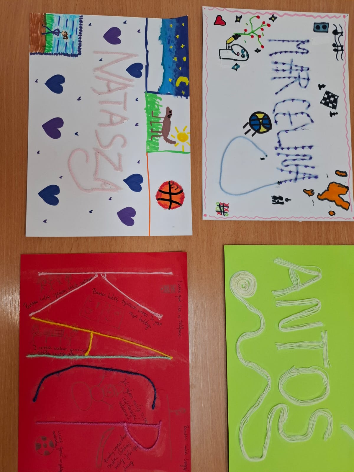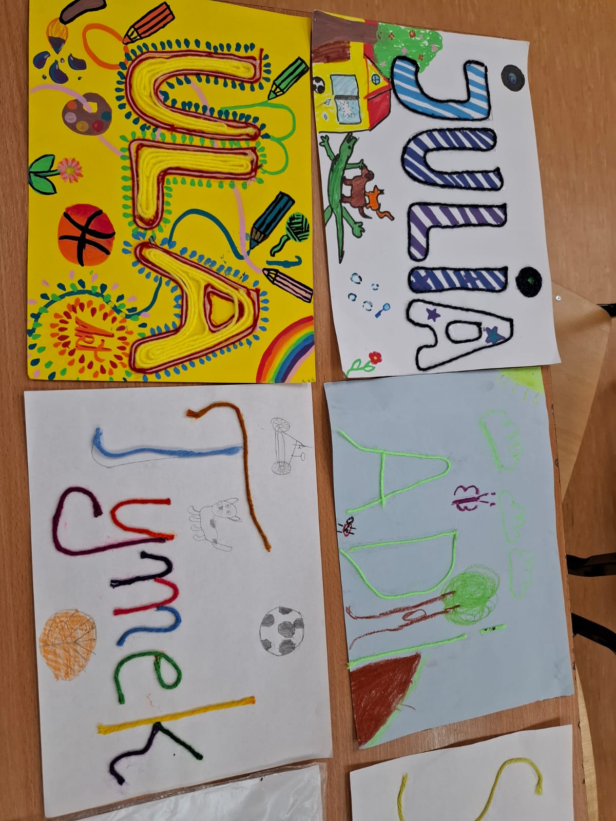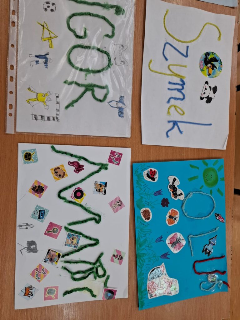 Każde dziecko napisało na dużej kartce swoje imię, a następnie podpisy zostały ozdobione włóczką, wełną, nićmi. Wszyscy dbali o to, aby starannie i dokładnie wykaligrafować swoje imię.