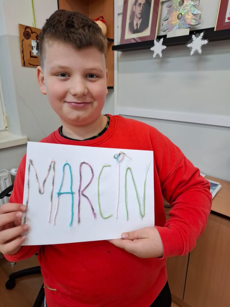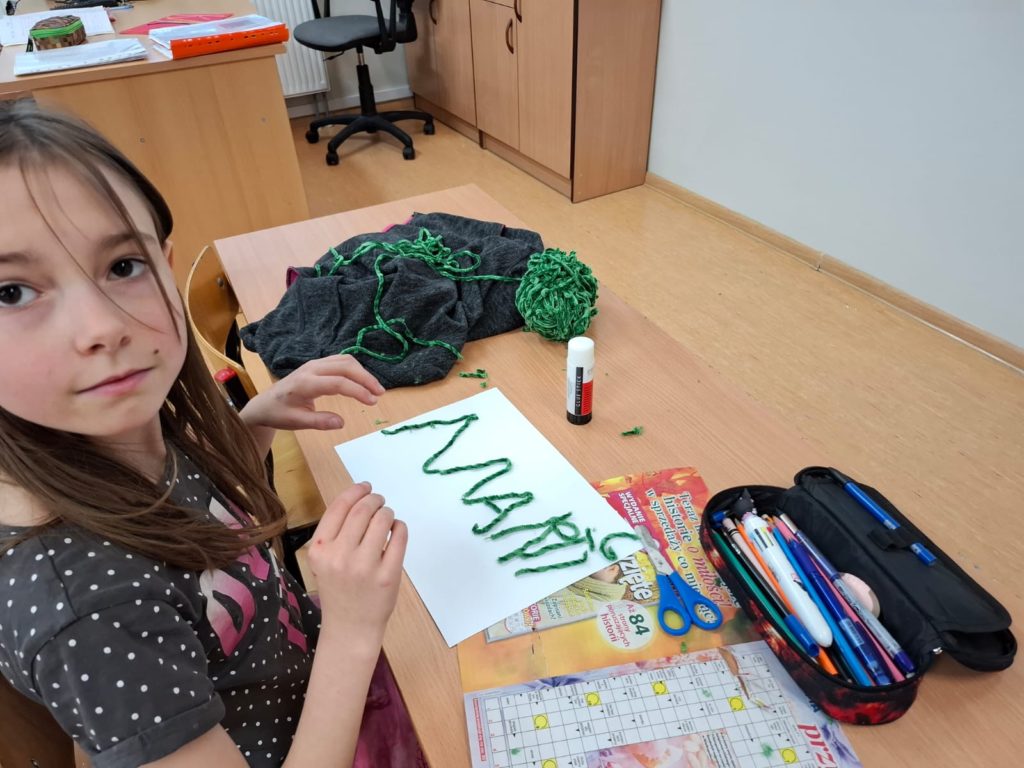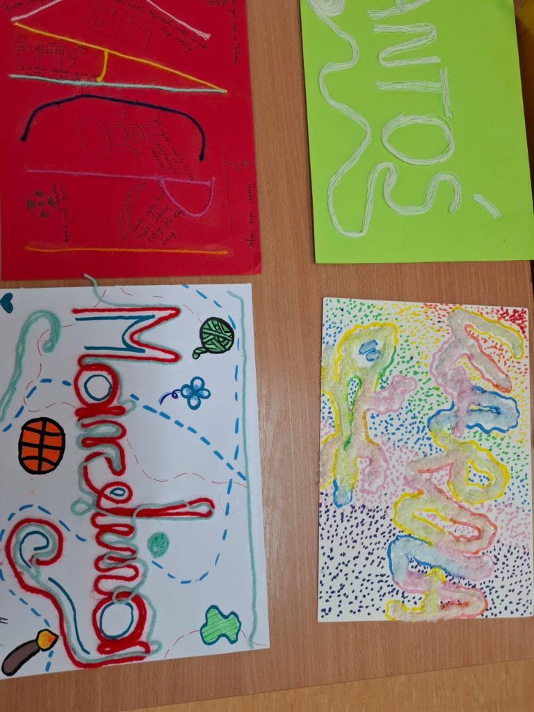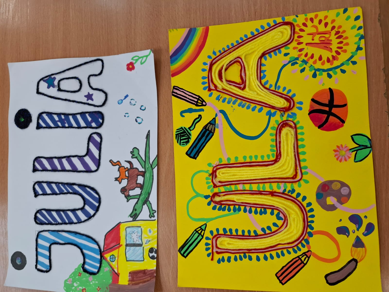 Każde dziecko napisało na dużej kartce swoje imię, a następnie podpisy zostały ozdobione włóczką, wełną, nićmi. Wszyscy dbali o to, aby starannie i dokładnie wykaligrafować swoje imię.