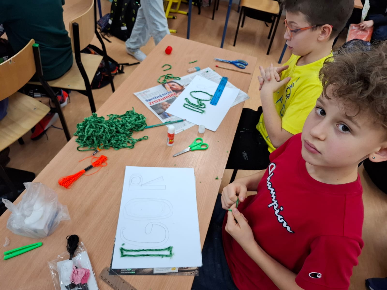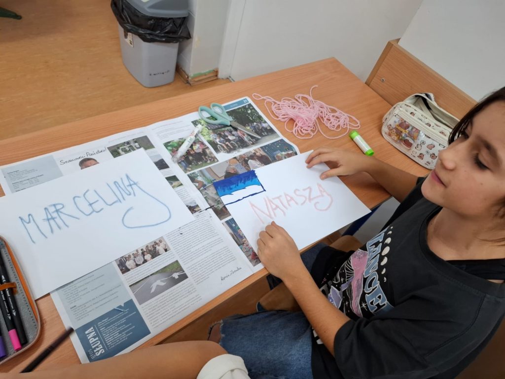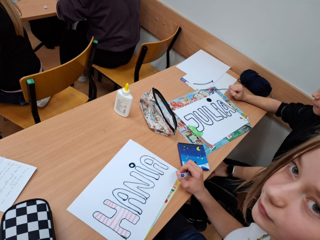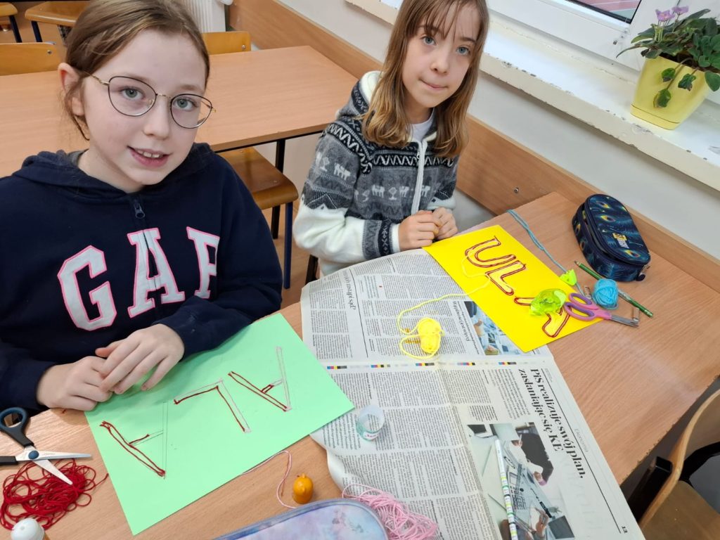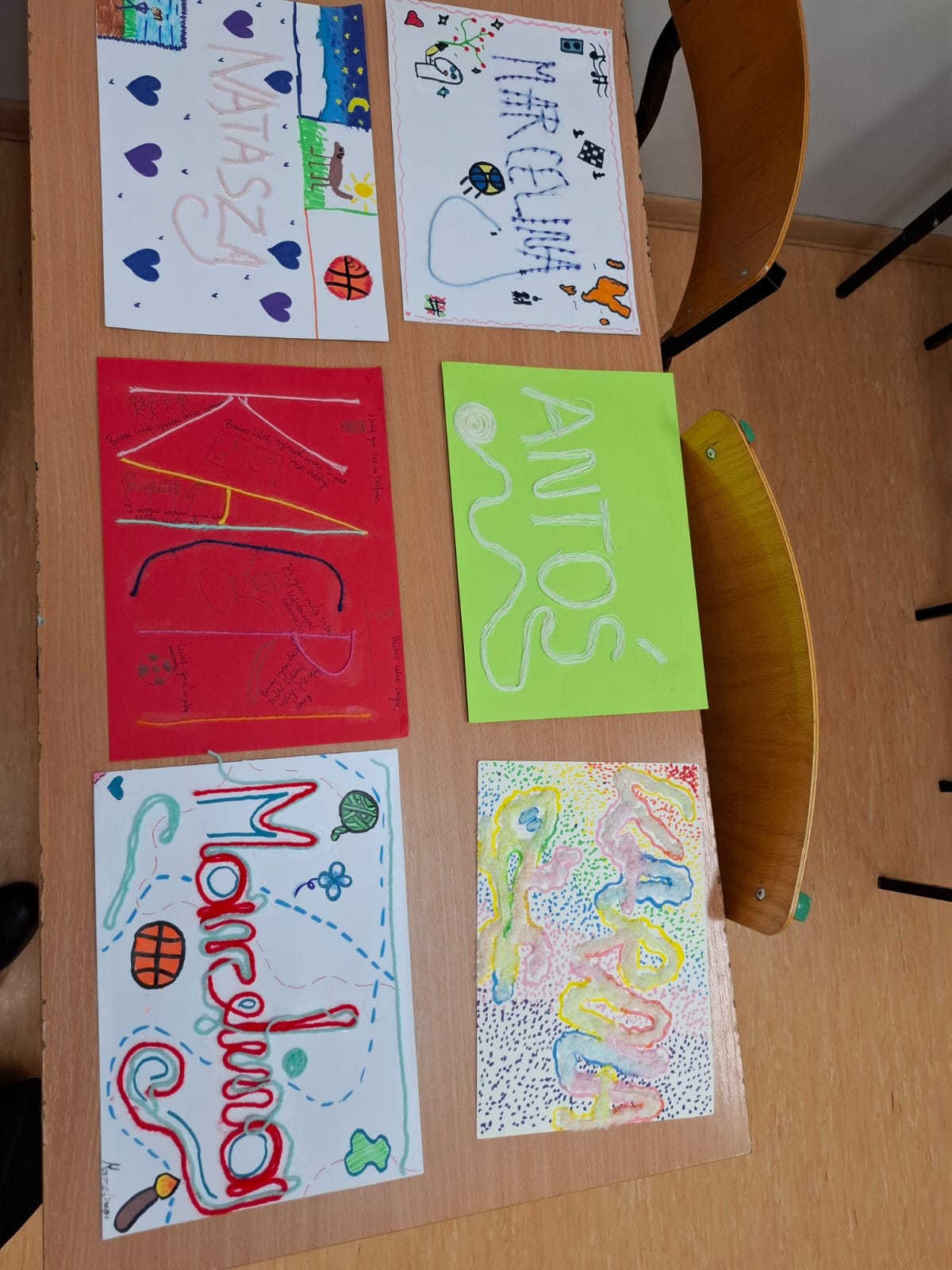 Każde dziecko napisało na dużej kartce swoje imię, a następnie podpisy zostały ozdobione włóczką, wełną, nićmi. Wszyscy dbali o to, aby starannie i dokładnie wykaligrafować swoje imię.