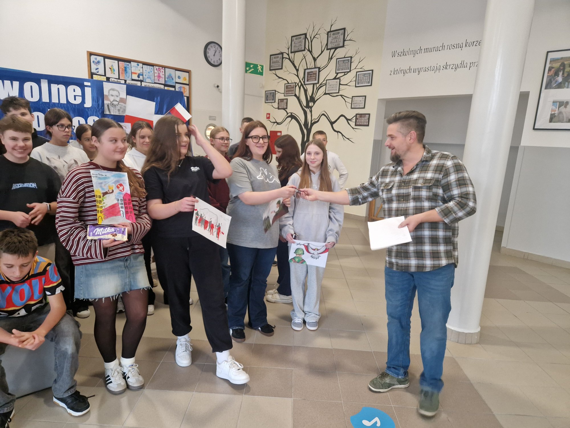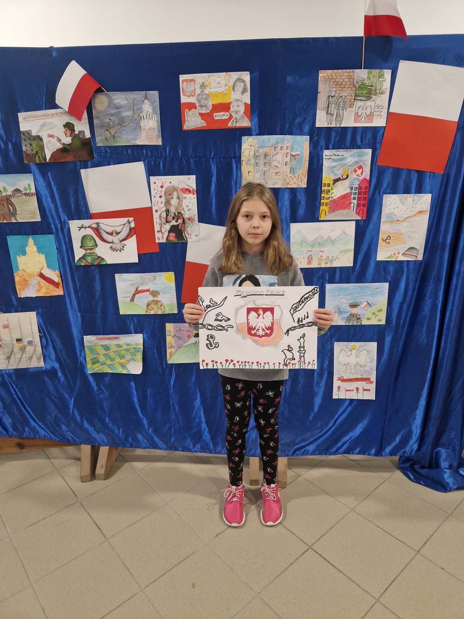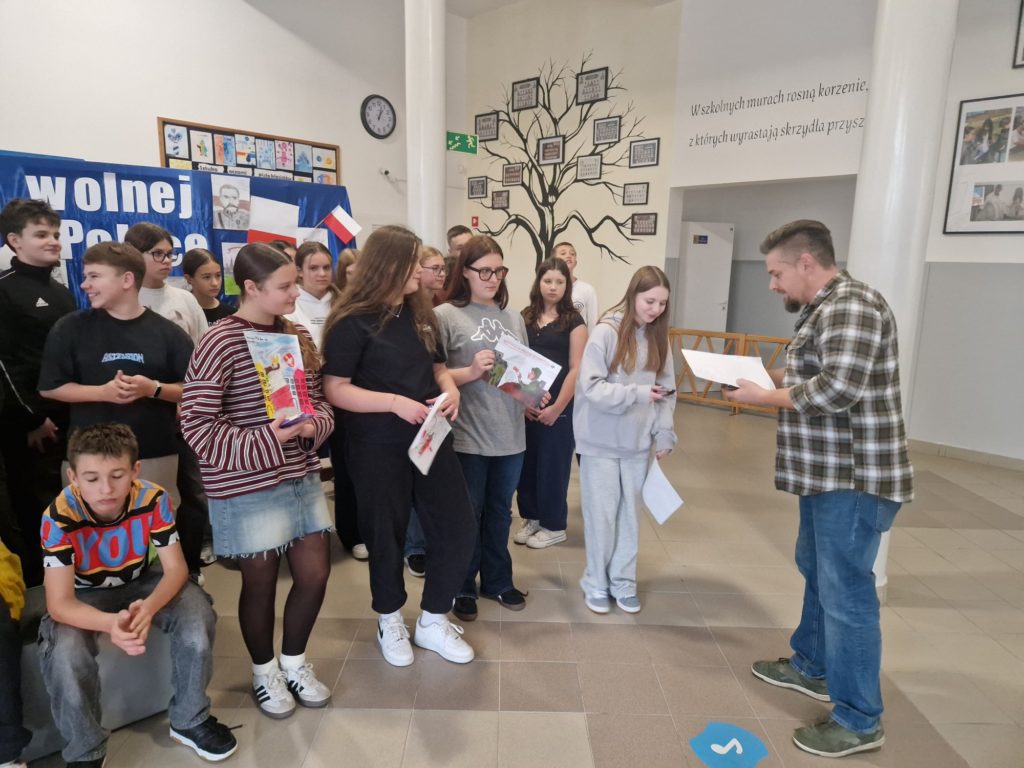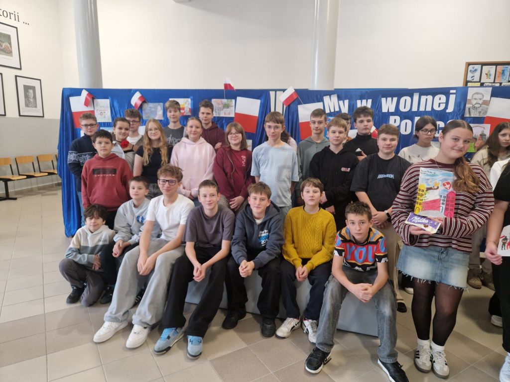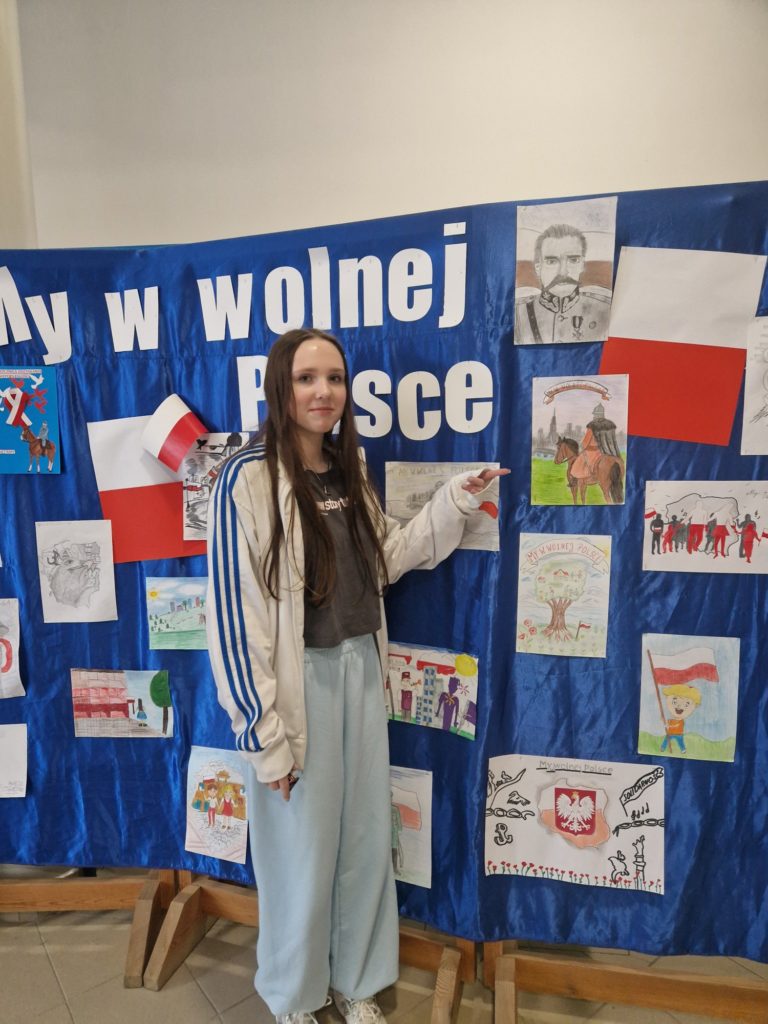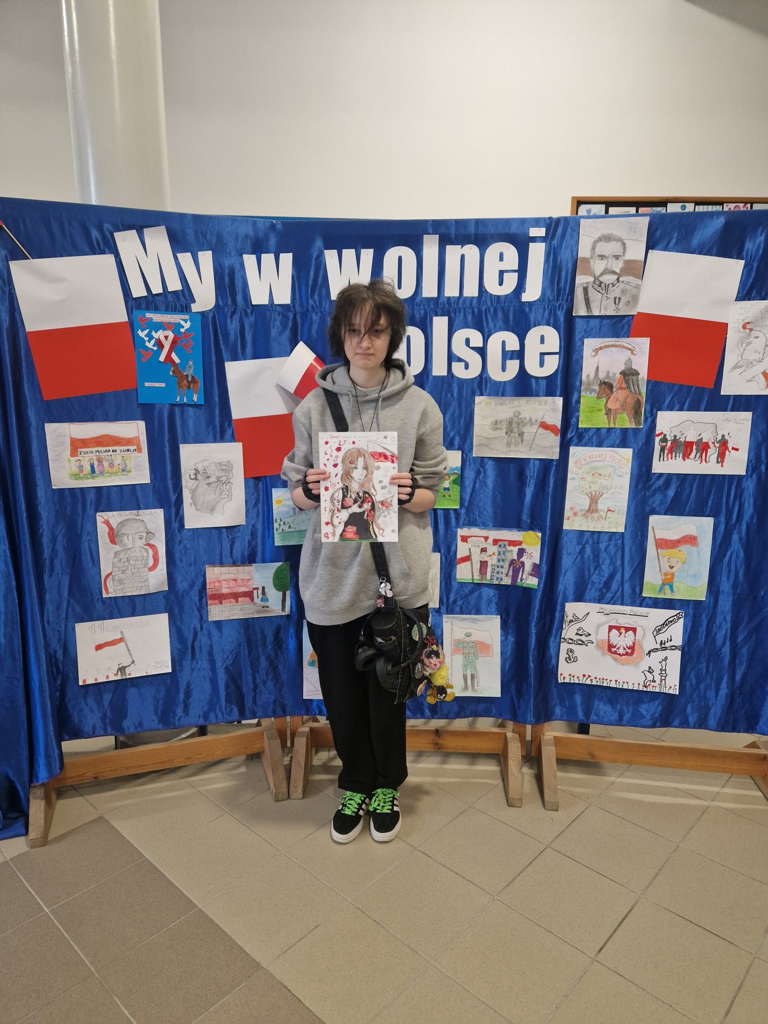 W związku z obchodami 107 rocznicy Odzyskania Niepodległości uczniowie naszej szkoły wzięli udział w konkursie plastyczno – historycznym pt. „My w wolnej Polsce!”, zorganizowanym przez historyka, p. Pawła Felczaka i polonistę, p. Aldonę Owczarek. Łącznie zebraliśmy 86 prac, a najciekawsze, najbardziej pomysłowe i najefektowniej wykonane zaprezentowaliśmy w formie wystawy na korytarzu wraz z wyłonieniem zwycięzców i osób wyróżnionych. I tak jury pozaszkolne zadecydowało, iż nagrodzi: