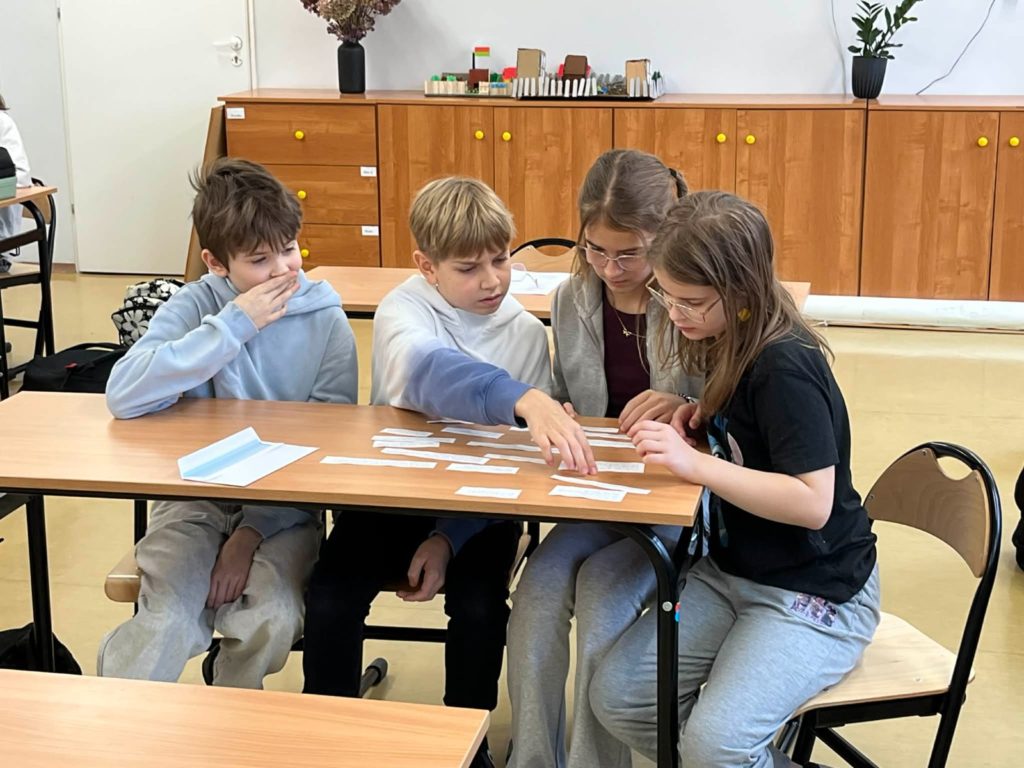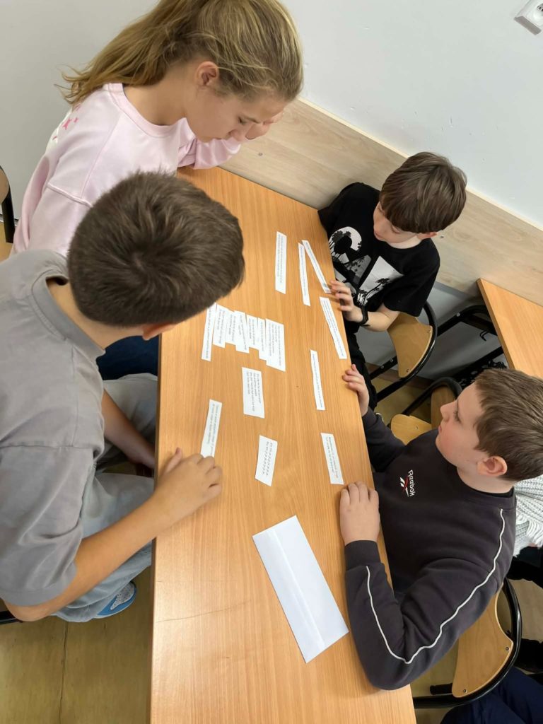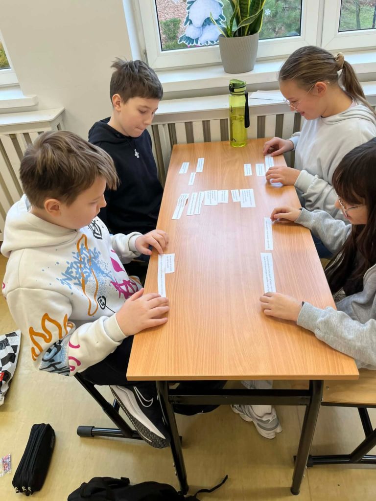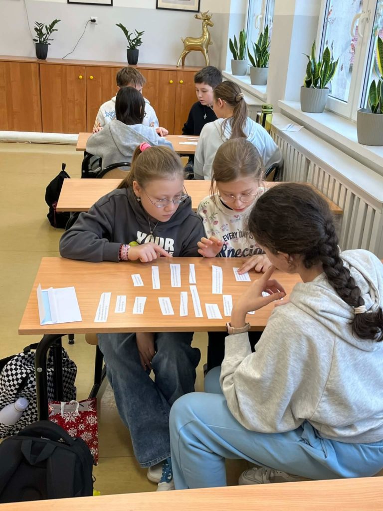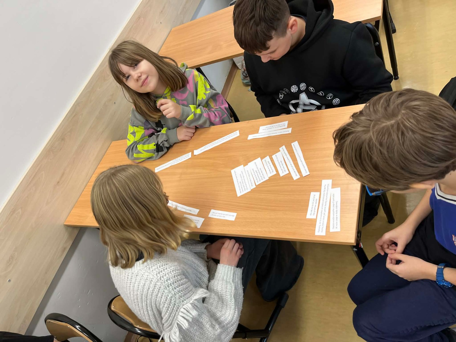 W drugiej części zajęć uczniowie pracowali z piosenką Damiana Syjofana „Kto siłę ma”. Najpierw wysłuchali utworu, a następnie mieli za zadanie ułożyć jego fragmenty we właściwej kolejności. Ćwiczenie to sprzyjało koncentracji i dokładnemu wsłuchaniu się w przekaz piosenki. Kolejnym etapem była praca w grupach – uczniowie analizowali tekst, wyciągali wnioski oraz dzielili się swoimi spostrzeżeniami na temat tego, czym jest wewnętrzna siła i jakie cechy pomagają nam pokonywać trudności.