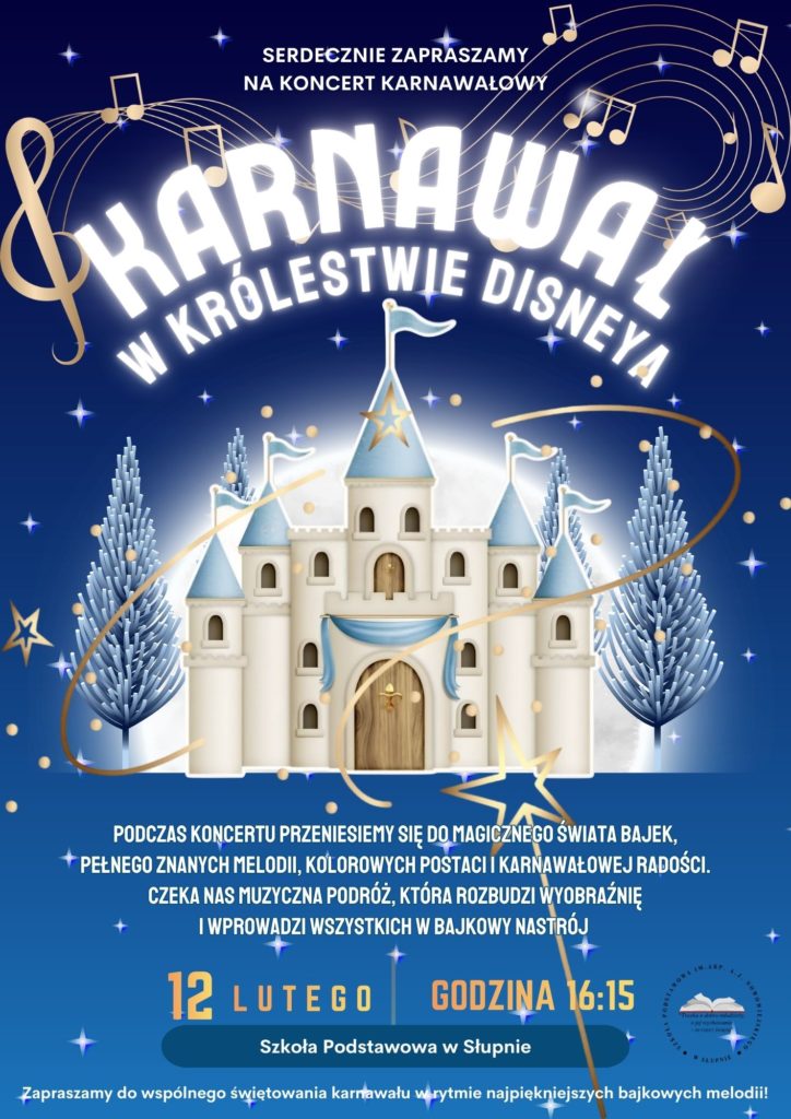 Serdecznie zapraszamy całą społeczność szkolną na Koncert Karnawałowy „Karnawał w Królestwie Disneya”, który odbędzie się 12 lutego o godz. 16:15 w Naszej szkole.