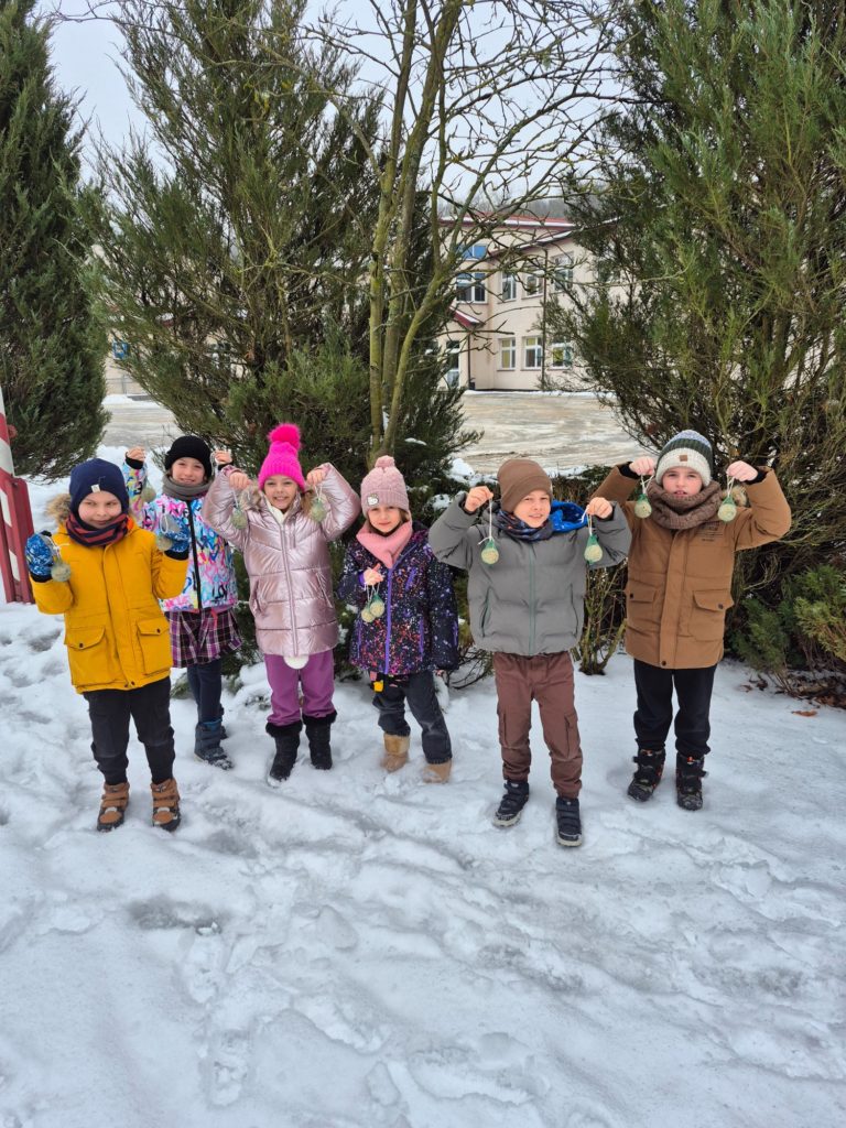 📸Na zdjęciach widoczni są uczniowie klasy 1A, którzy razem ze swoją wychowawczynią Martą Szulczewską  z ogromnym zaangażowaniem wieszają na gałązkach „kulki mocy” czyli zdrowe nasionka – pełnowartościowe przekąski i pożywienie dla wszystkich ptaszków przylatujących w okolice naszej szkoły. 🍯🌰