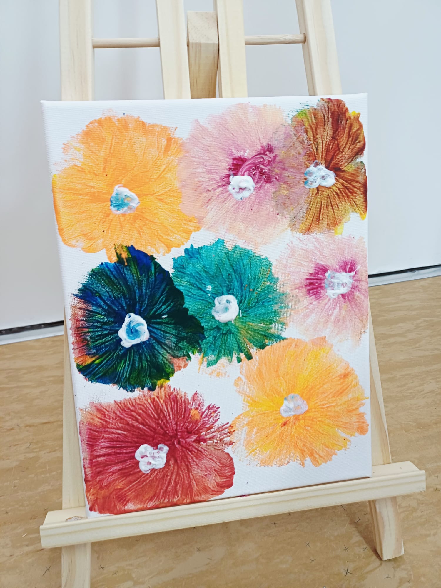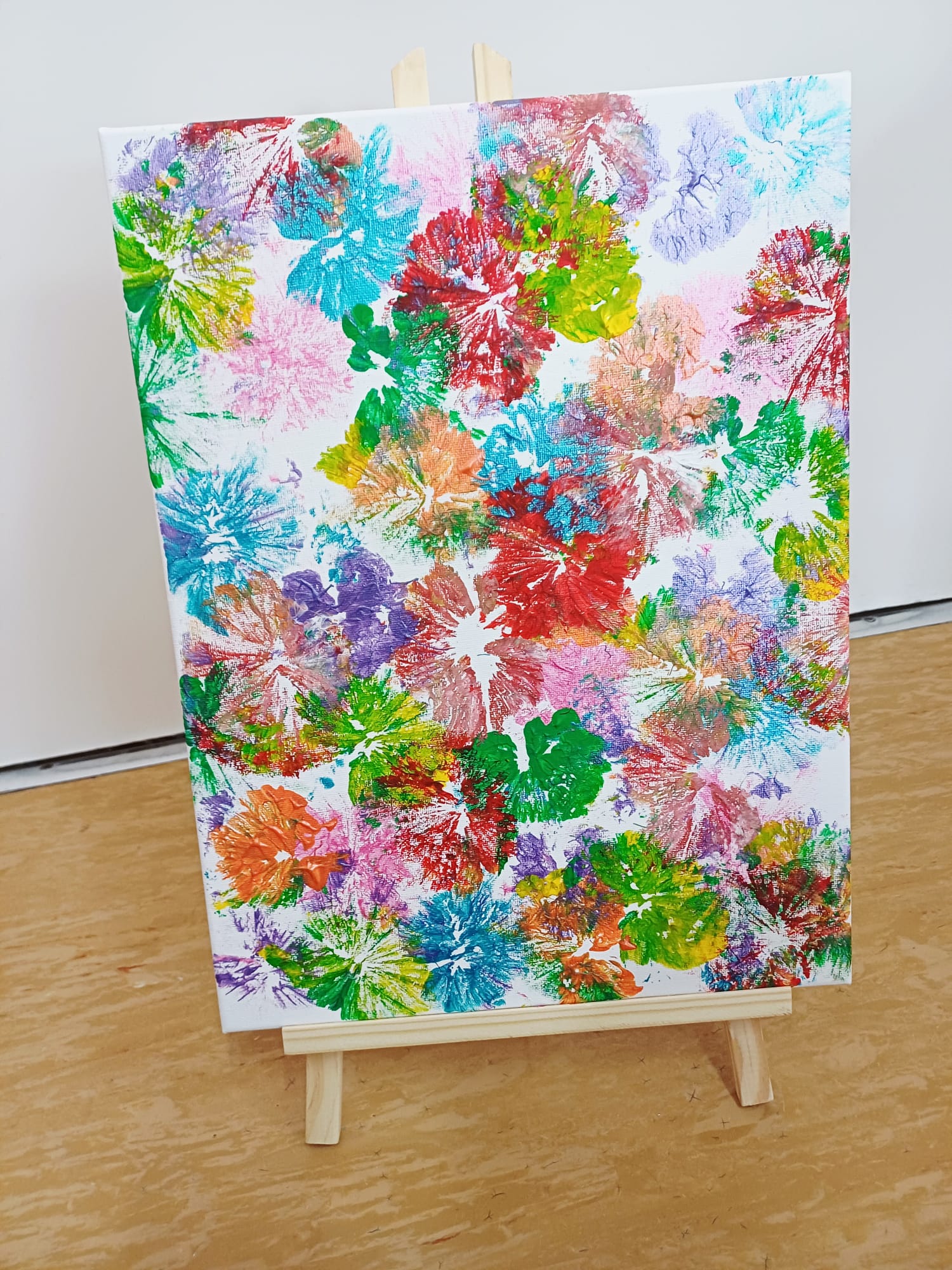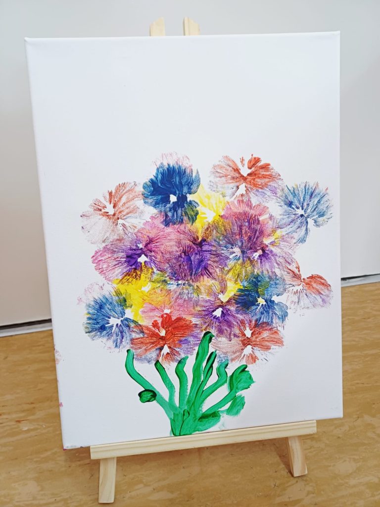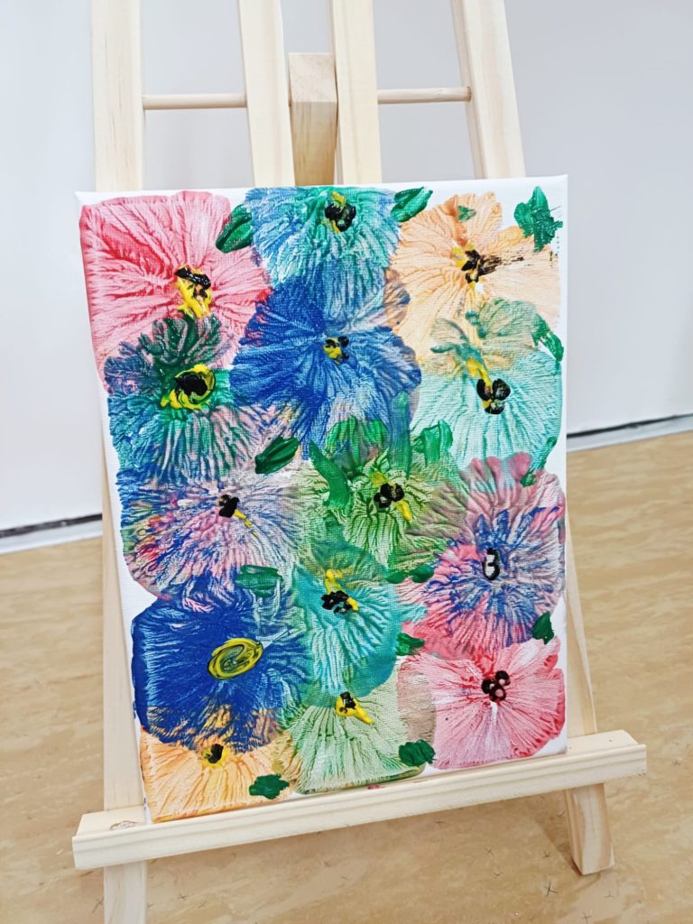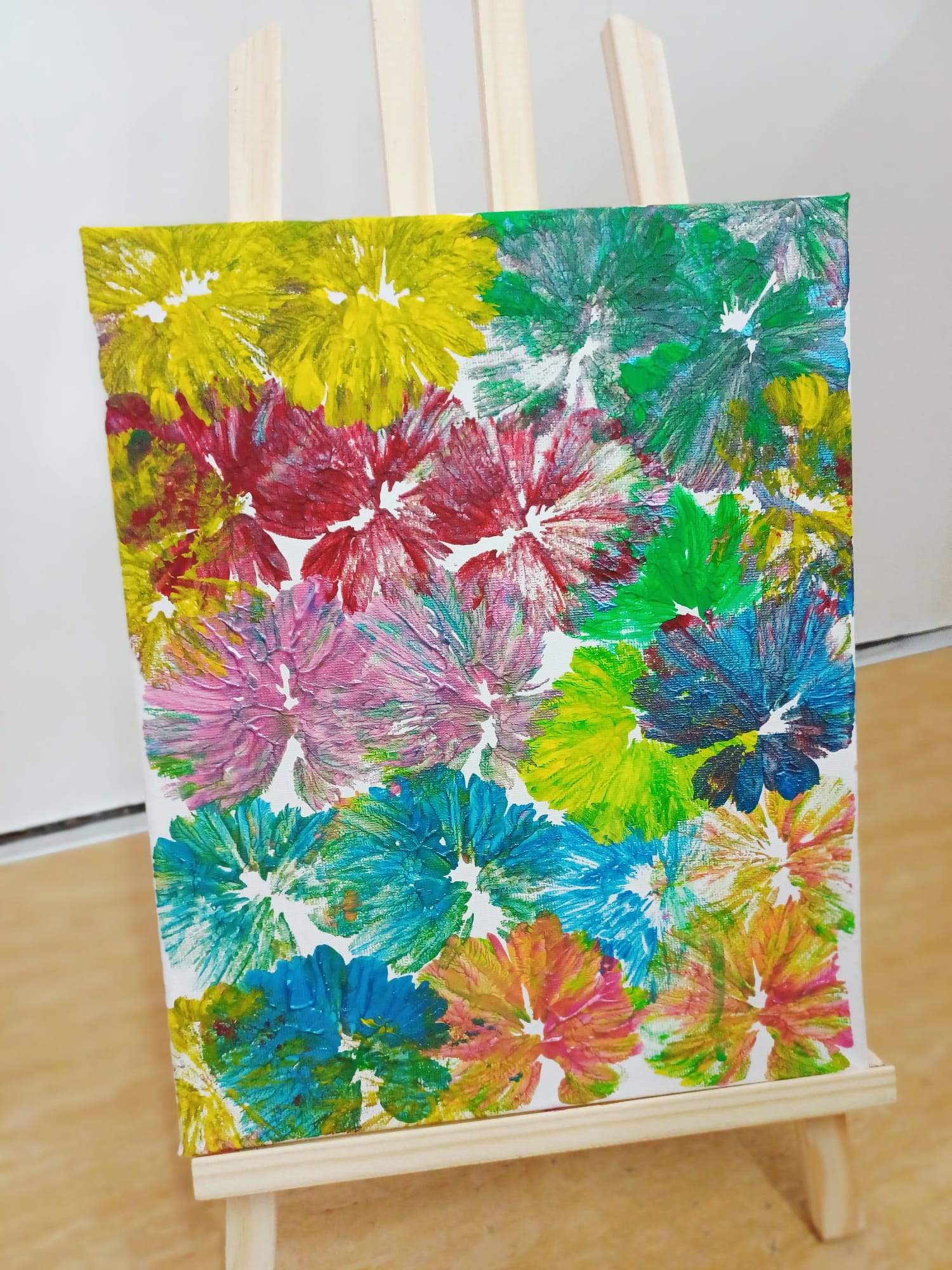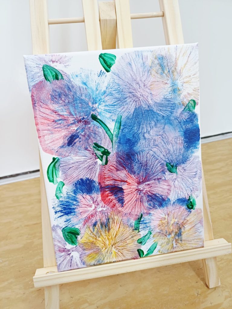 W ten sposób powstawały niepowtarzalne odbitki o ciekawych fakturach i kształtach, przypominające barwne, puszyste kwiaty. Każdy odcisk był inny, co sprawiło, że wszystkie prace są wyjątkowe i jedyne w swoim rodzaju.