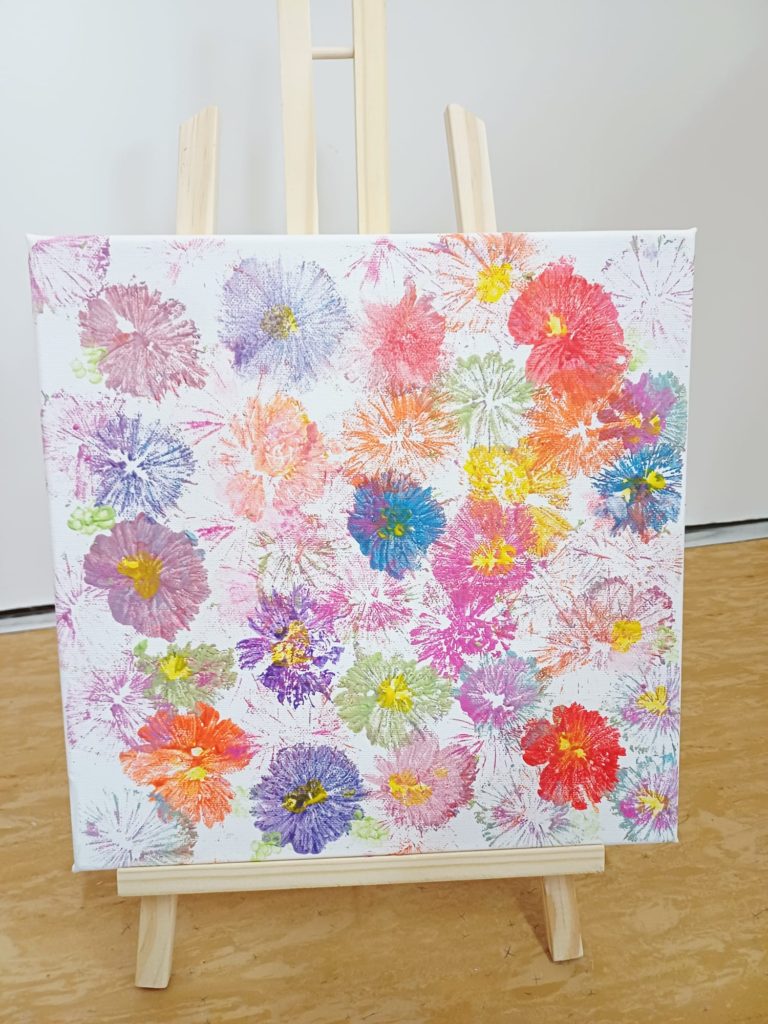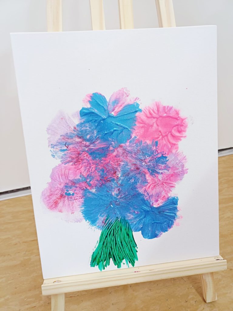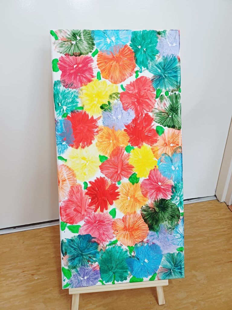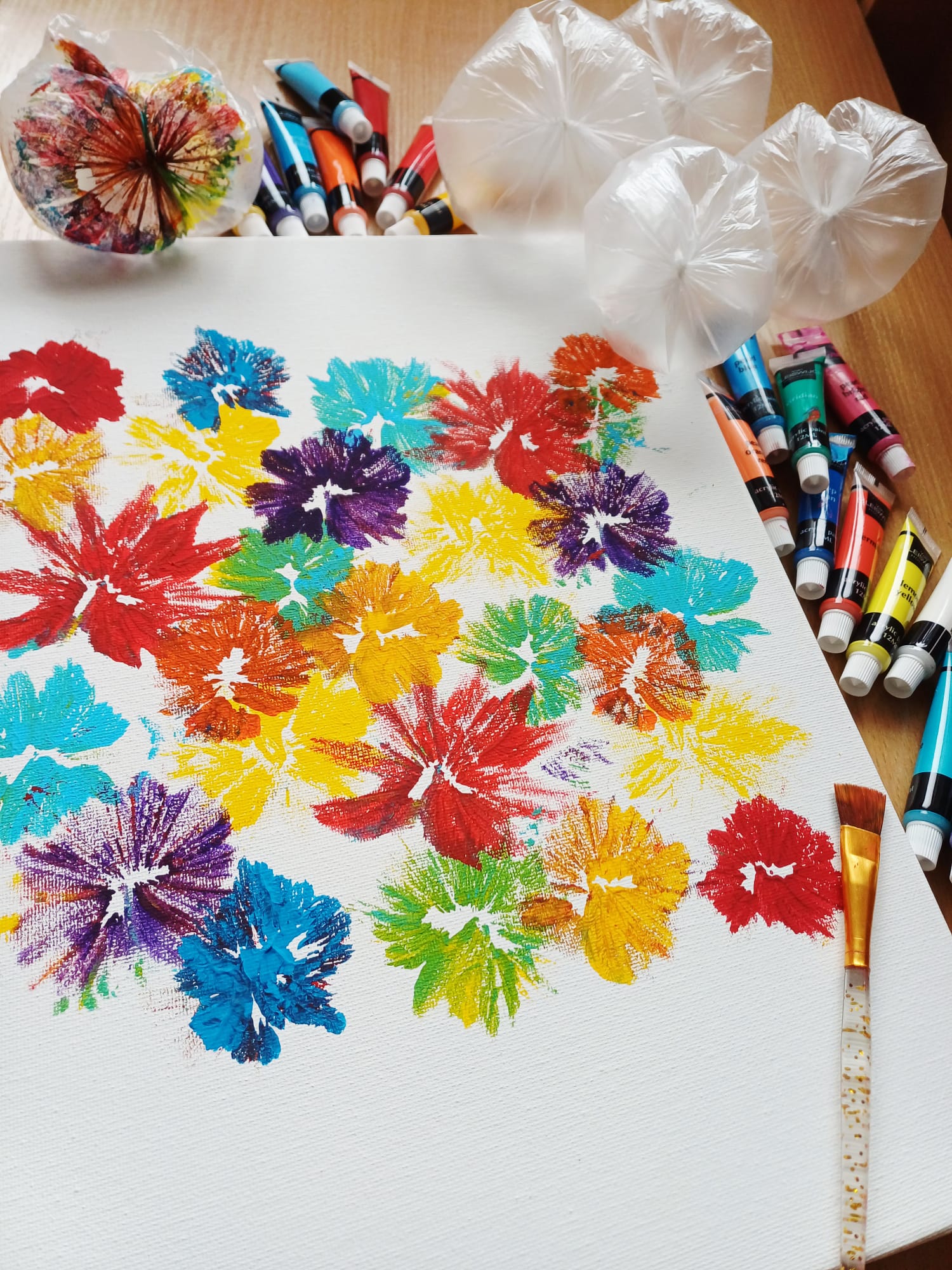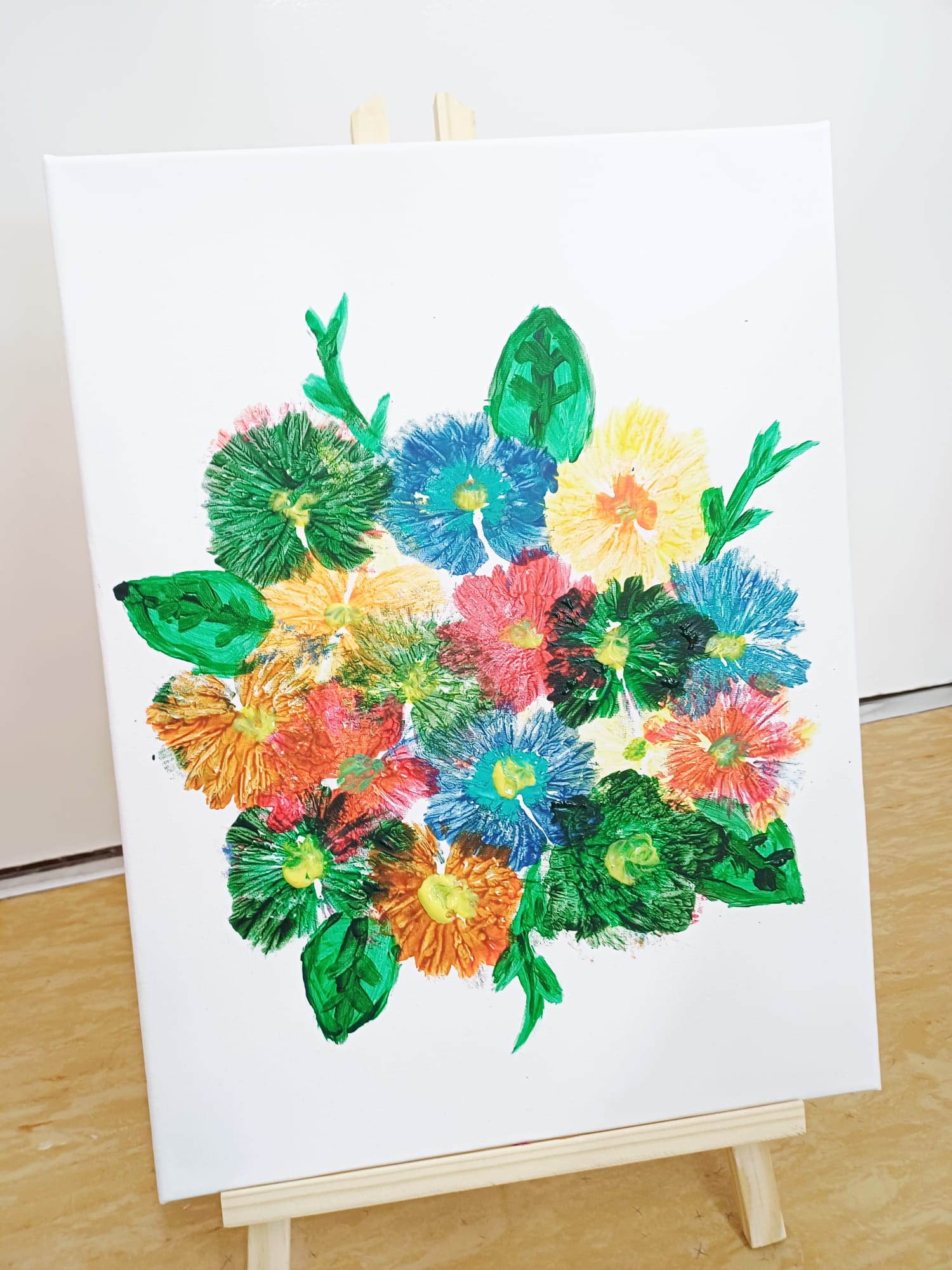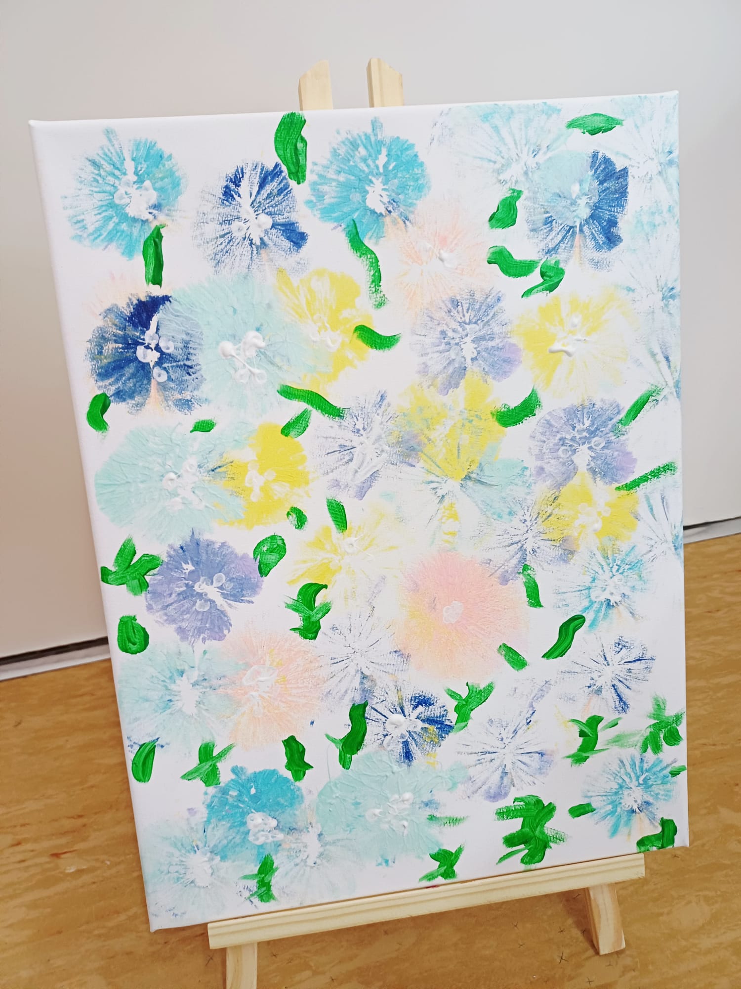 W ten sposób powstawały niepowtarzalne odbitki o ciekawych fakturach i kształtach, przypominające barwne, puszyste kwiaty. Każdy odcisk był inny, co sprawiło, że wszystkie prace są wyjątkowe i jedyne w swoim rodzaju.