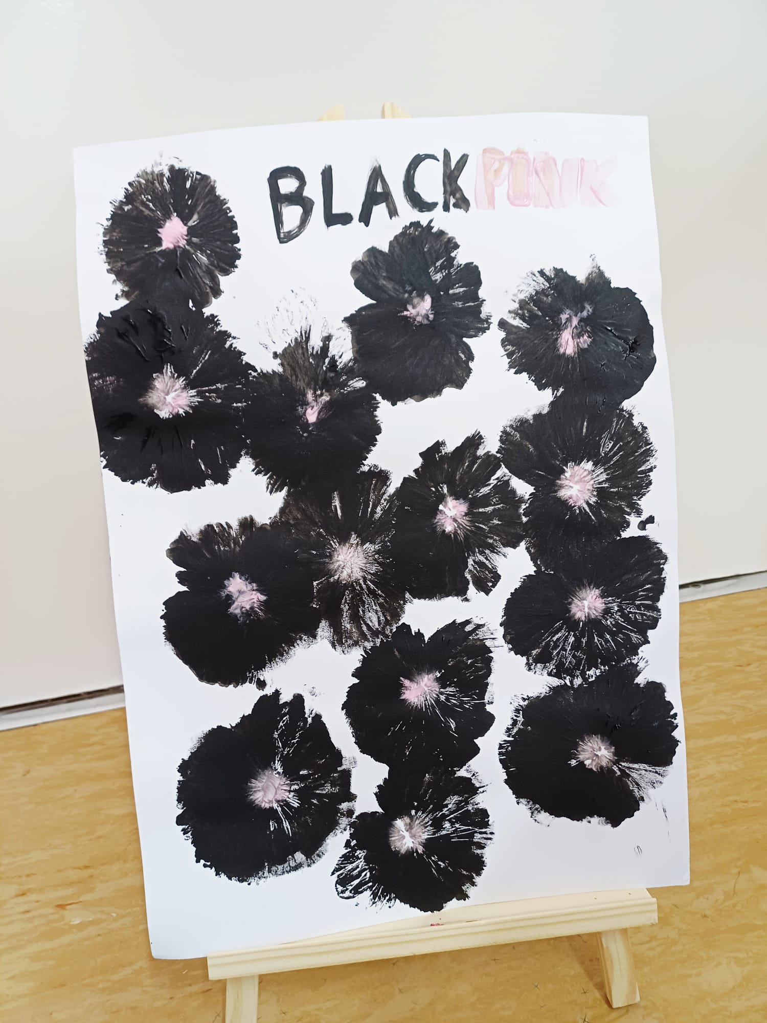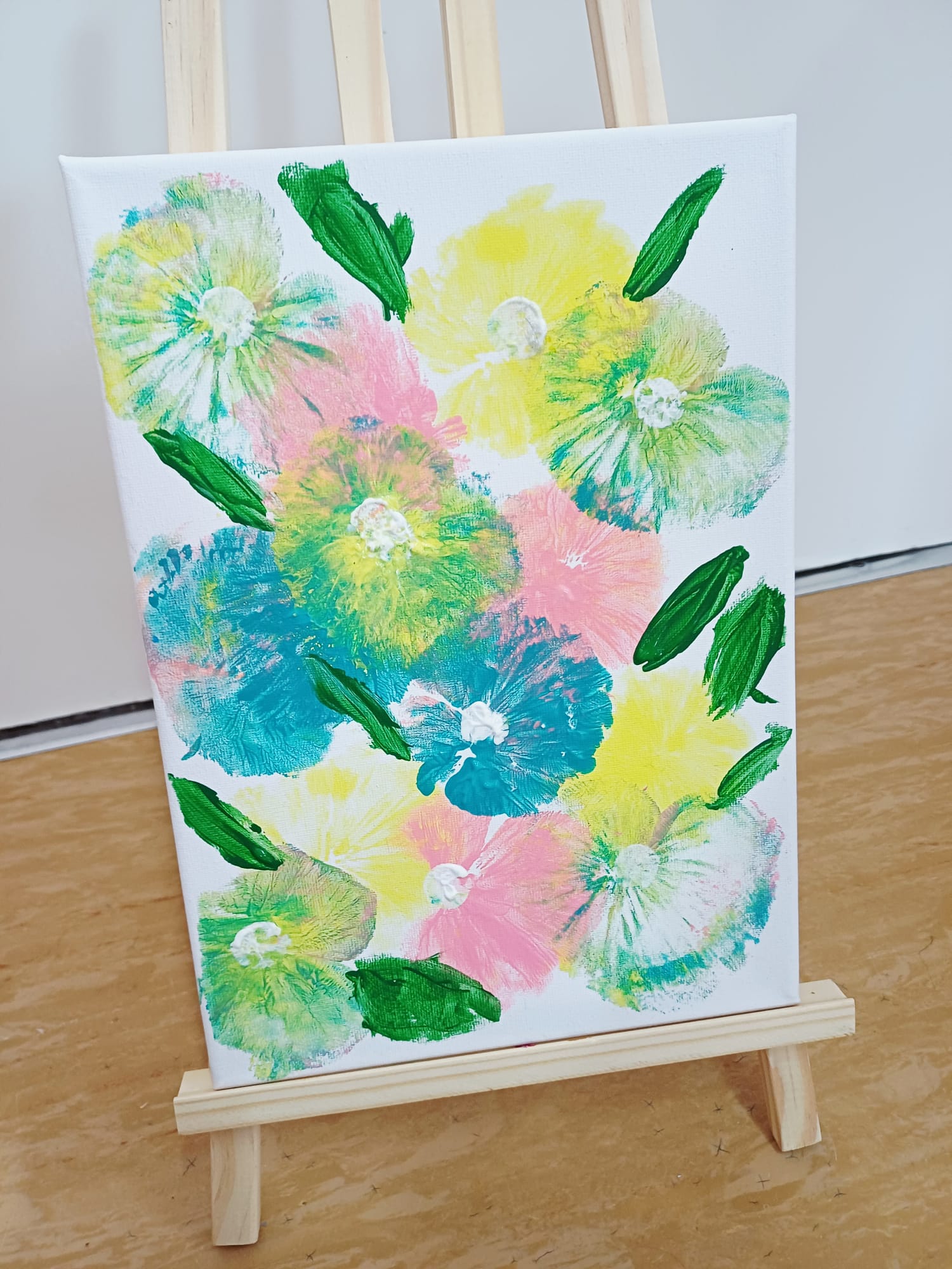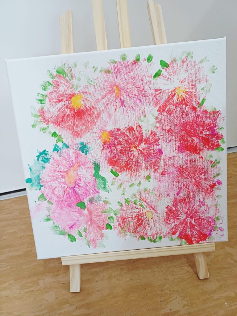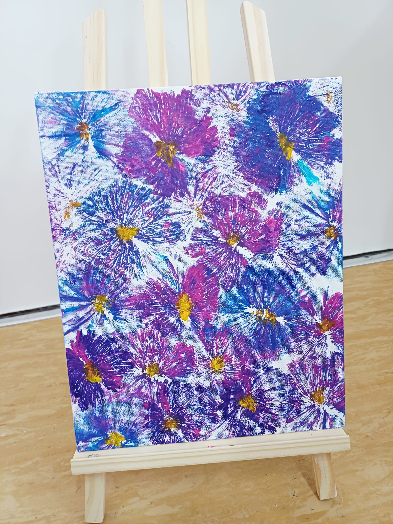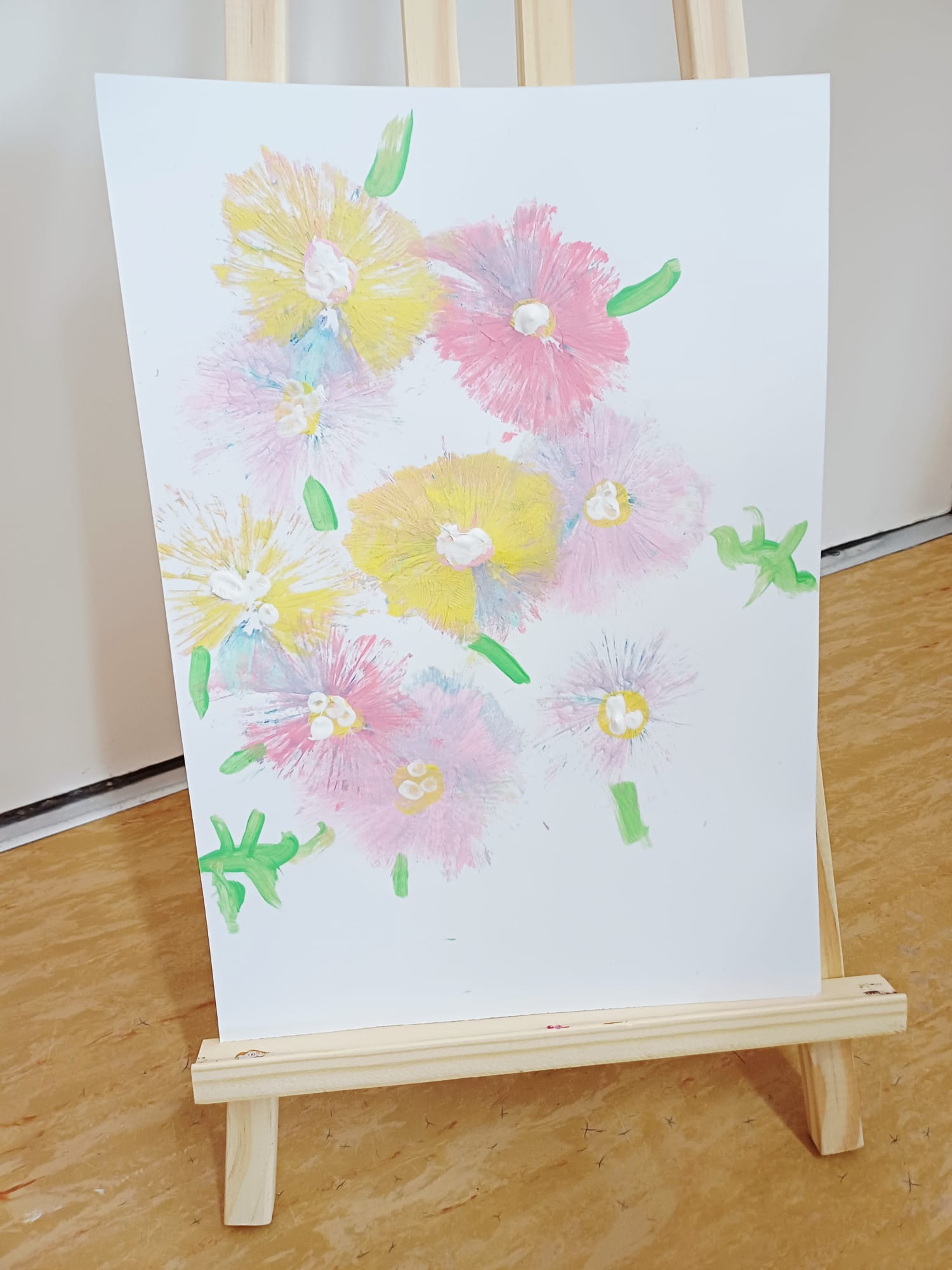 W ten sposób powstawały niepowtarzalne odbitki o ciekawych fakturach i kształtach, przypominające barwne, puszyste kwiaty. Każdy odcisk był inny, co sprawiło, że wszystkie prace są wyjątkowe i jedyne w swoim rodzaju.