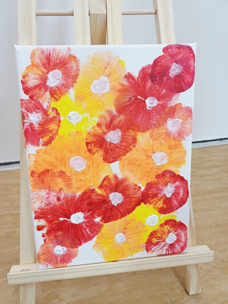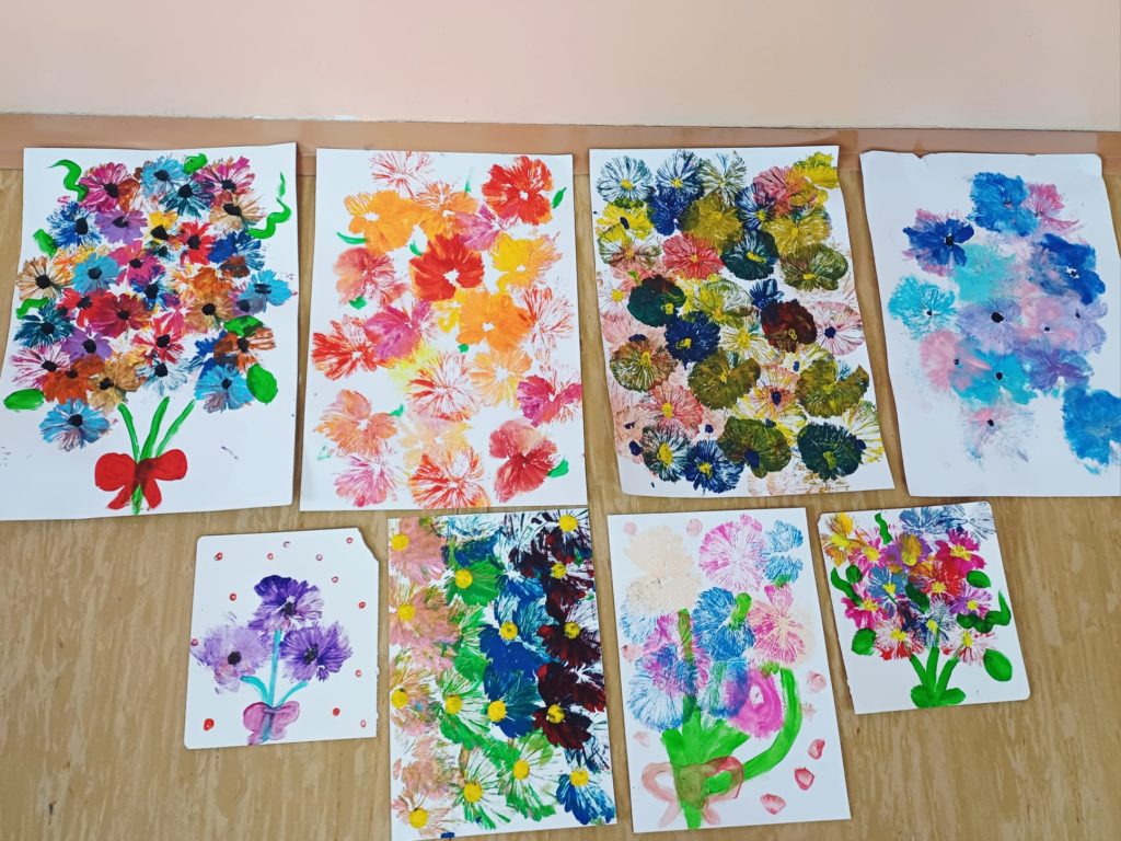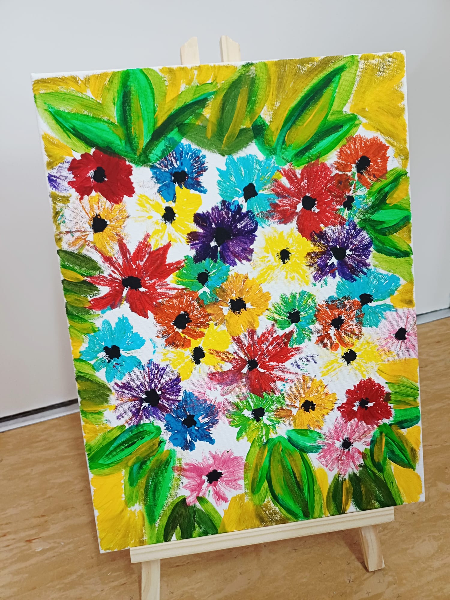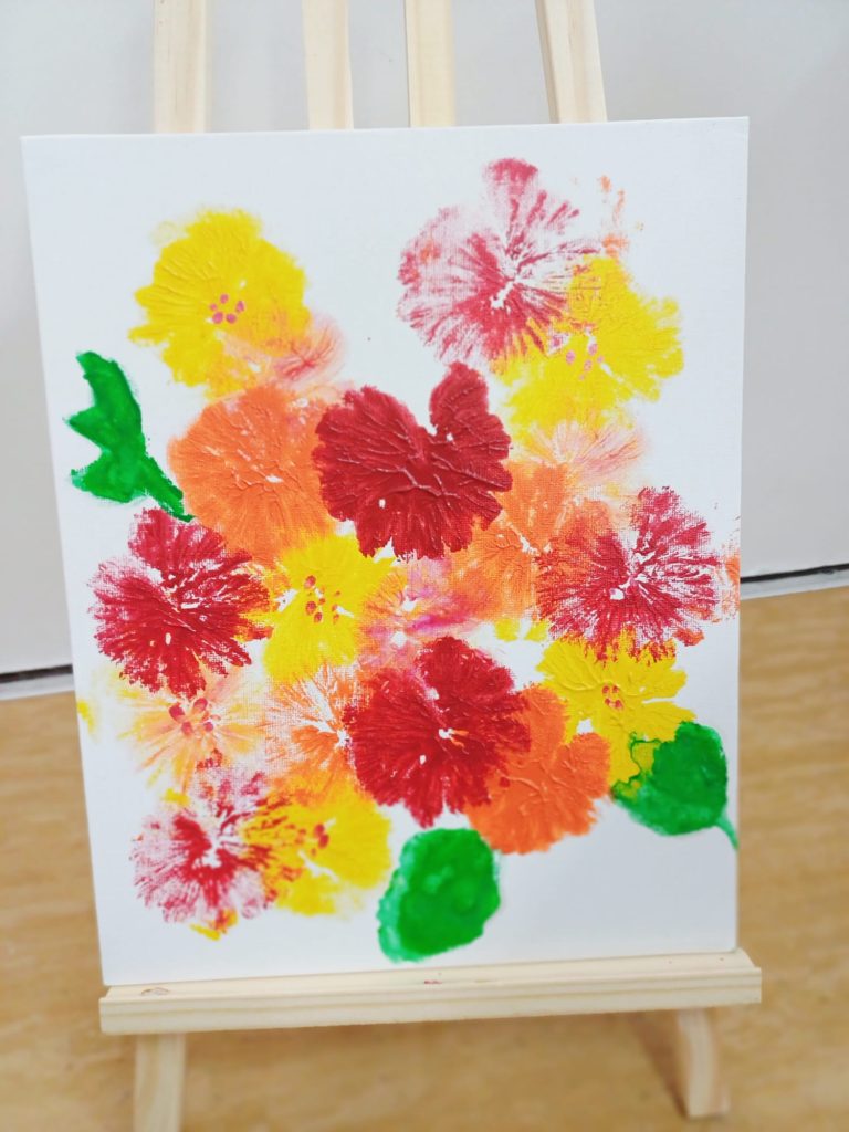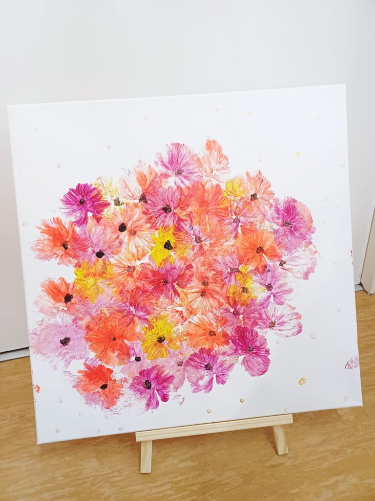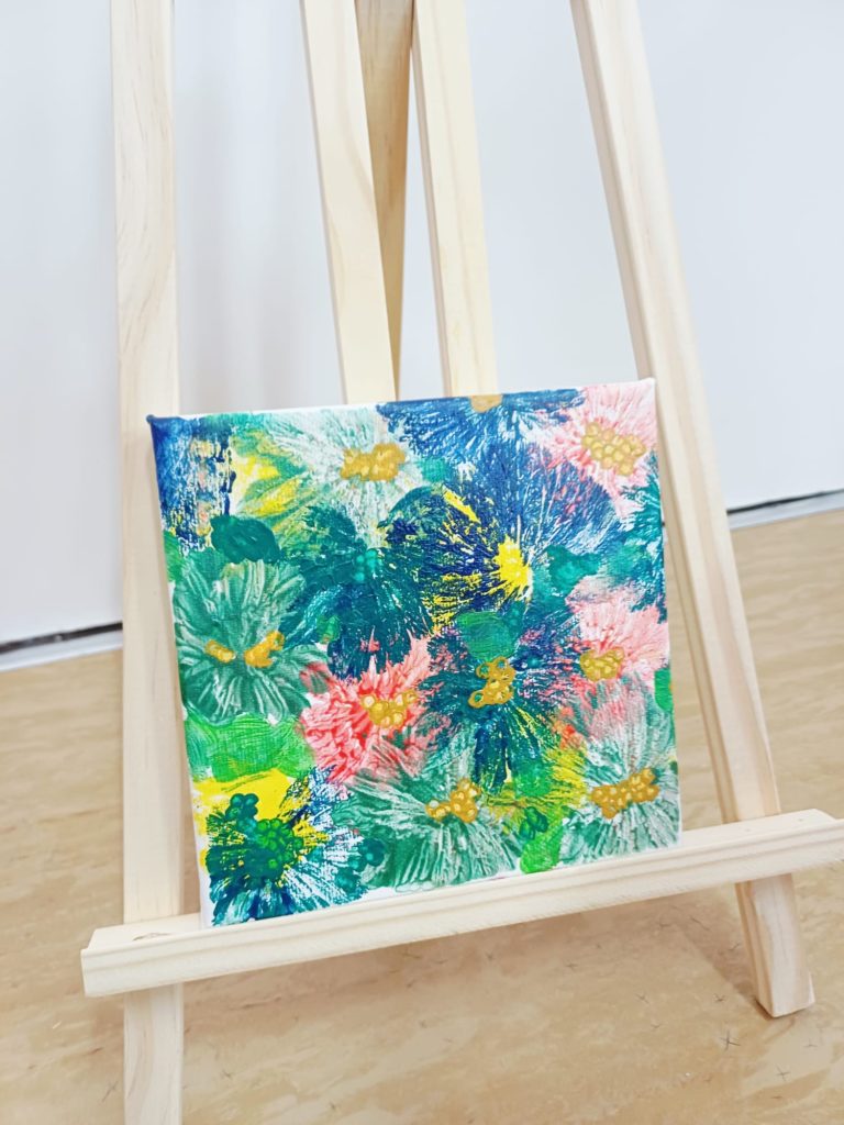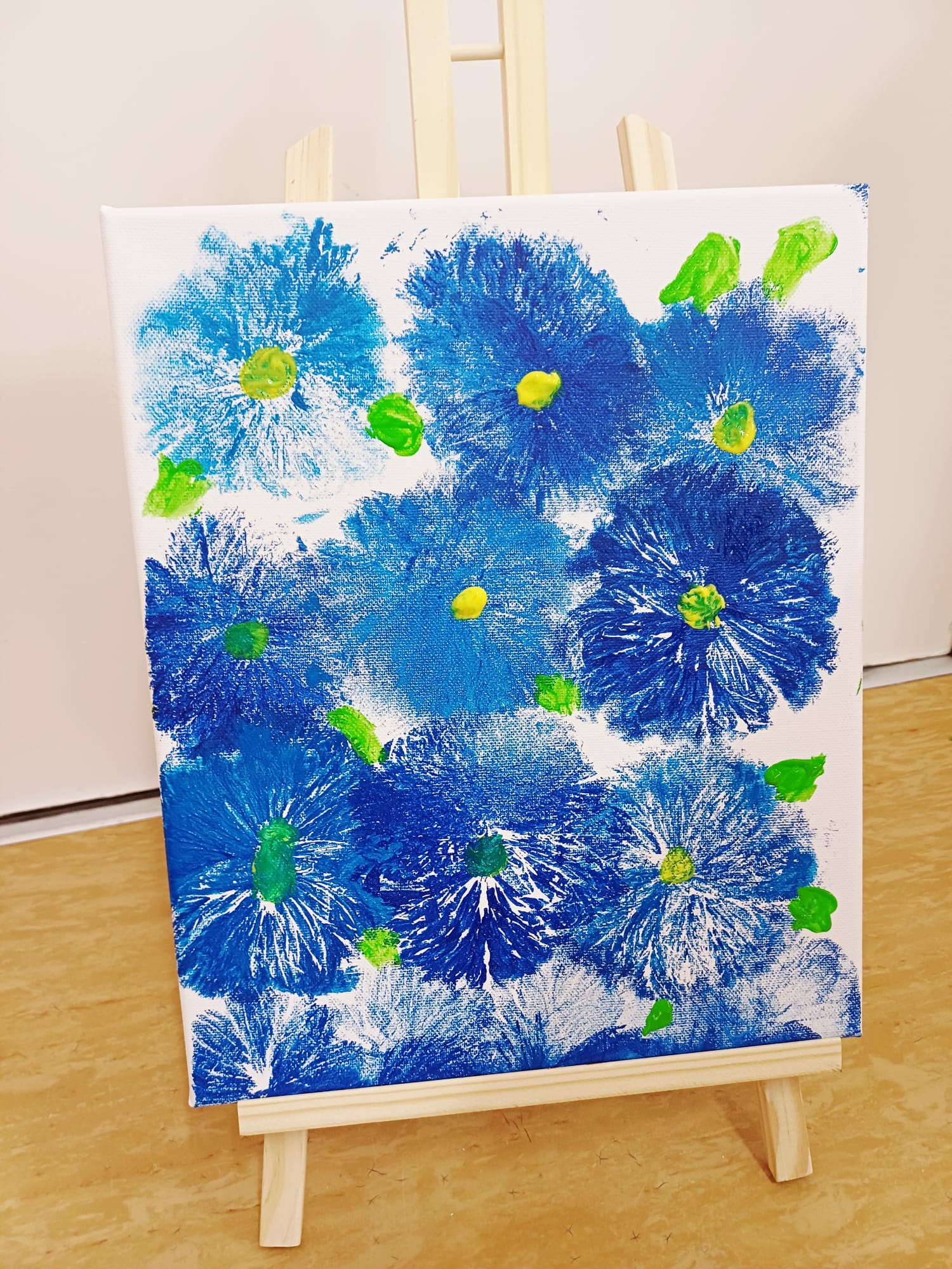 W ten sposób powstawały niepowtarzalne odbitki o ciekawych fakturach i kształtach, przypominające barwne, puszyste kwiaty. Każdy odcisk był inny, co sprawiło, że wszystkie prace są wyjątkowe i jedyne w swoim rodzaju.