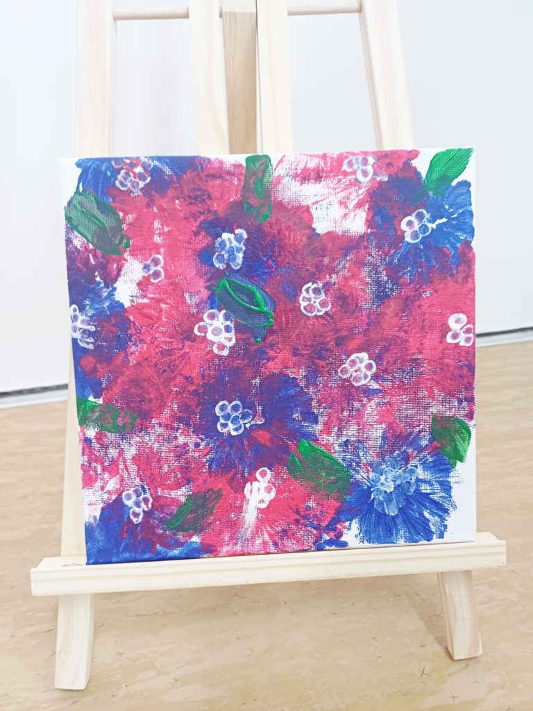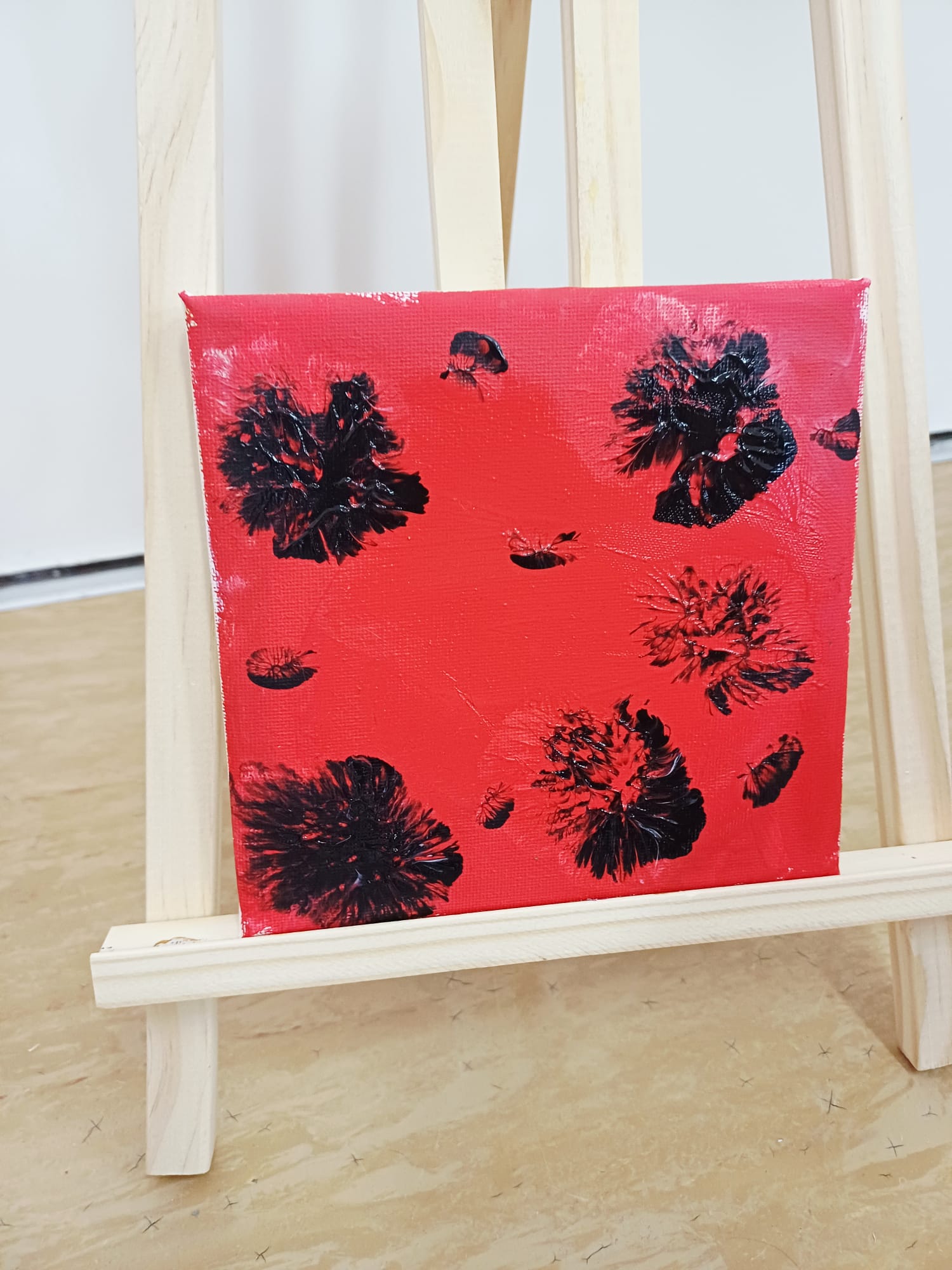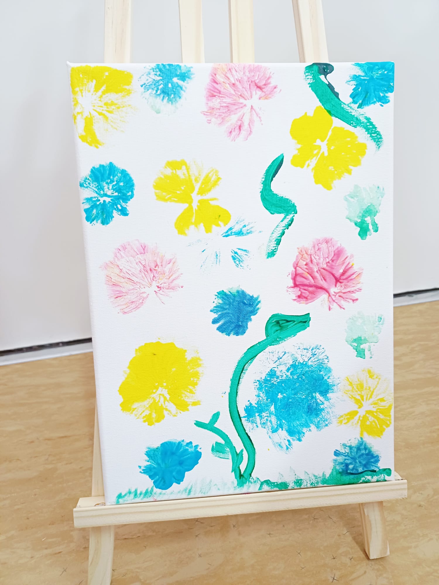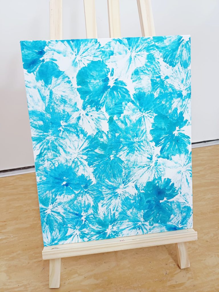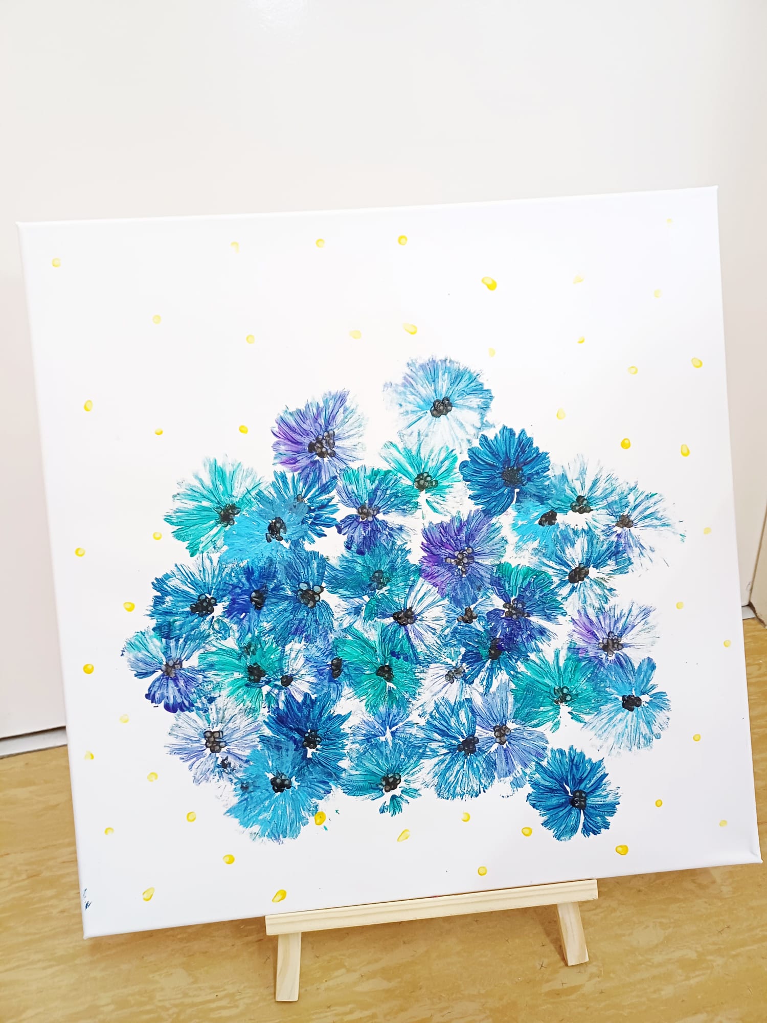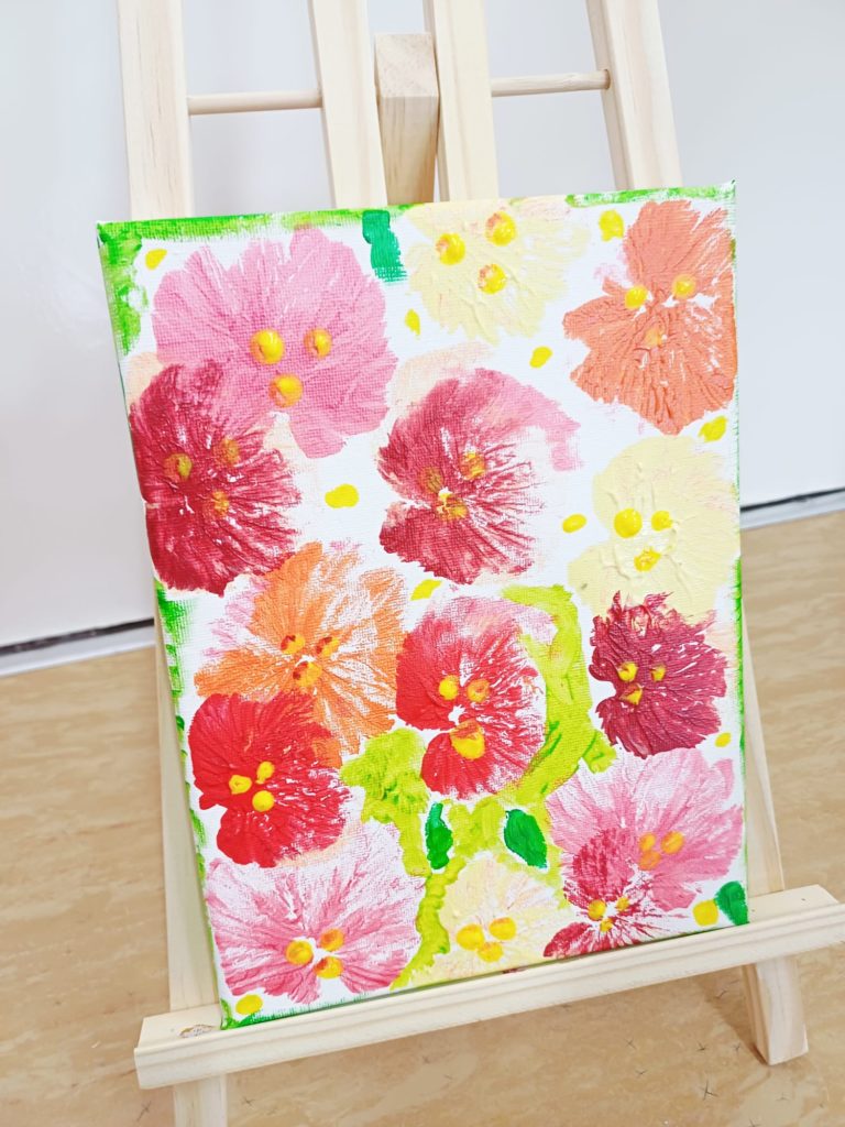 W ten sposób powstawały niepowtarzalne odbitki o ciekawych fakturach i kształtach, przypominające barwne, puszyste kwiaty. Każdy odcisk był inny, co sprawiło, że wszystkie prace są wyjątkowe i jedyne w swoim rodzaju.