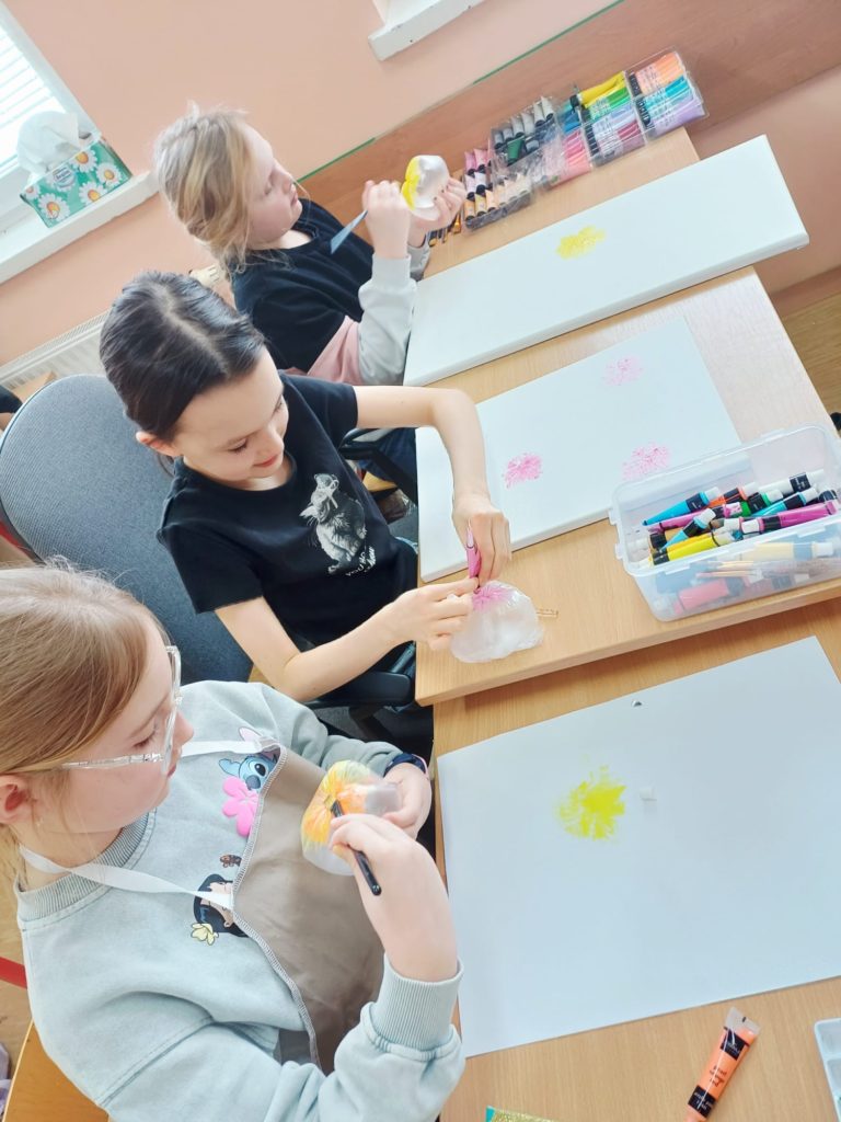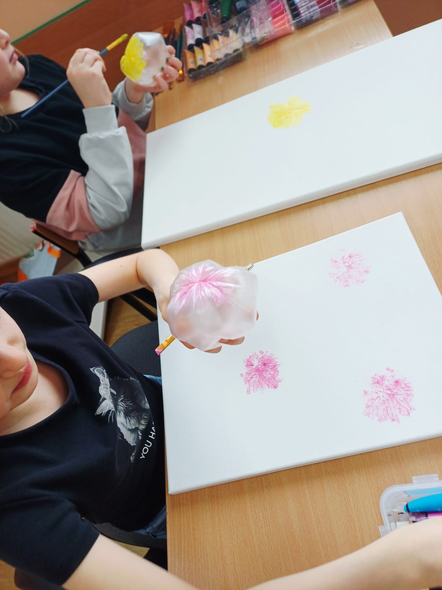 Na zajęciach kółka plastycznego uczniowie mieli okazję spróbować niezwykłej techniki malarskiej, która połączyła zabawę z eksperymentowaniem i prawdziwą sztuką. Dzieci tworzyły obrazy, wykorzystując farby akrylowe oraz… woreczki śniadaniowe.