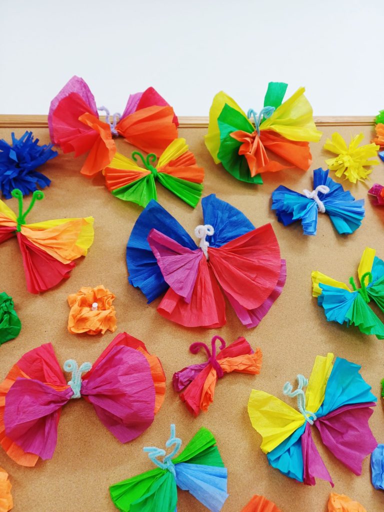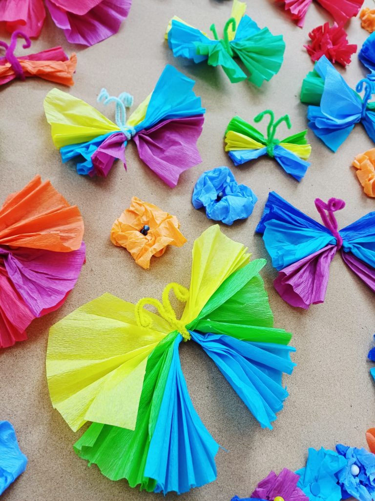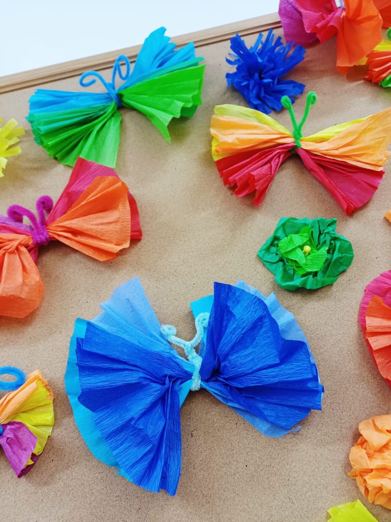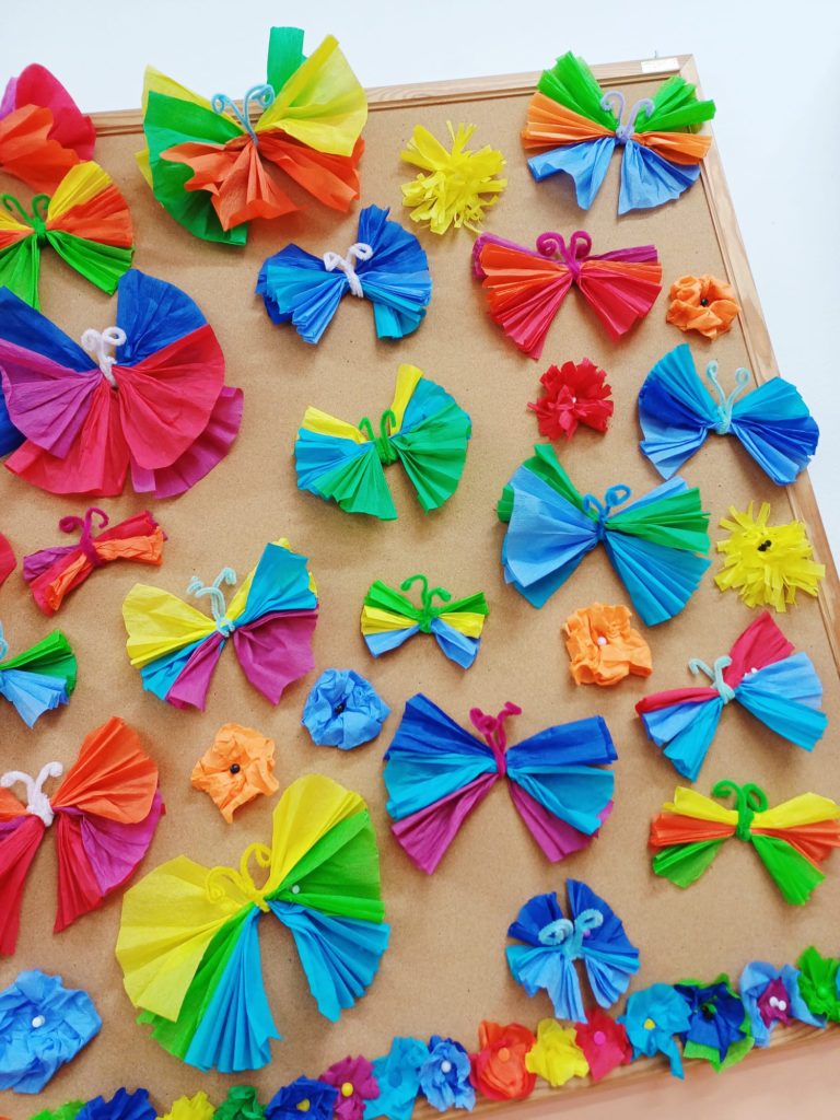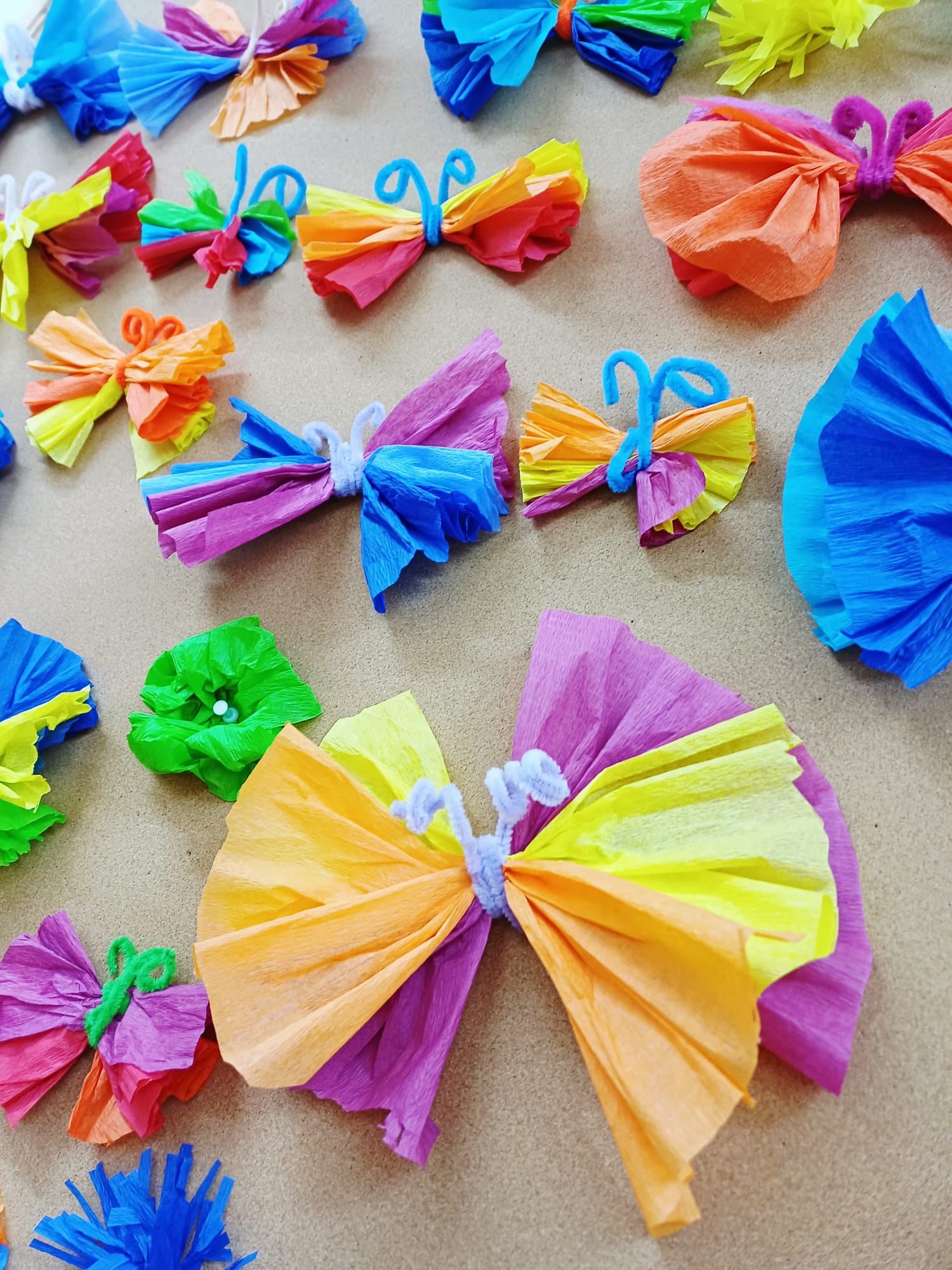 Dzieci tworzyły kolorowe motylki z bibuły. Z wielkim zaangażowaniem wycinały i składały swoje prace, dbając o każdy szczegół. Każdy motyl był inny – pełen barw, fantazji i dziecięcej kreatywności.