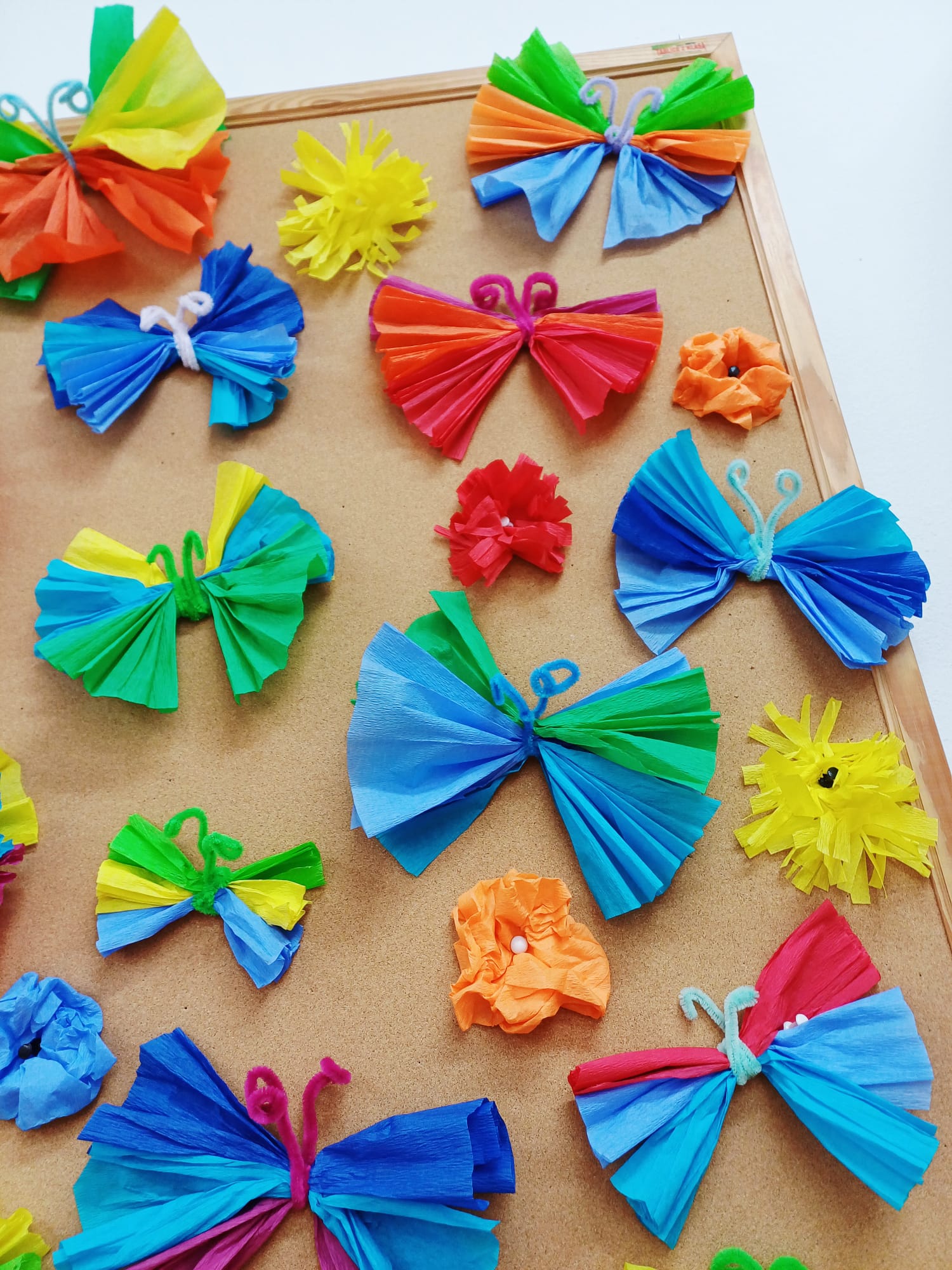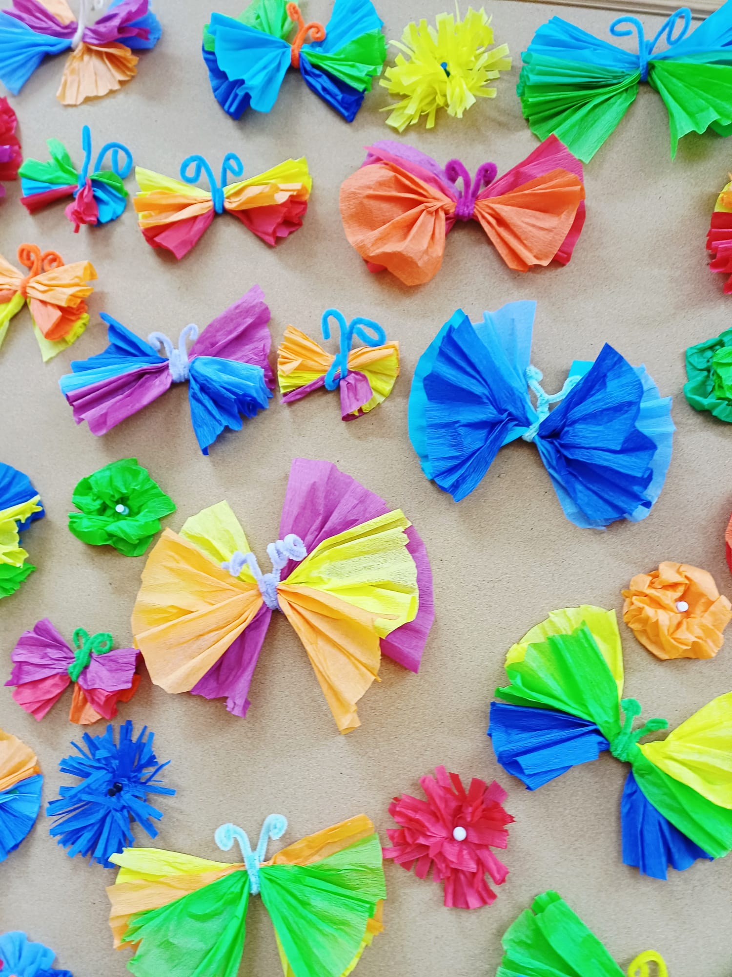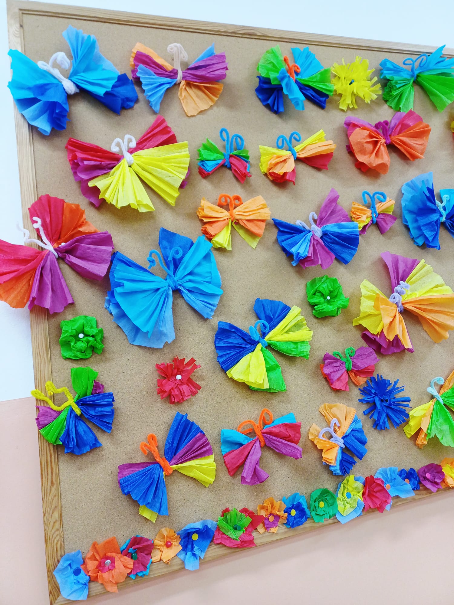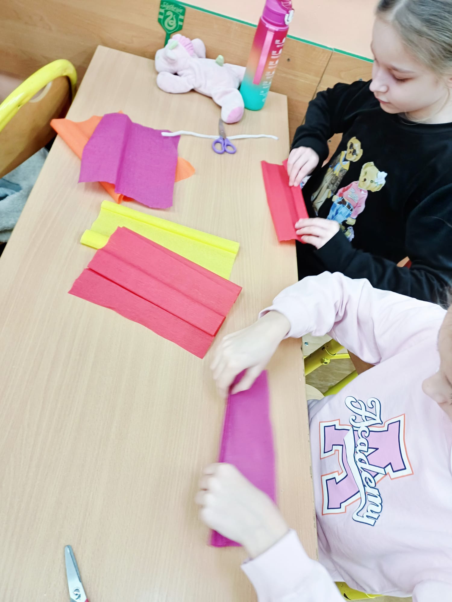 Dzieci tworzyły kolorowe motylki z bibuły. Z wielkim zaangażowaniem wycinały i składały swoje prace, dbając o każdy szczegół. Każdy motyl był inny – pełen barw, fantazji i dziecięcej kreatywności.