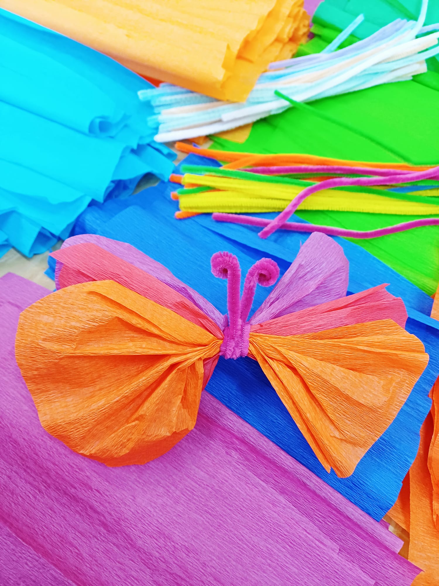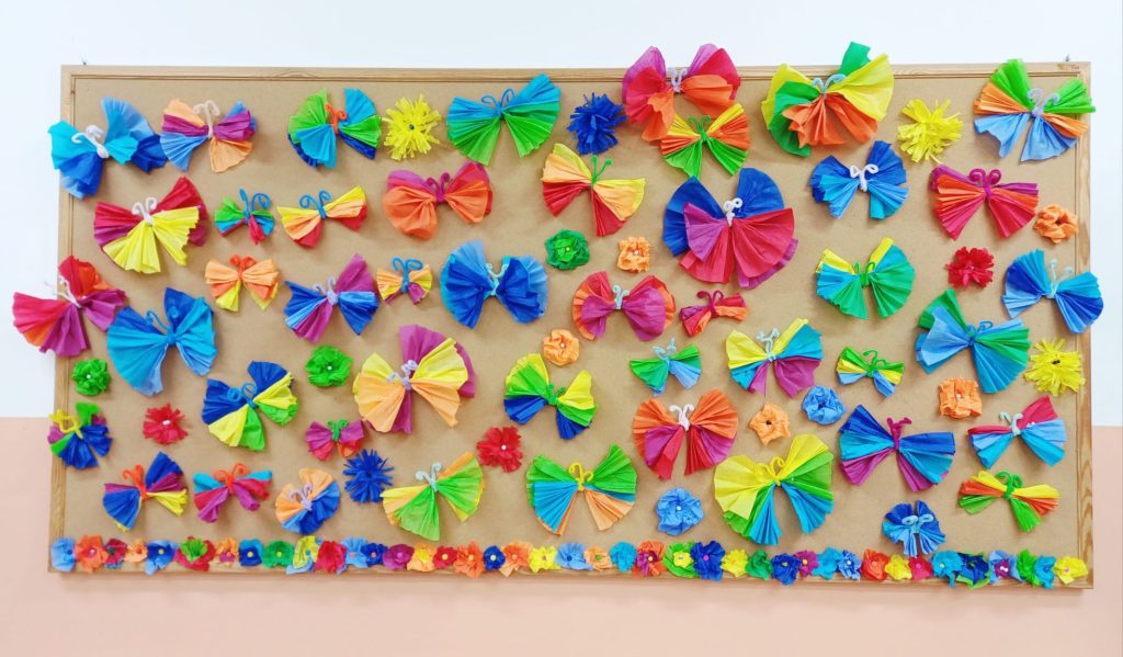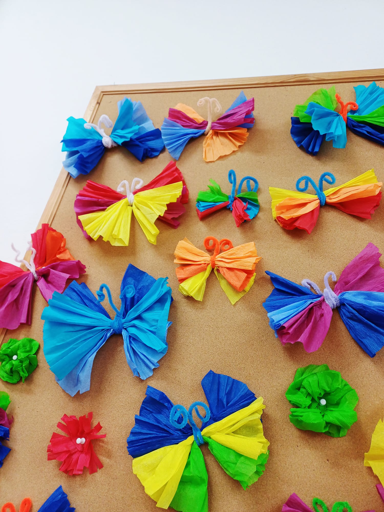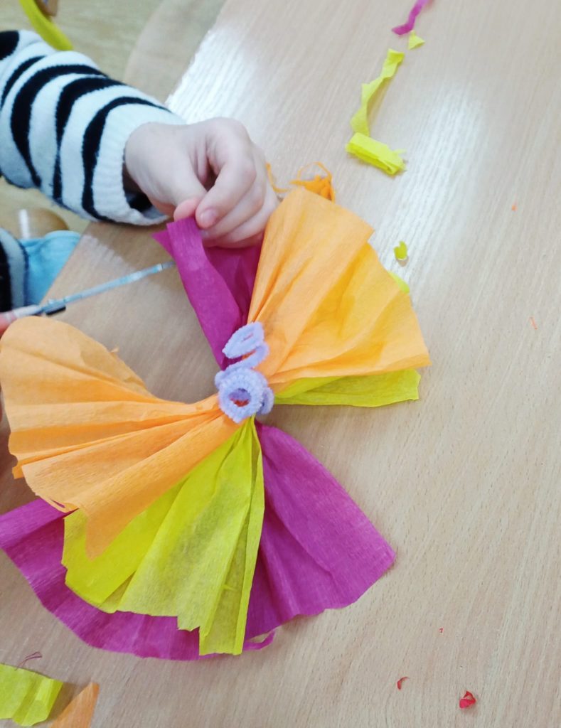 Dzieci tworzyły kolorowe motylki z bibuły. Z wielkim zaangażowaniem wycinały i składały swoje prace, dbając o każdy szczegół. Każdy motyl był inny – pełen barw, fantazji i dziecięcej kreatywności.