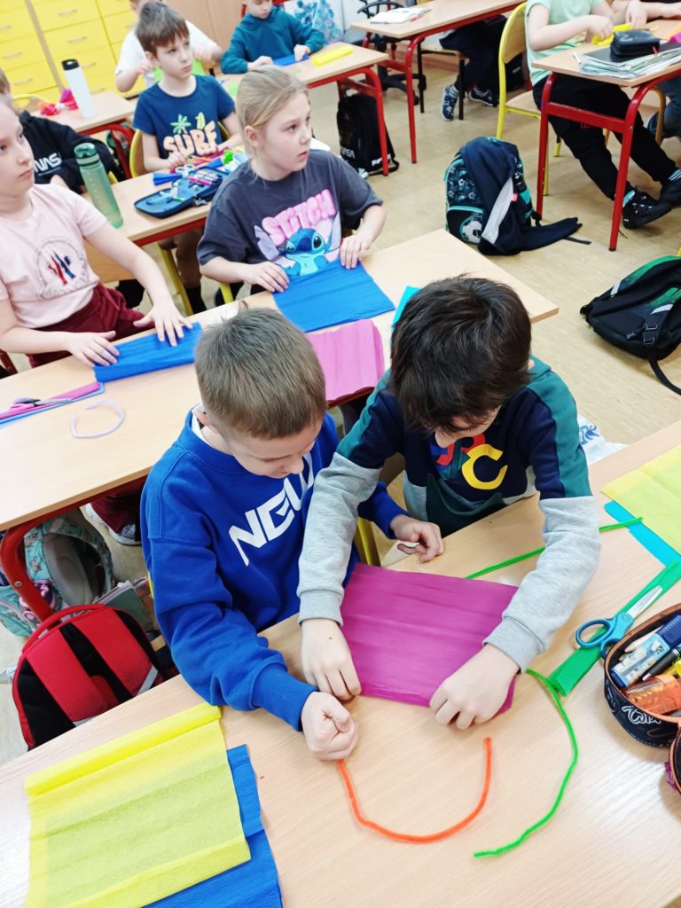 Wraz ze zbliżającą się wiosną uczniowie klasy 2b coraz częściej rozmawiają o cieplejszych dniach, słońcu i budzącej się do życia przyrodzie. Wszyscy z utęsknieniem czekają na pierwsze oznaki nowej pory roku, dlatego podczas ostatniej lekcji plastyki postanowili wprowadzić do swojej sali odrobinę wiosennego klimatu.