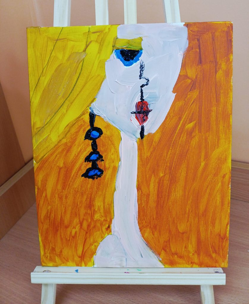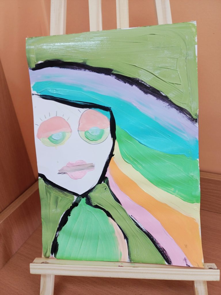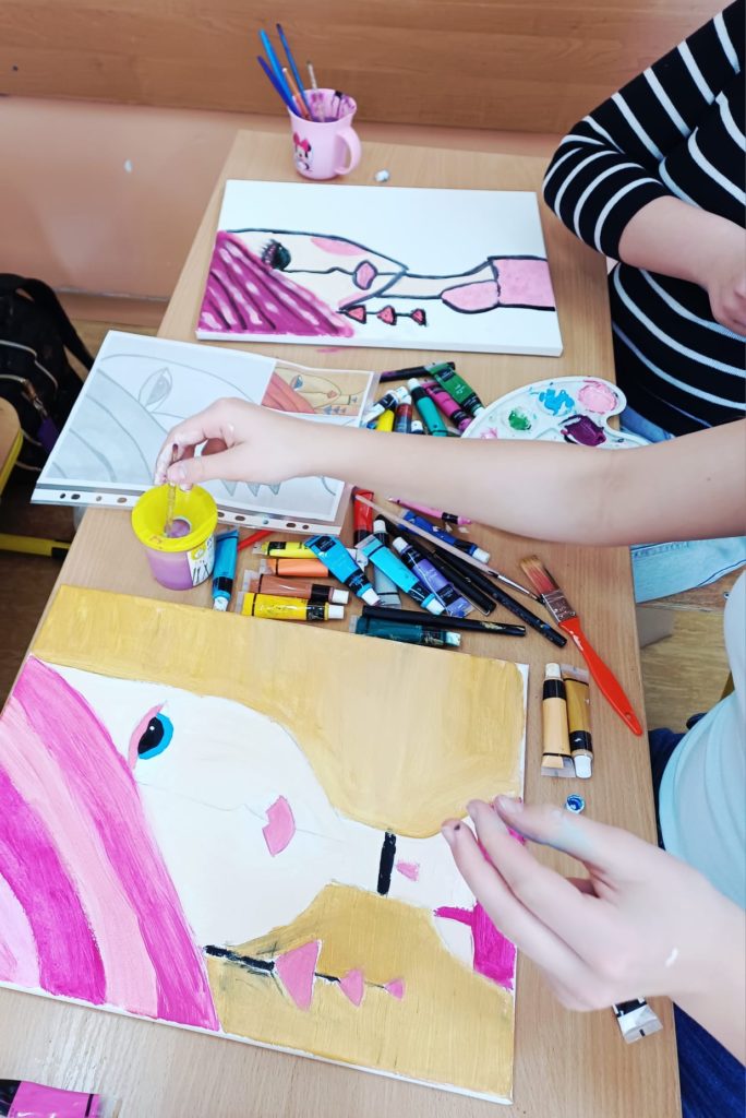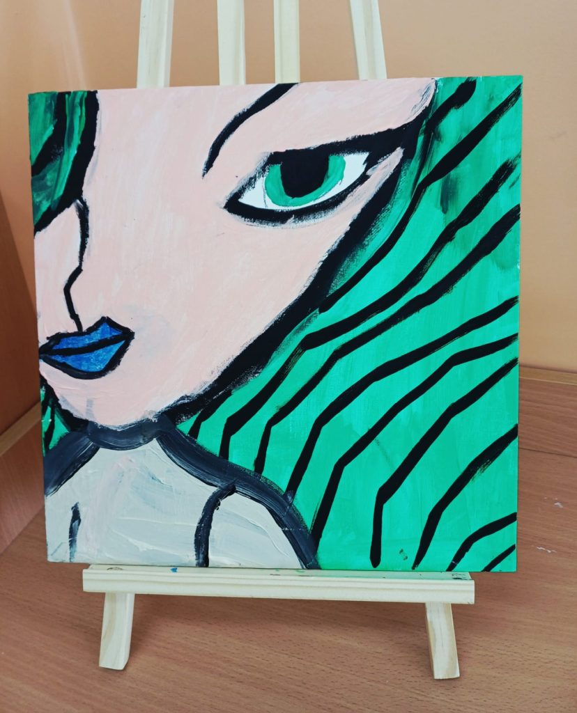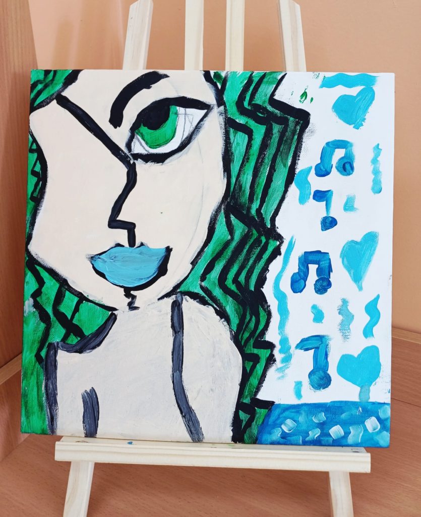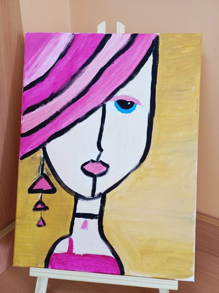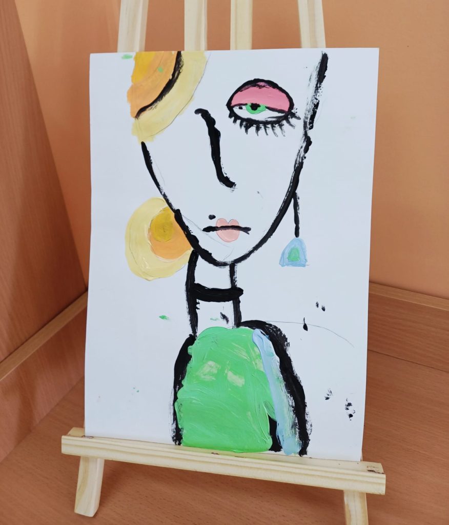 Podczas zajęć kółka plastycznego uczniowie pracowali nad tematem abstrakcyjnej ekspresji na płótnie. Zadanie polegało na stworzeniu portretów z wykorzystaniem wyrazistego, mocnego obrysu, który nadaje postaciom charakter i podkreśla ich formę.