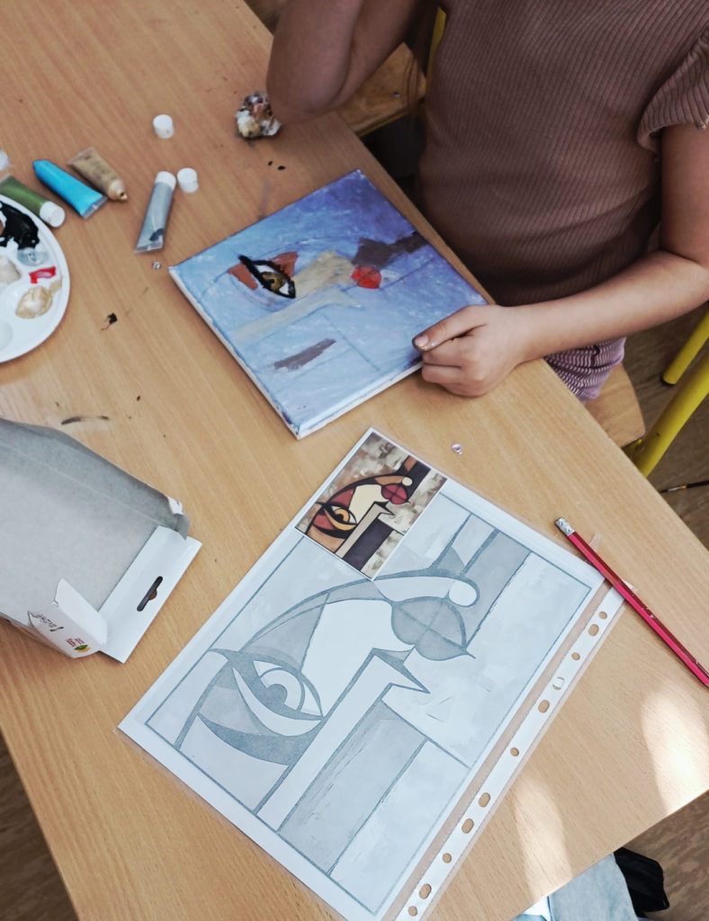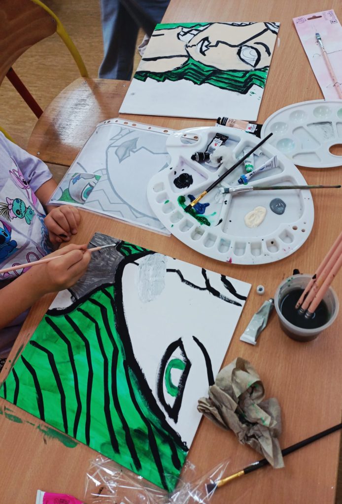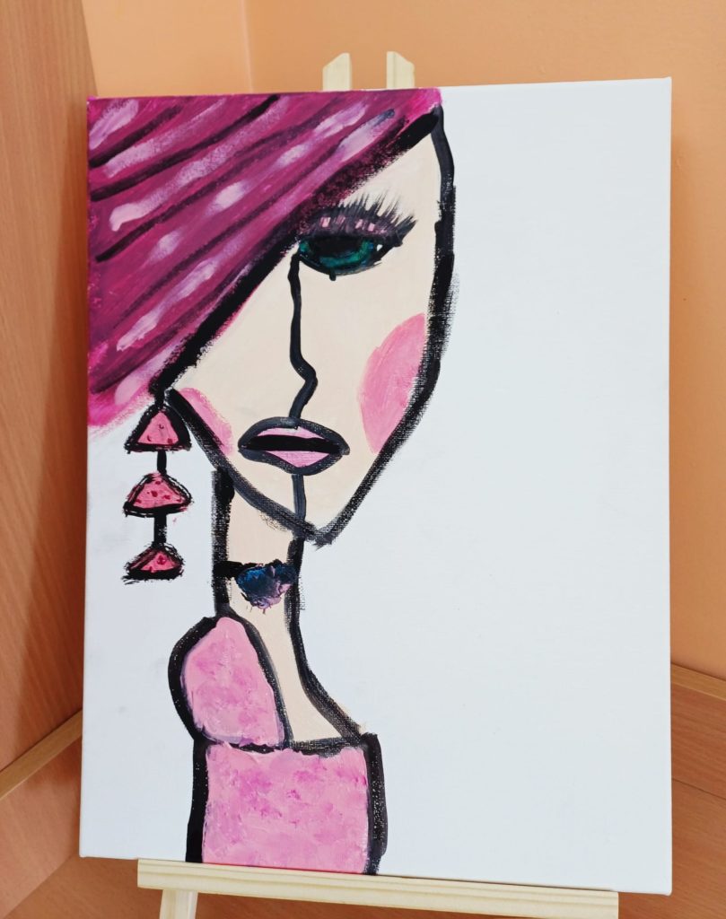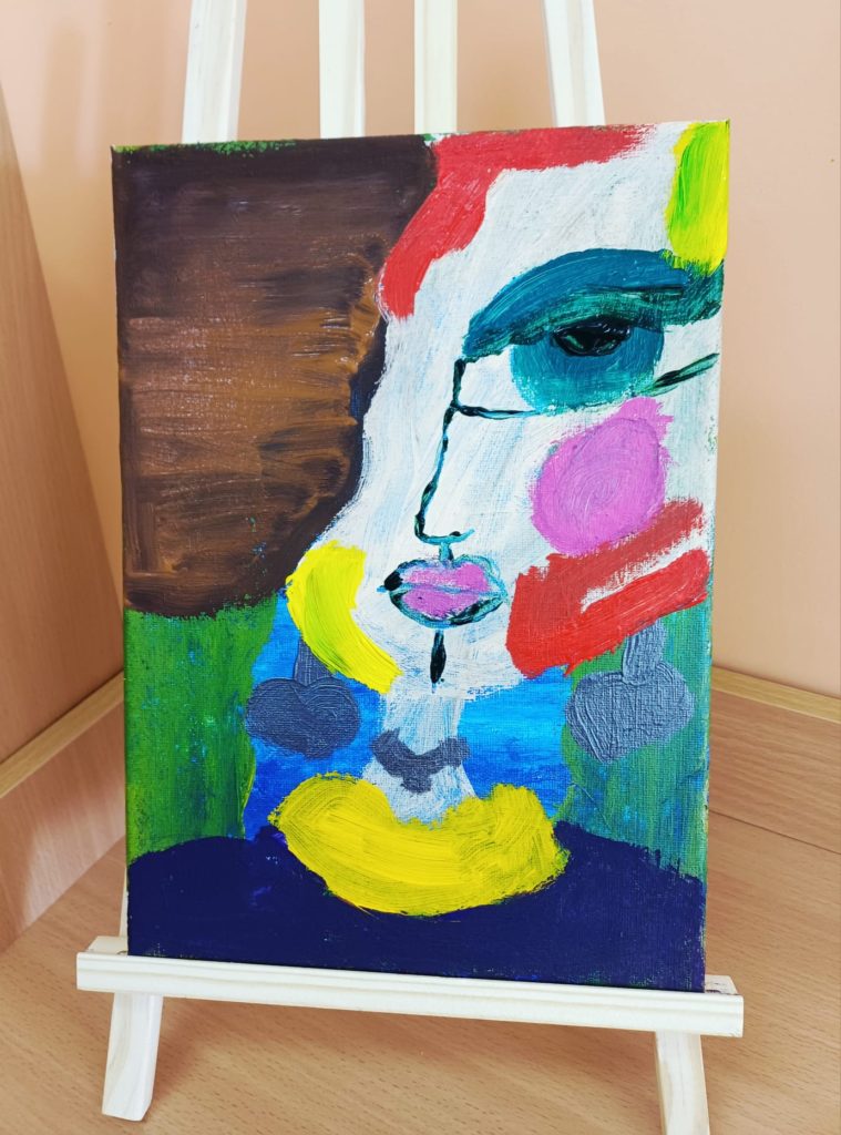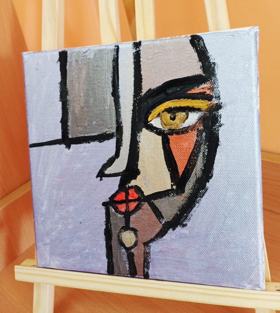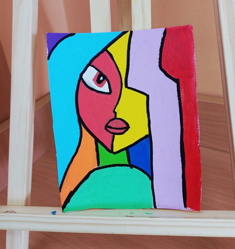 Podczas zajęć kółka plastycznego uczniowie pracowali nad tematem abstrakcyjnej ekspresji na płótnie. Zadanie polegało na stworzeniu portretów z wykorzystaniem wyrazistego, mocnego obrysu, który nadaje postaciom charakter i podkreśla ich formę.
