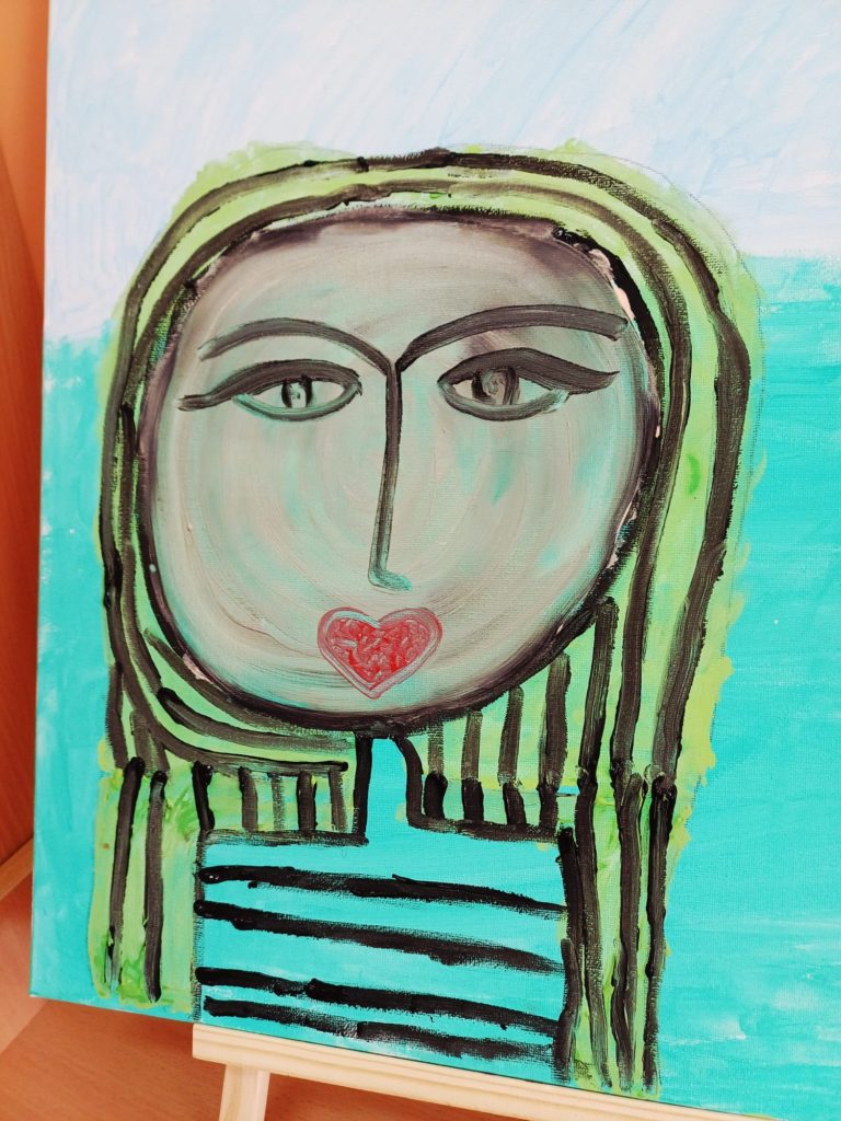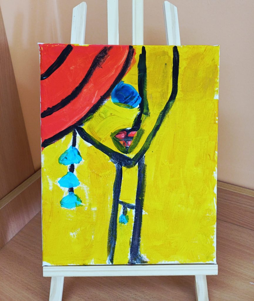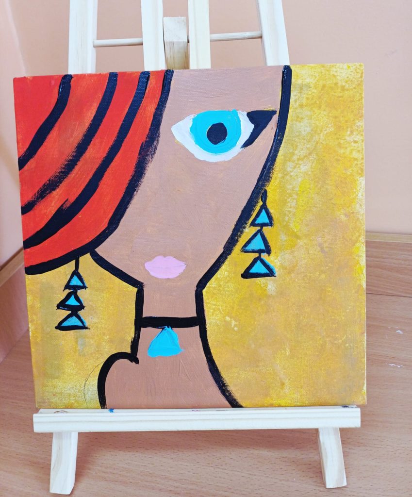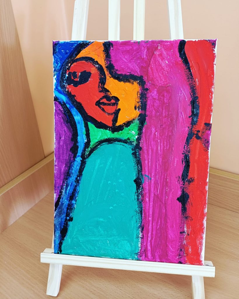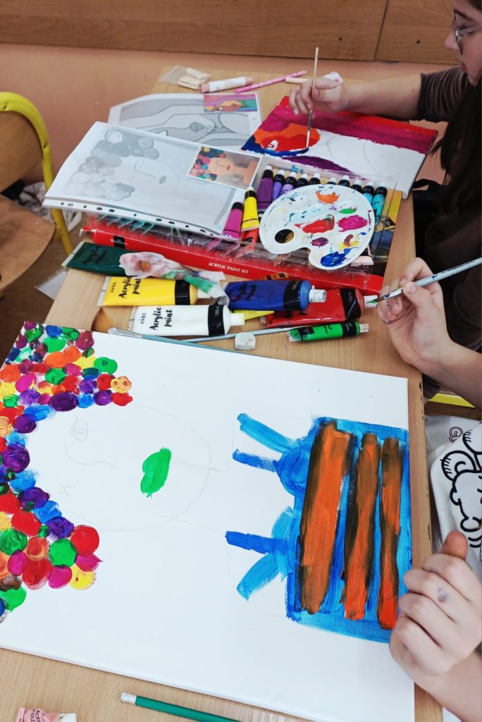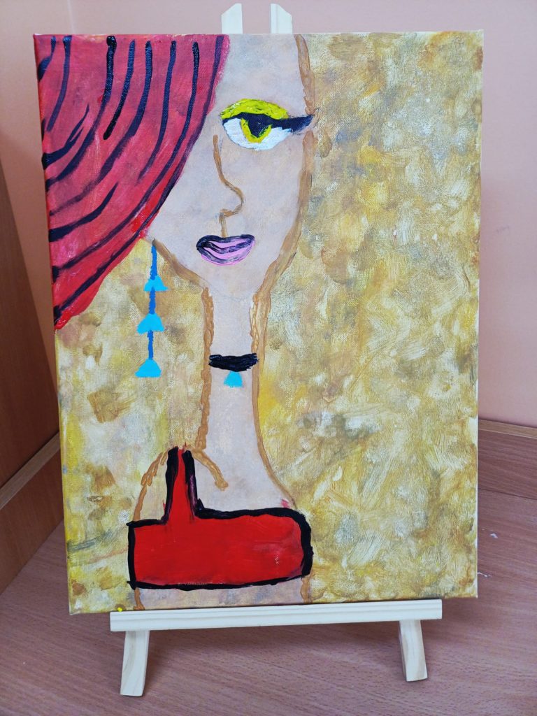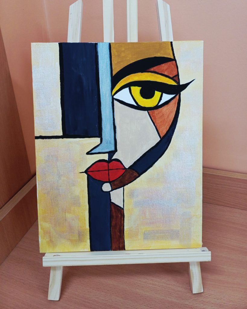 Podczas zajęć kółka plastycznego uczniowie pracowali nad tematem abstrakcyjnej ekspresji na płótnie. Zadanie polegało na stworzeniu portretów z wykorzystaniem wyrazistego, mocnego obrysu, który nadaje postaciom charakter i podkreśla ich formę.