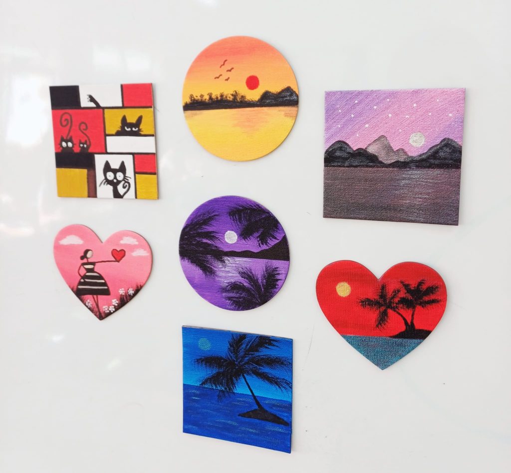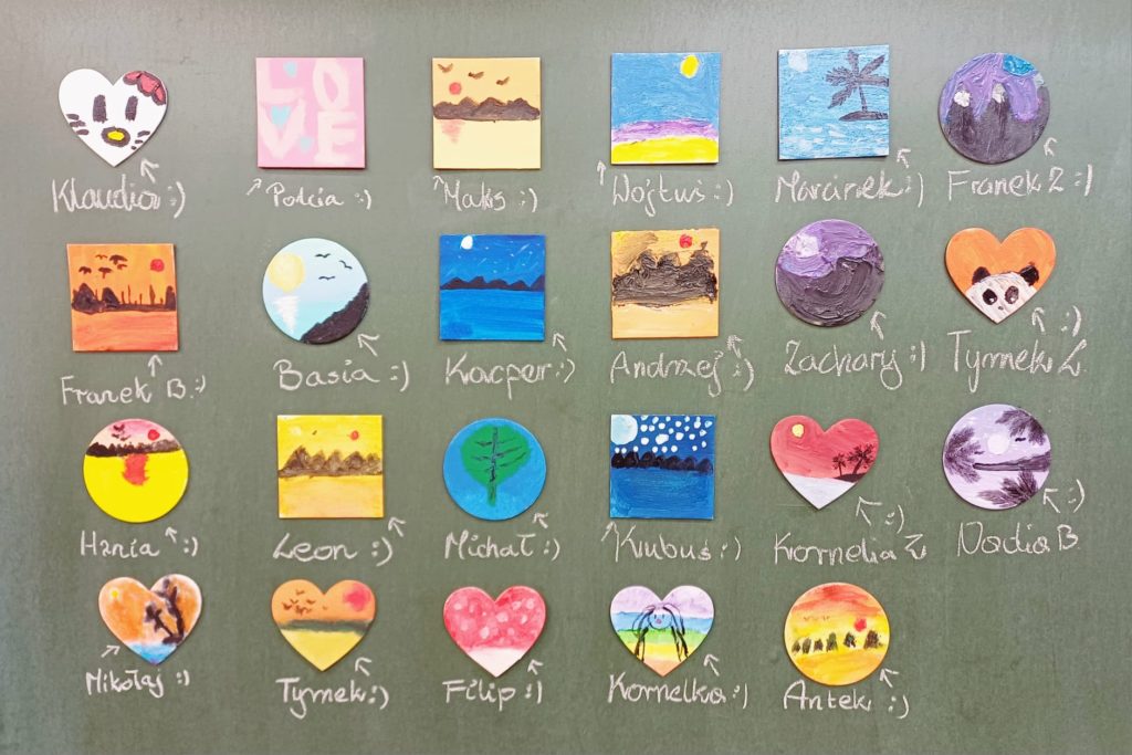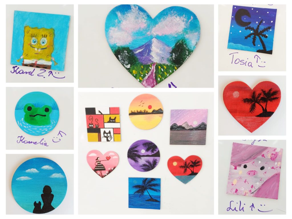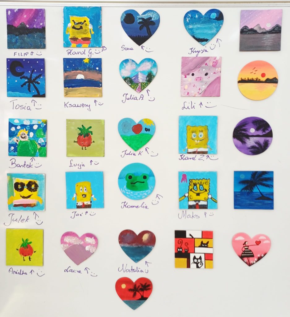 Uczniowie klasy 2b i 3a podczas lekcji plastyki wykazali się ogromną kreatywnością, tworząc niepowtarzalne magnesy na lodówkę. Prace powstały na małych płótnach, które następnie zostały starannie pomalowane farbami.